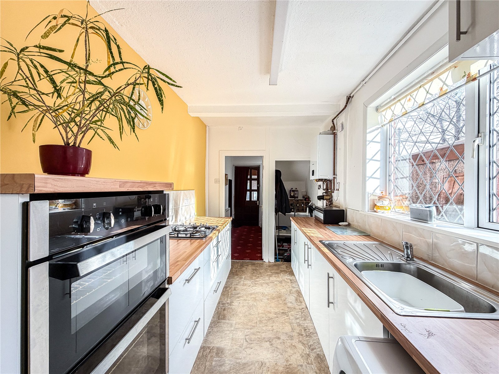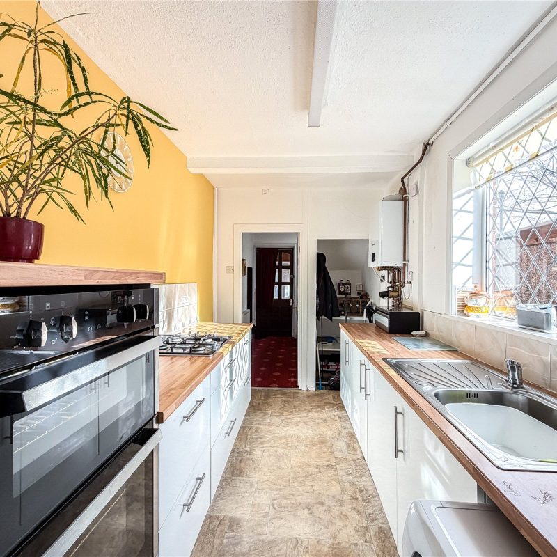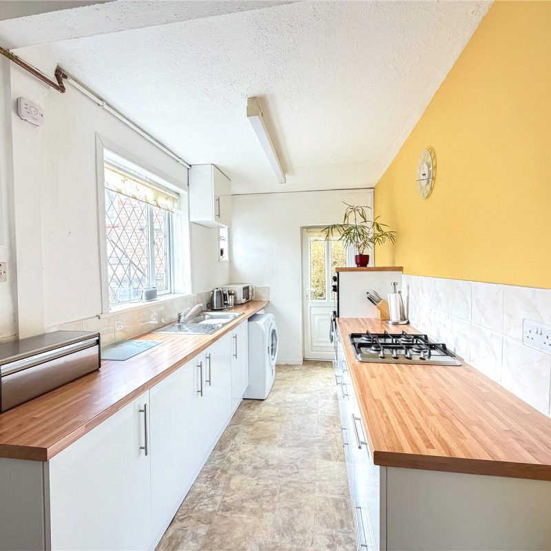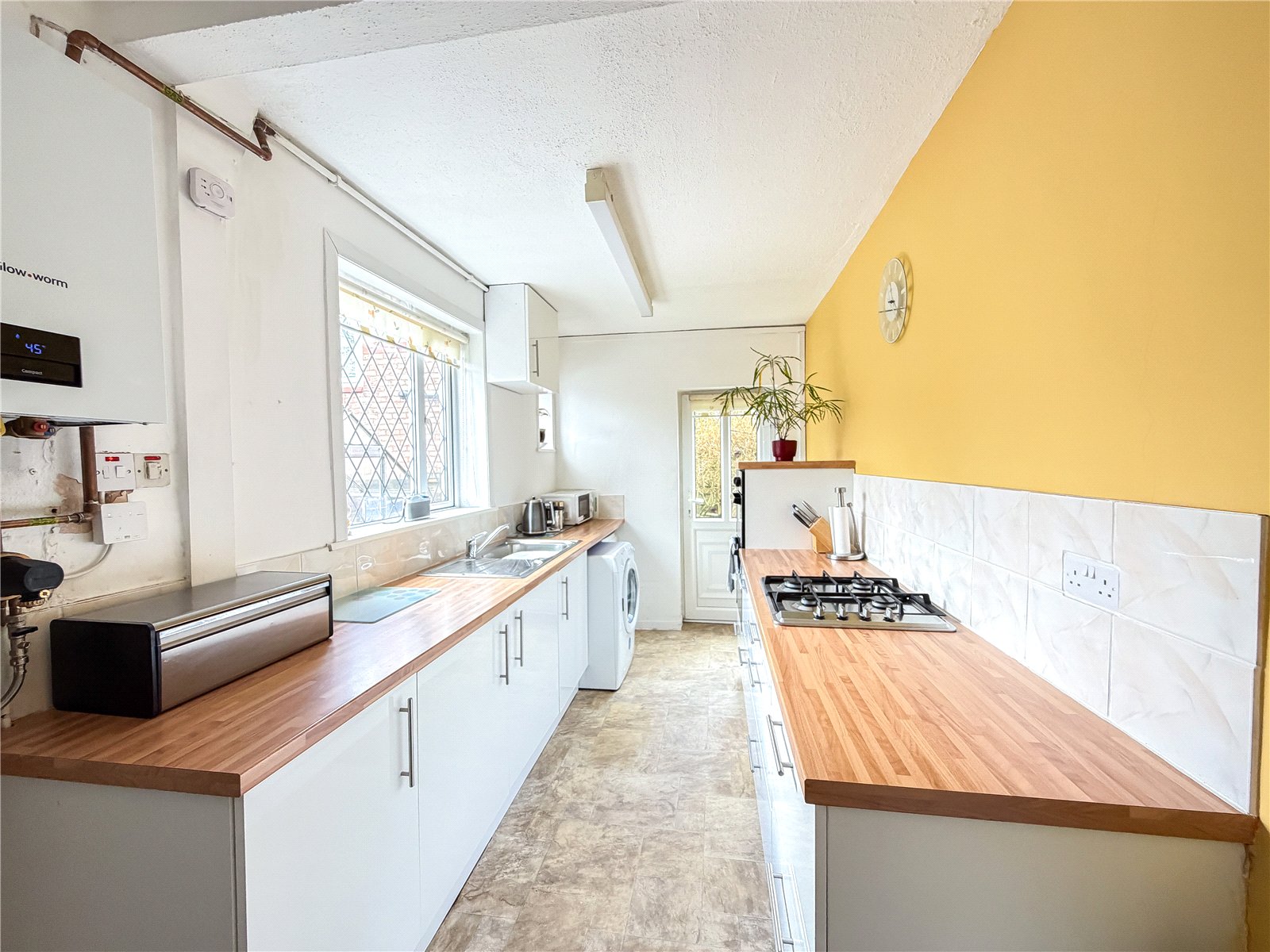 The kitchen is fitted with selection of modern base and wall units, complimented by wood effect tops and integrated appliances. There is a useful understairs pantry. A courtesy door provides access out to the garden.
