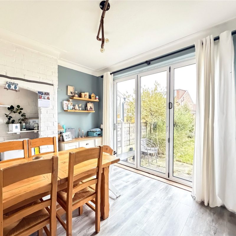 Opening from the hallway is the bright and spacious living room with corniced ceilings and large bay window overlooking the front of the property. A door from the living room, leads through to the dining room, with double doors out to the garden. Running alongside, the kitchen is fitted with an ample selection of contemporary base and wall units, with space for white goods. Accessed through the kitchen is a useful pantry area. A door from the kitchen opens out to the garden.