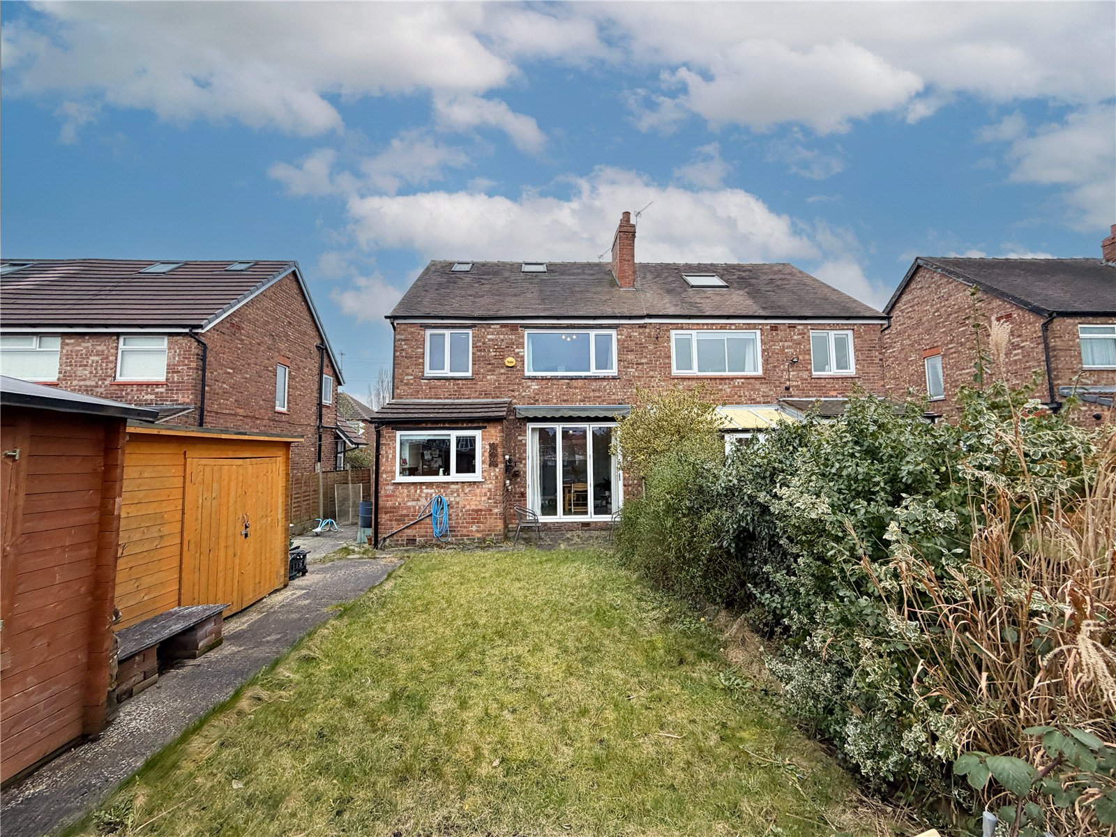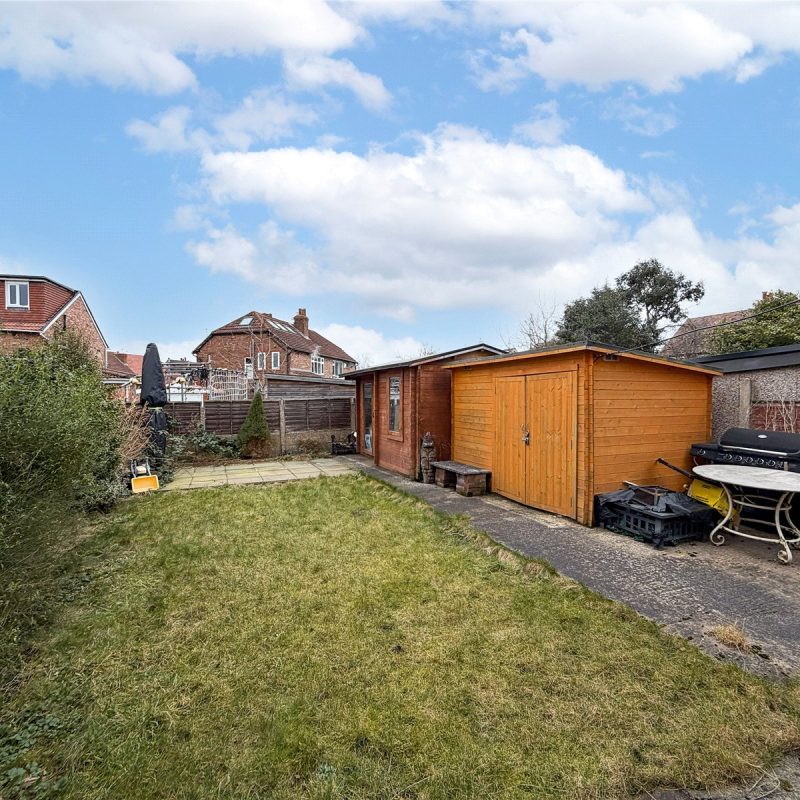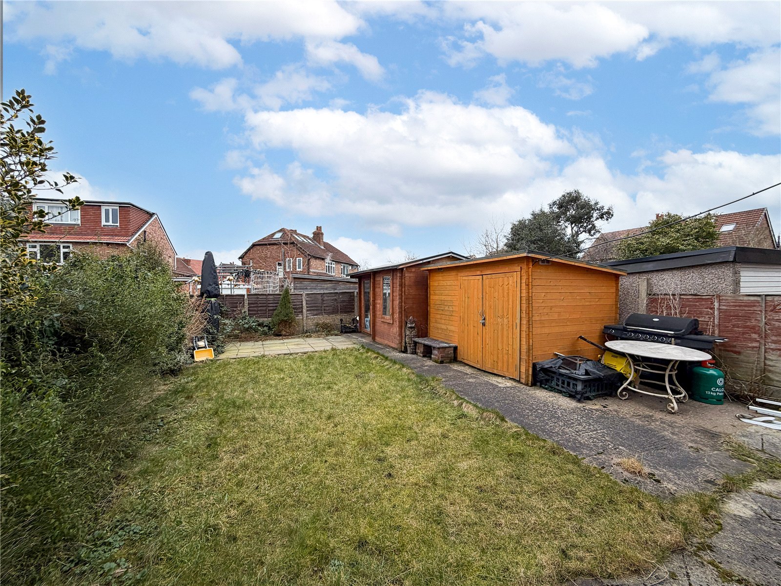 The property is approached via the block paved driveway with an area of garden frontage. Double gates to the side of the property provide access through to the enclosed garden, mainly laid to lawn, with a concrete patio area, and two outdoor wood outbuildings.