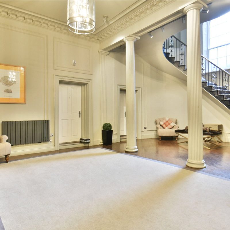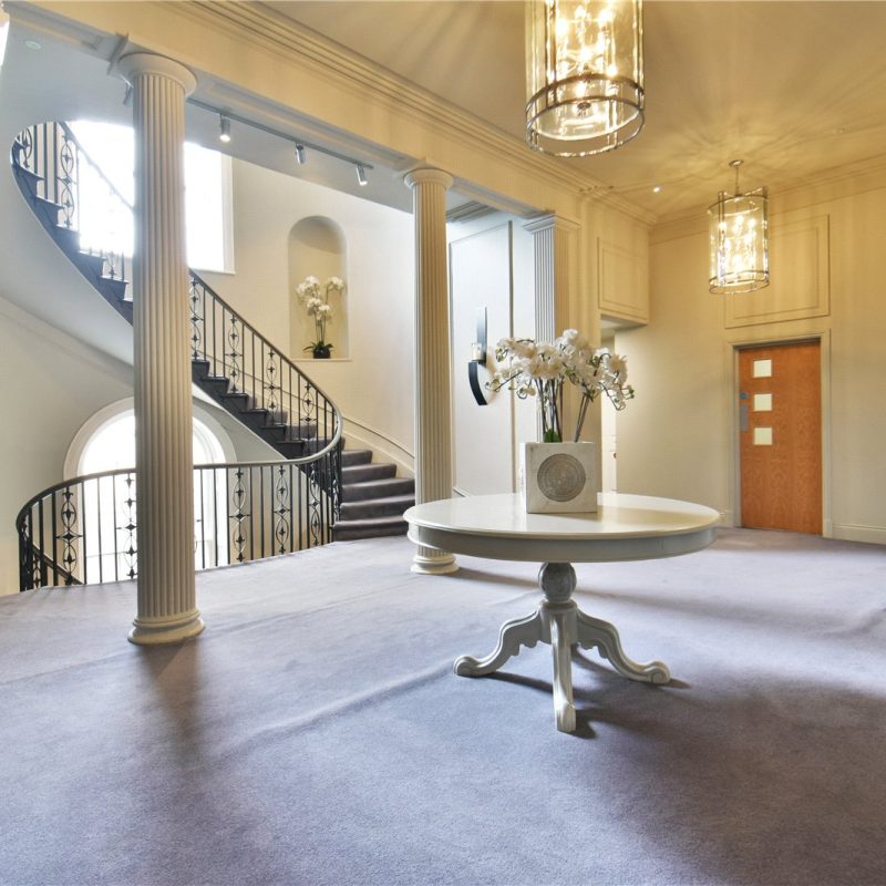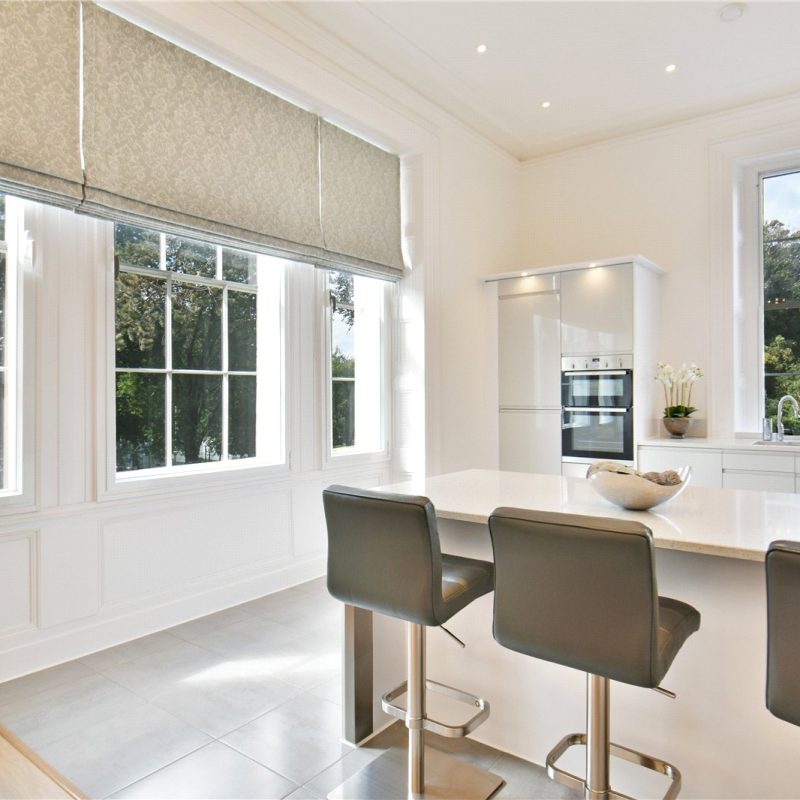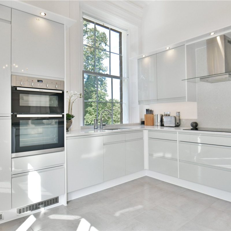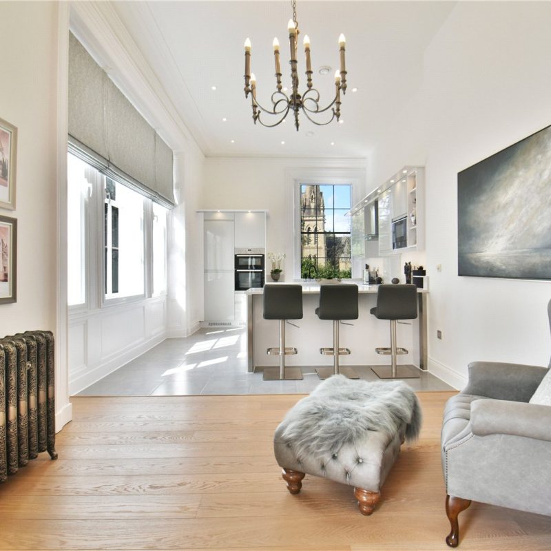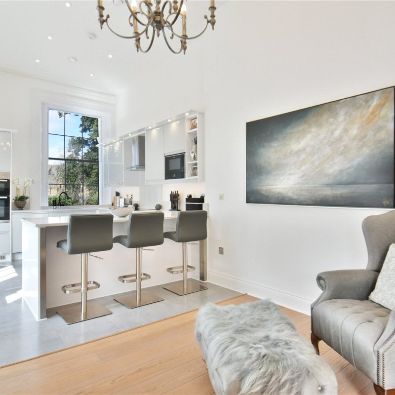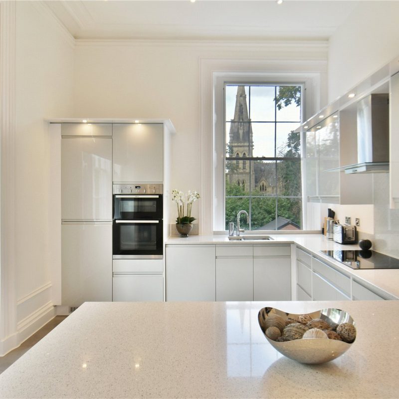 The property is accessed via the beautiful communal reception hall with stair and lift access, leading to the private entrance. Internally, a spacious hallway introduces the impressive open-plan living, dining, and kitchen area. Bathed in natural light from five grand windows, the vast living/dining space offers flexibility for entertaining and everyday living. The stylish kitchen features contemporary matching wall and base units, quality integrated appliances, elegant work surfaces, and a central breakfast bar.
