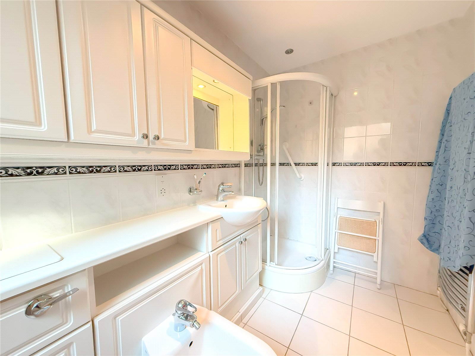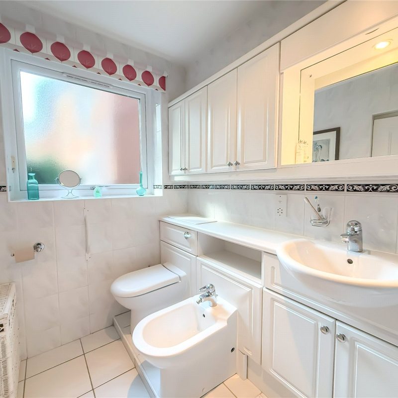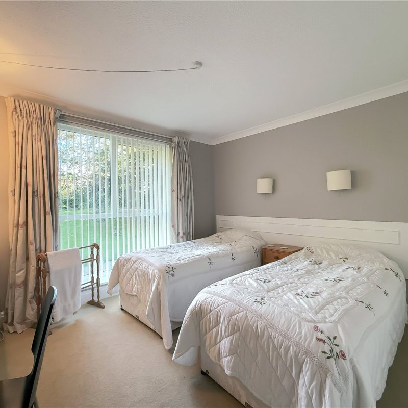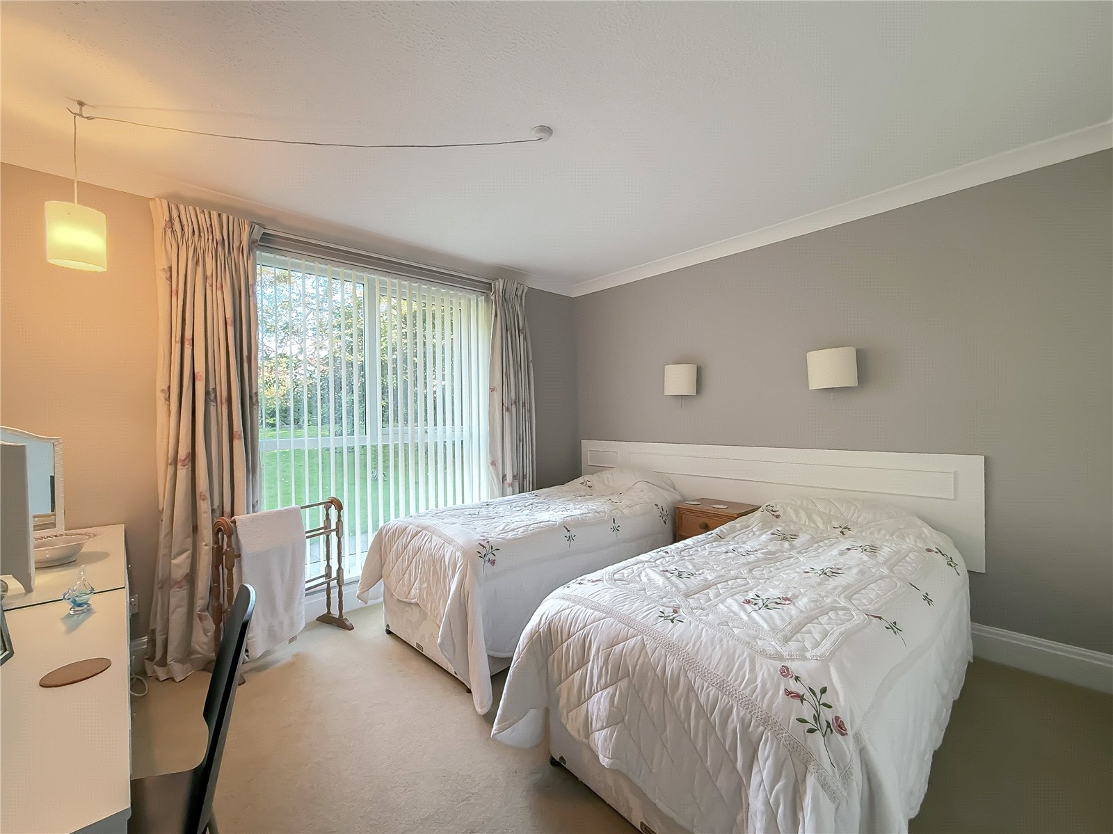 There are two generously proportioned double bedrooms, both featuring bespoke fitted wardrobes, with the principal bedroom also benefitting from an en-suite shower room. There is a third double bedroom, accessed via the living room, with a large window overlooking the gardens.