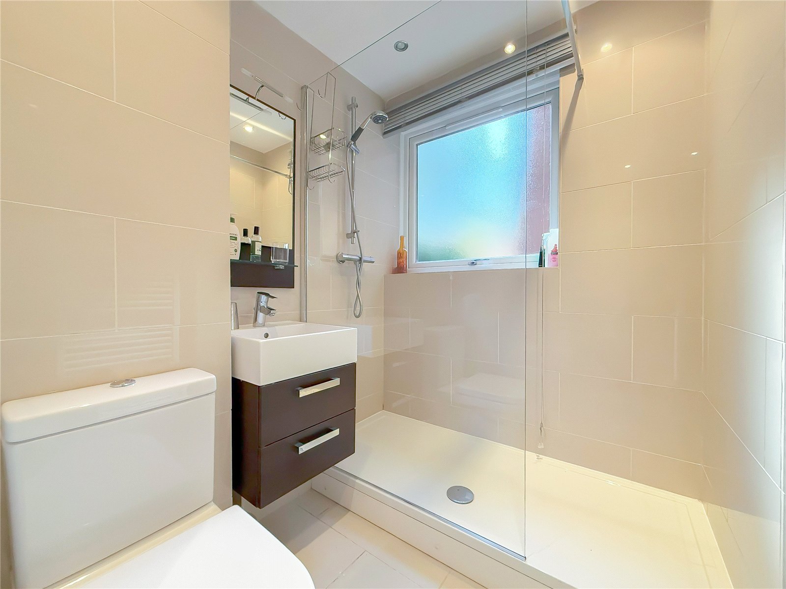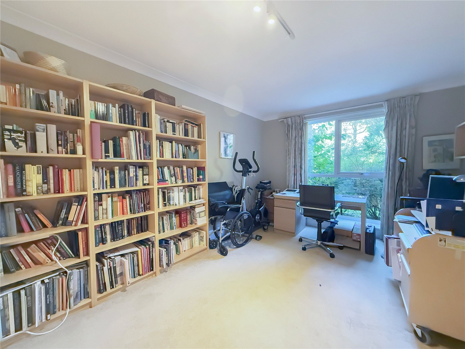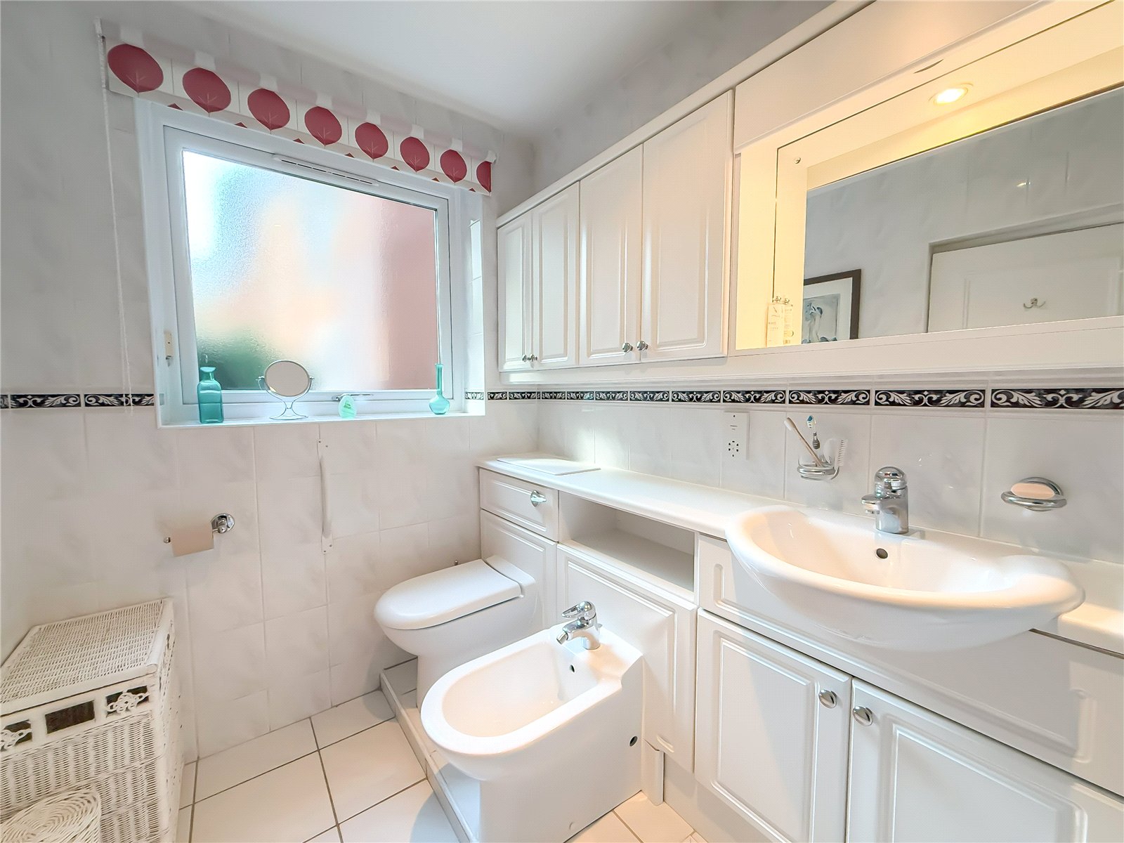There are two generously proportioned double bedrooms, both featuring bespoke fitted wardrobes, with the principal bedroom also benefitting from an en-suite shower room. There is a third double bedroom, accessed via the living room, with a large window overlooking the gardens.