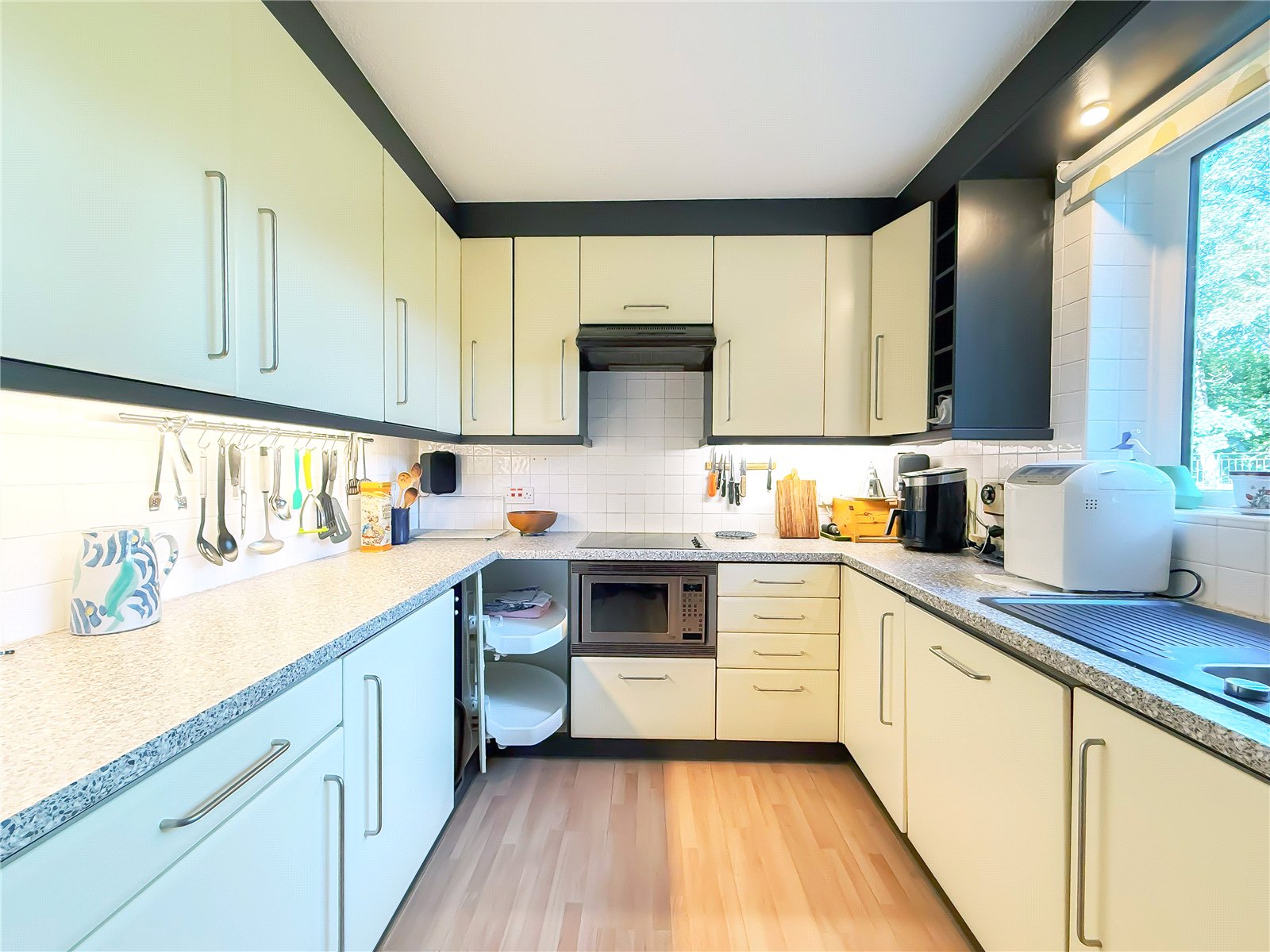 The separate kitchen is well-appointed with an extensive range of wall and base units, complemented by wooden tops.