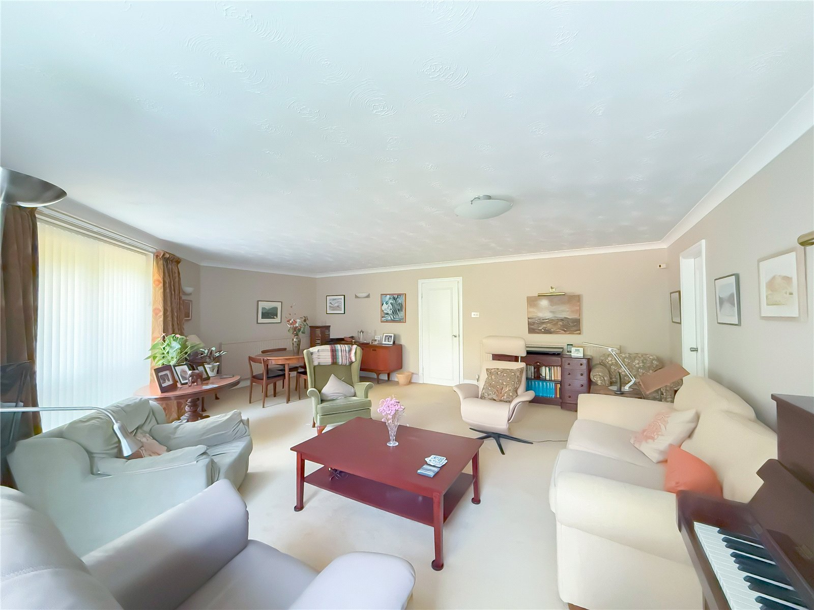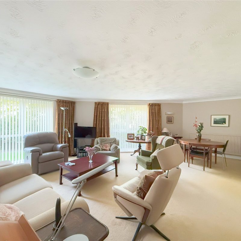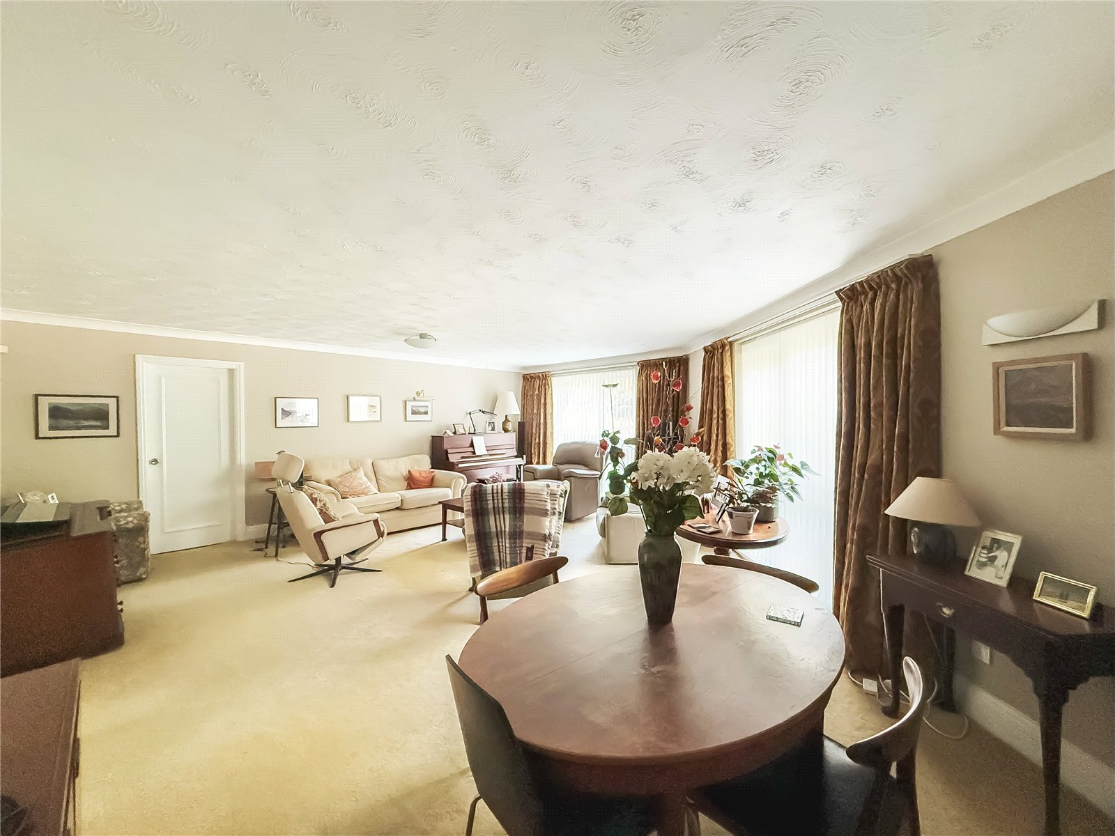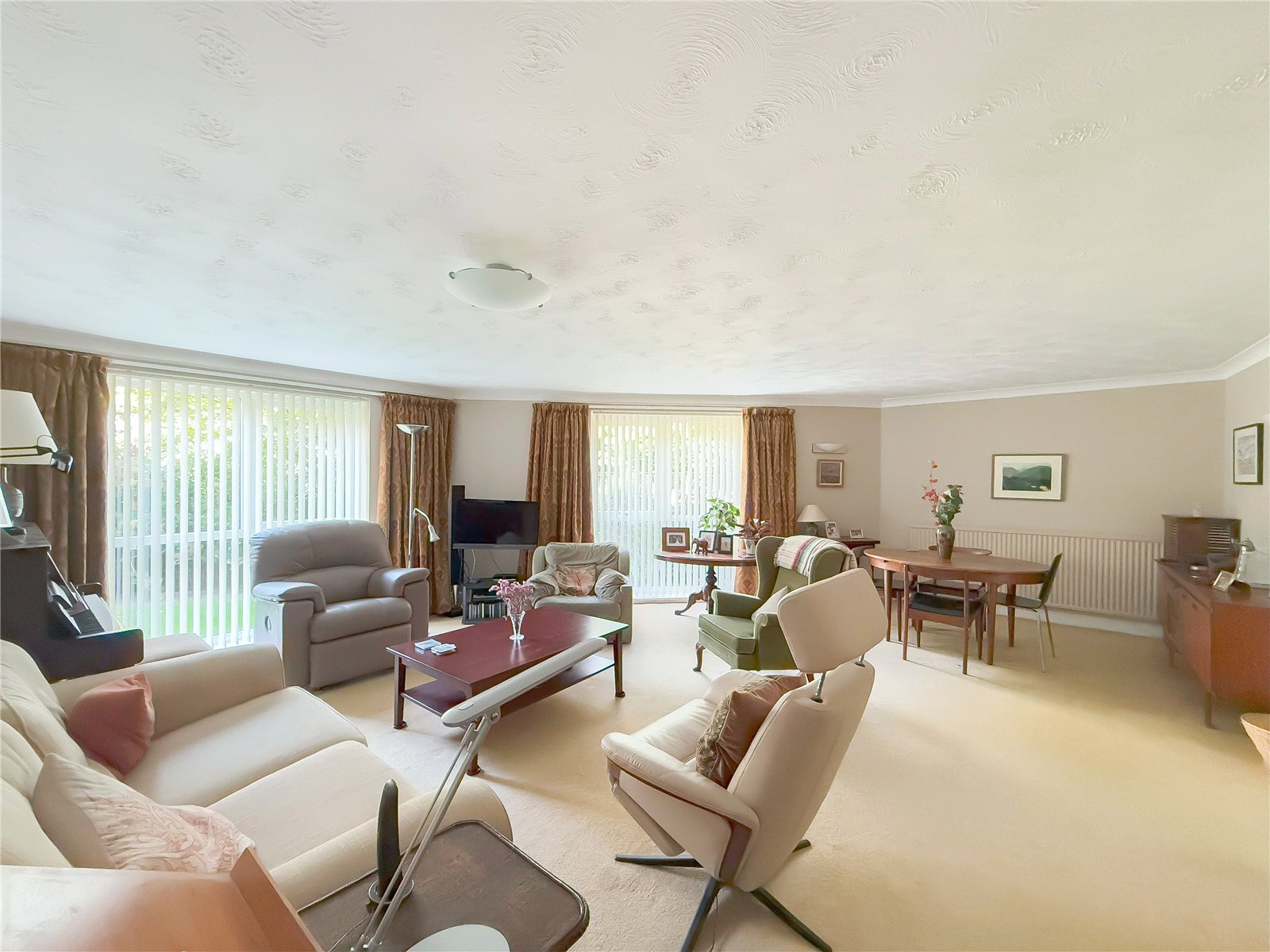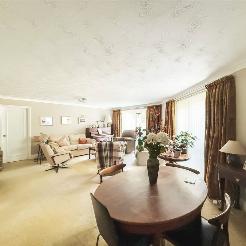 A spacious open plan living and dining room filled with natural light from two large picture windows with views over the beautifully landscaped shared gardens.