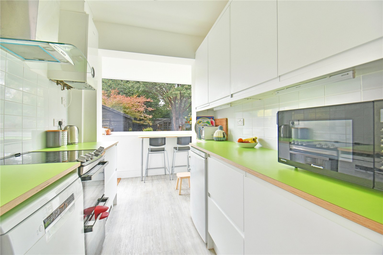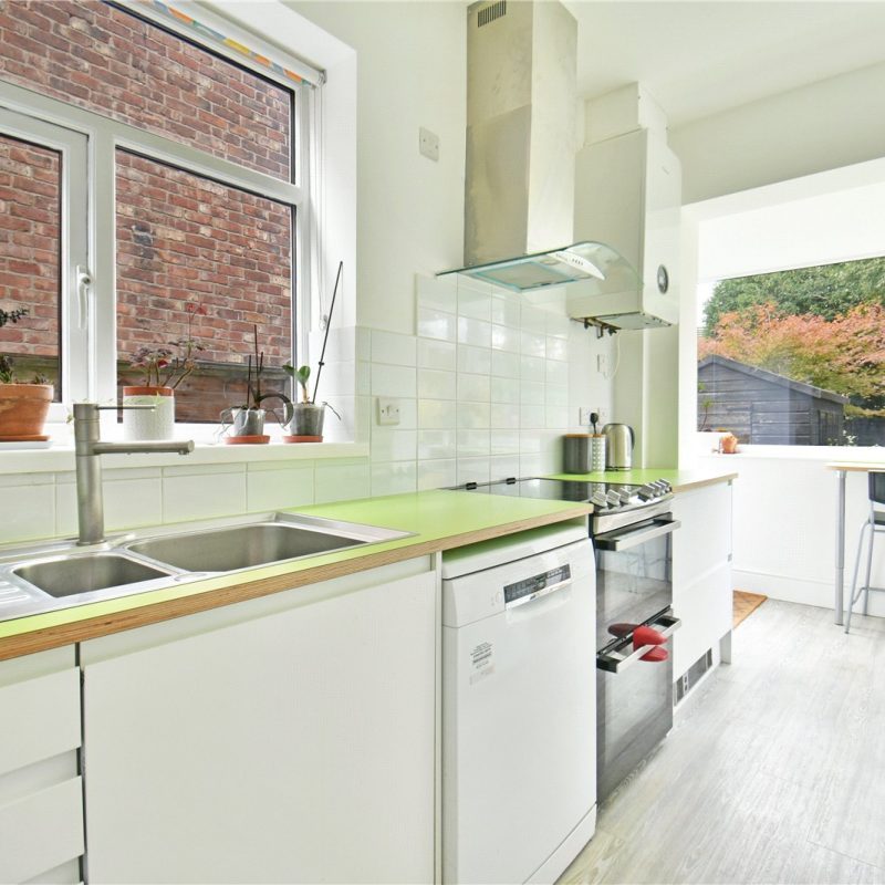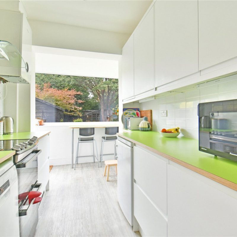 The extended kitchen is fitted with an ample selection of sleek modern units with space for appliances. There is an ideal breakfast area with dual aspect windows, enjoying views out over the attractive garden. A courtesy door provides access to the garden.