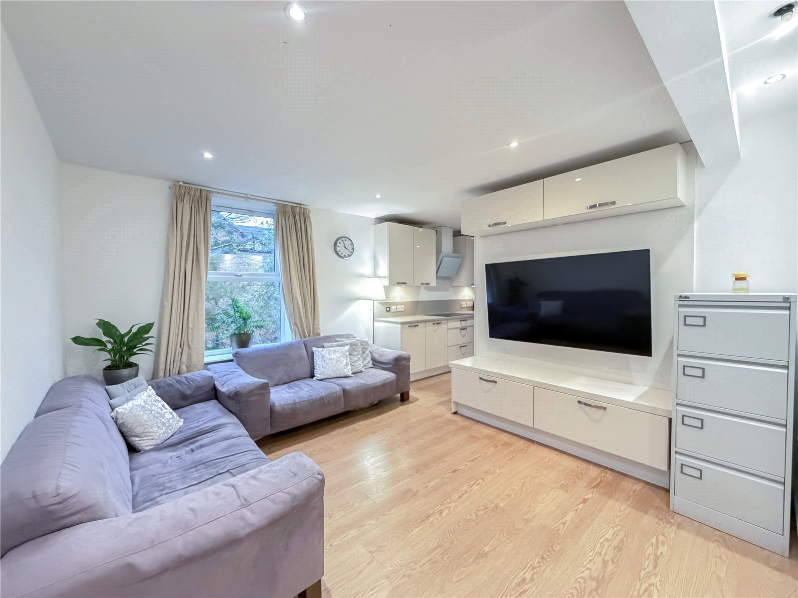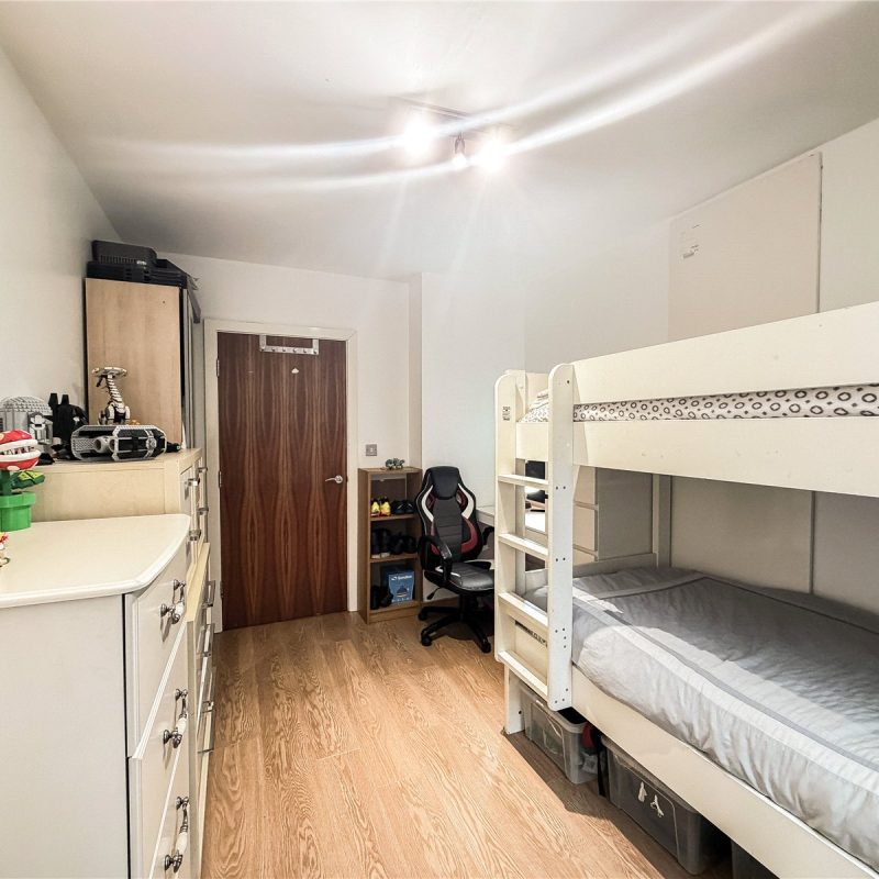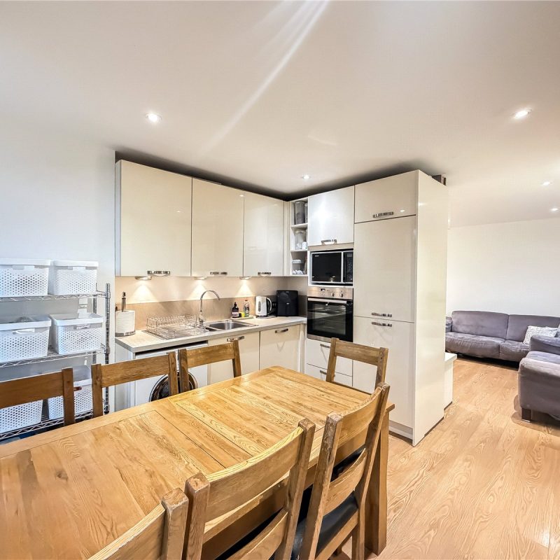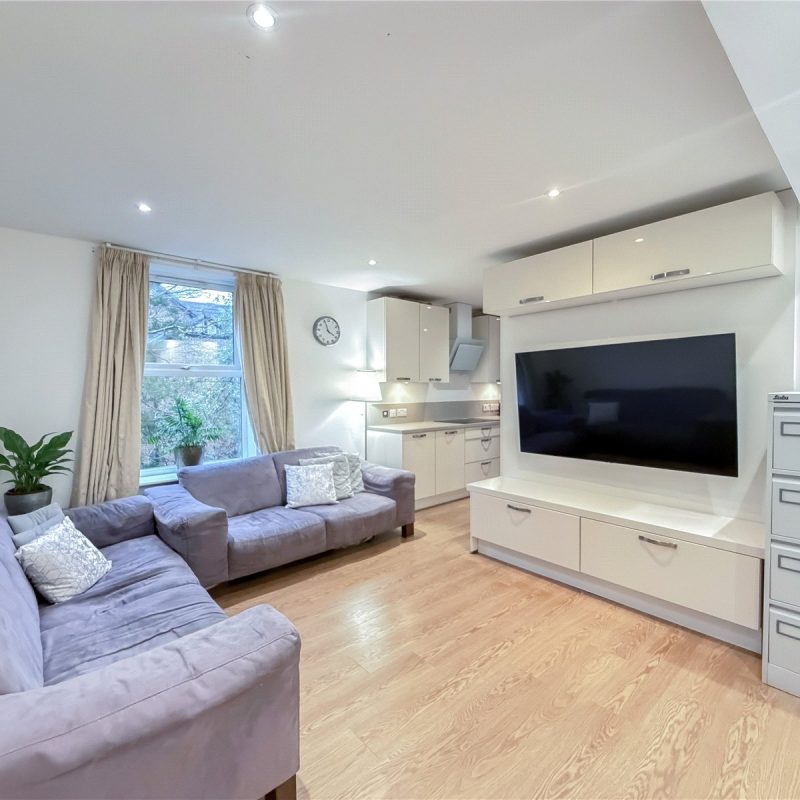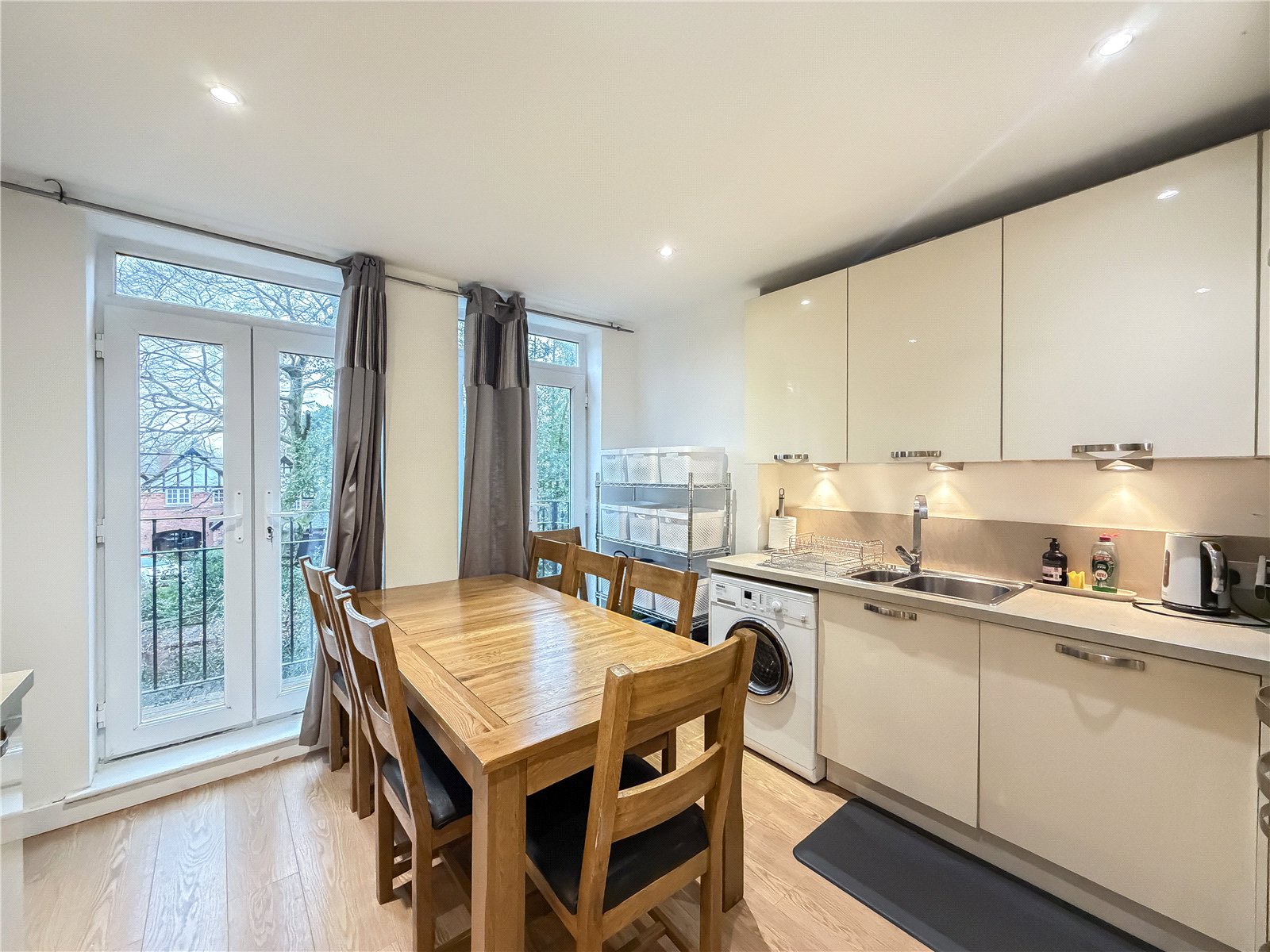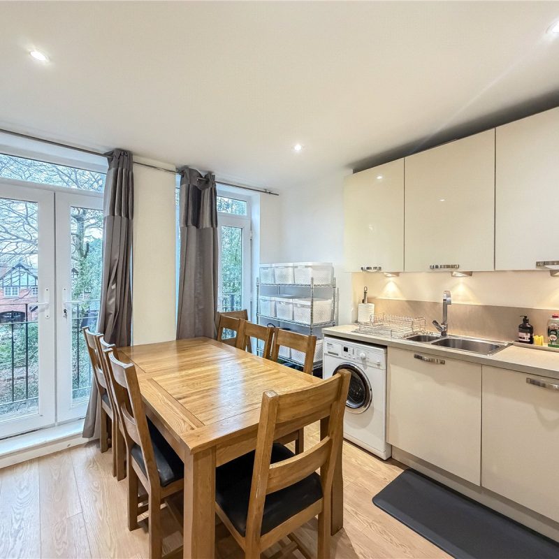 There is a bright and spacious living room with Southerly facing window bathing the room in natural light. An opening leads through to the sleek contemporary kitchen with a selection of base and wall units, complemented by marble effect tops and integrated appliances. There is ample space for a table chairs, providing the perfect spot for informal dining. Dual double doors provide access to the Westerly balcony, with treeline views.