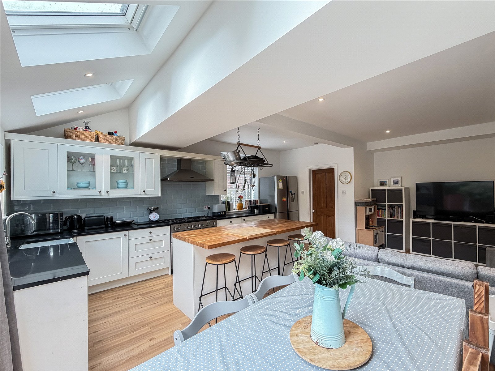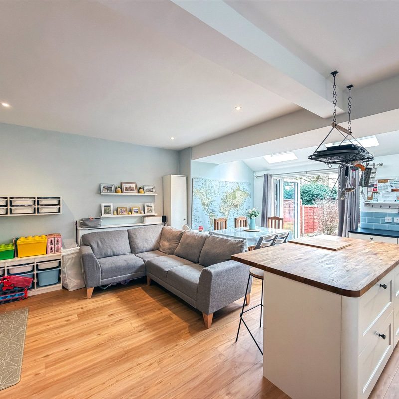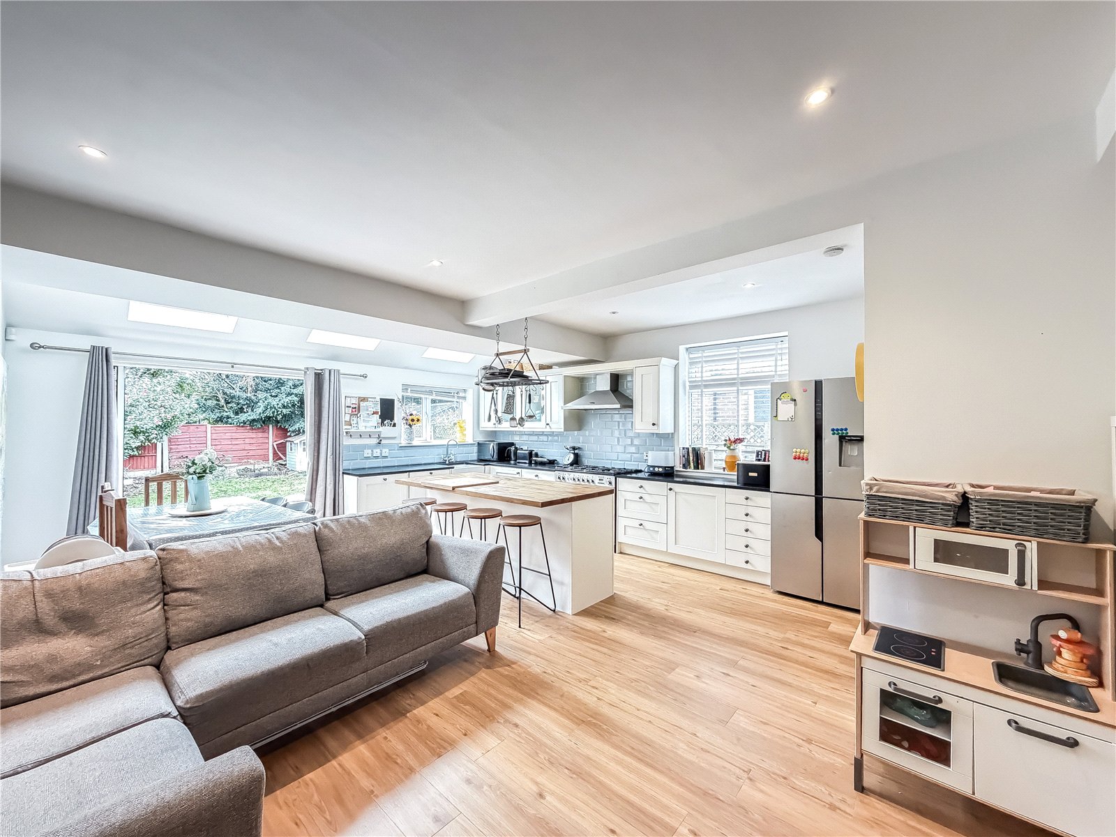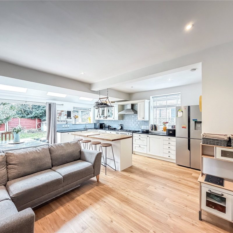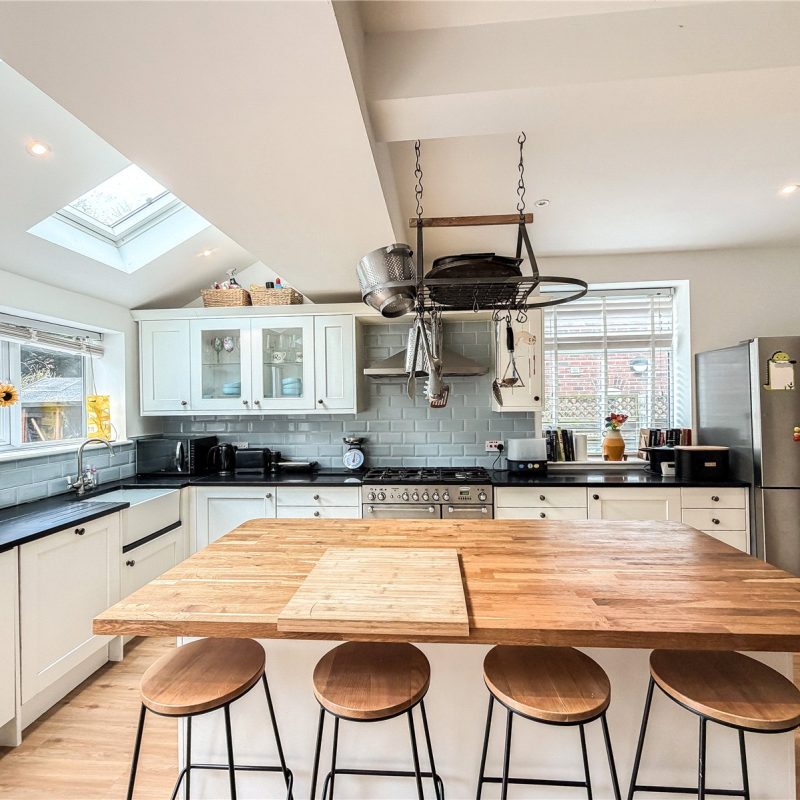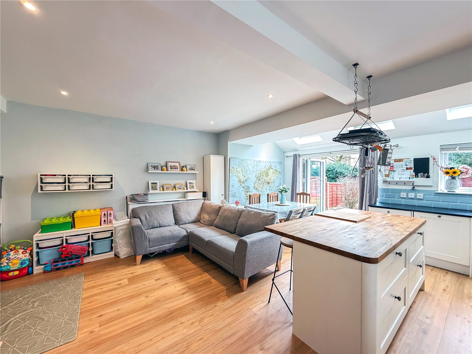 To the rear is the spectacular extended open-plan living kitchen with vaulted ceiling and fitted with a selection of stylish bespoke units with feature central island. The room also offers ample space for a large dining table and chairs and sitting area creating the ideal space for entertaining and day-to-day family living. The room is bathed in natural light from the skylights above and bi-fold doors opening out to the South facing lawned gardens.
