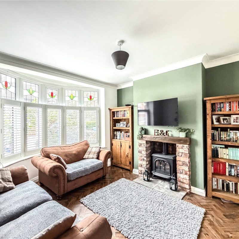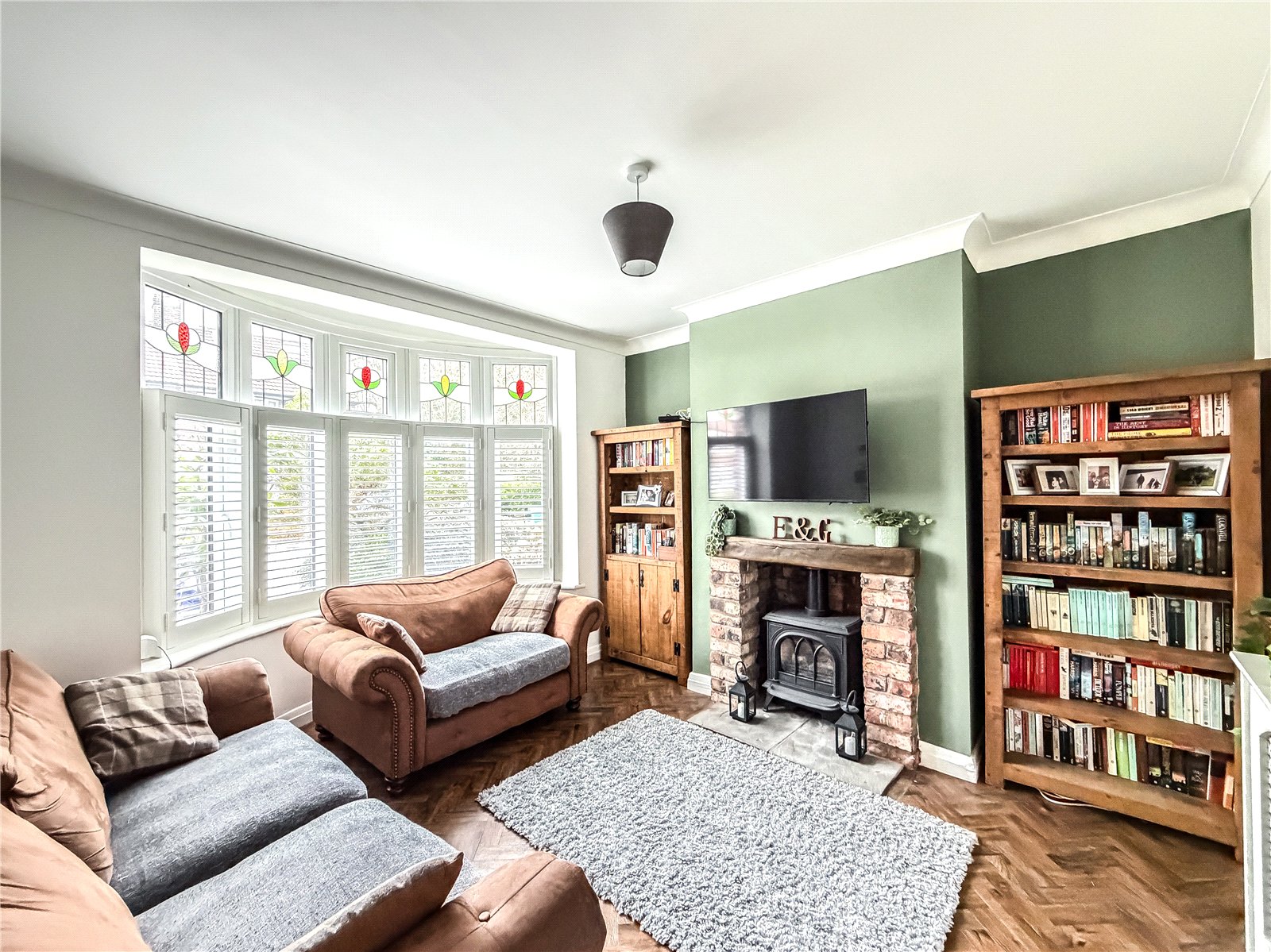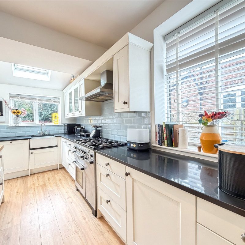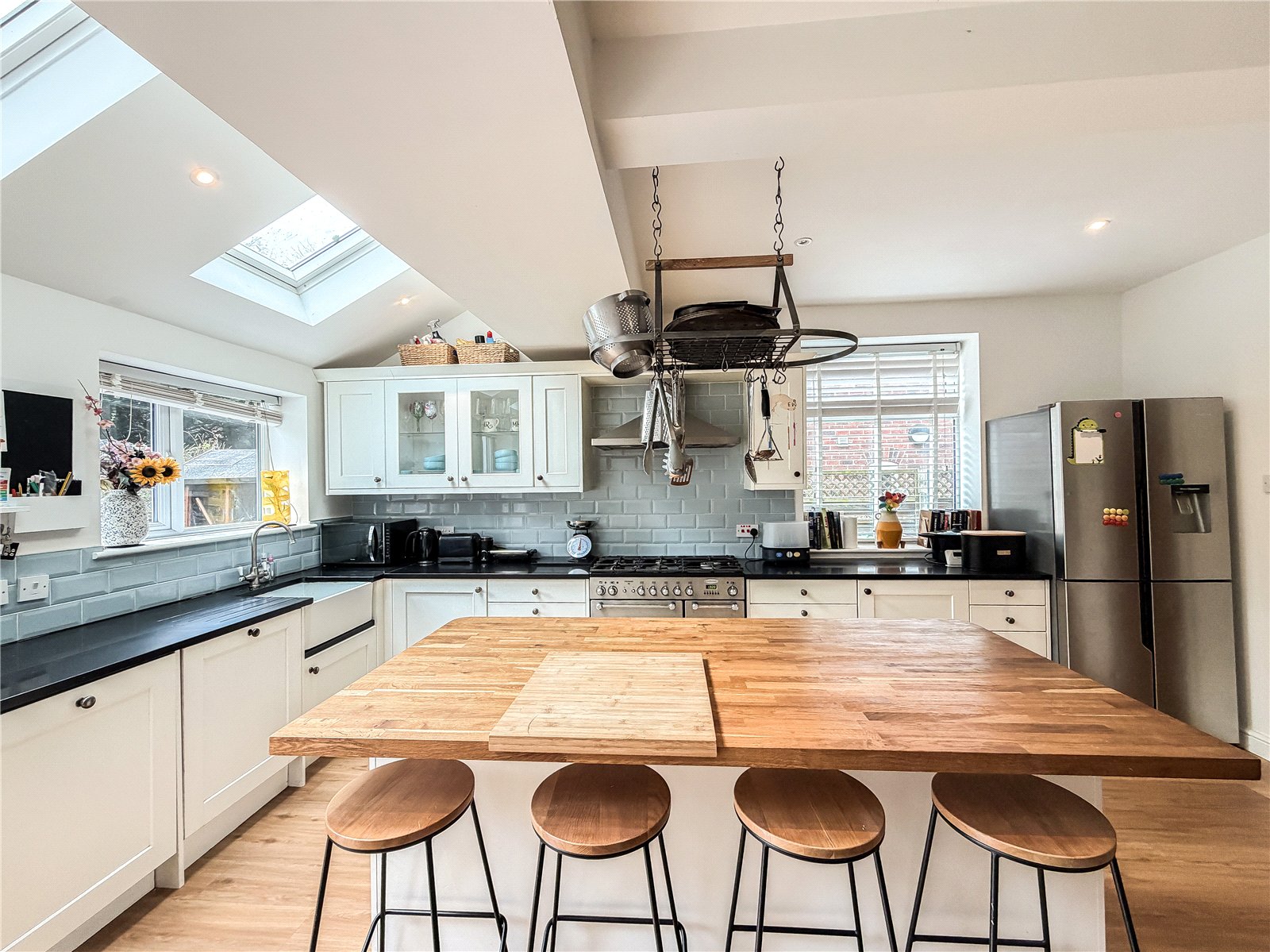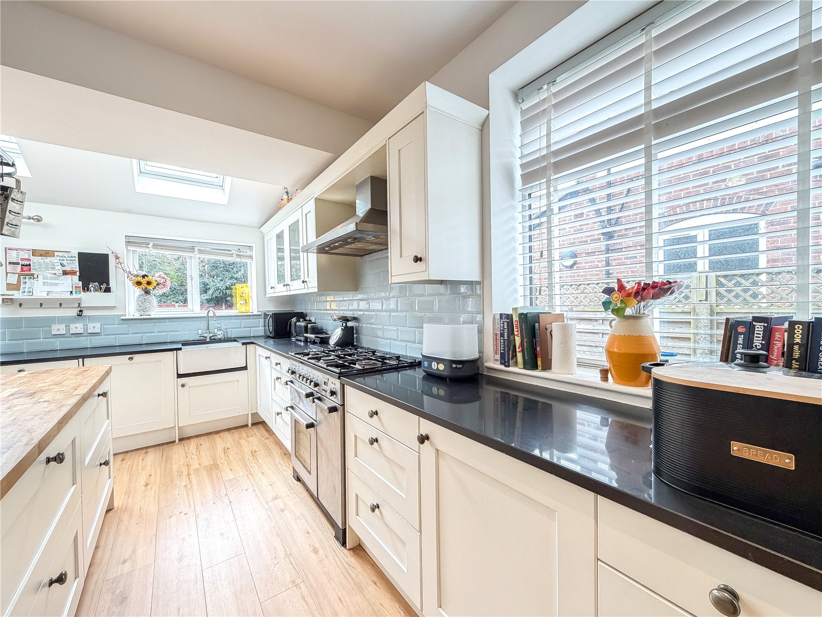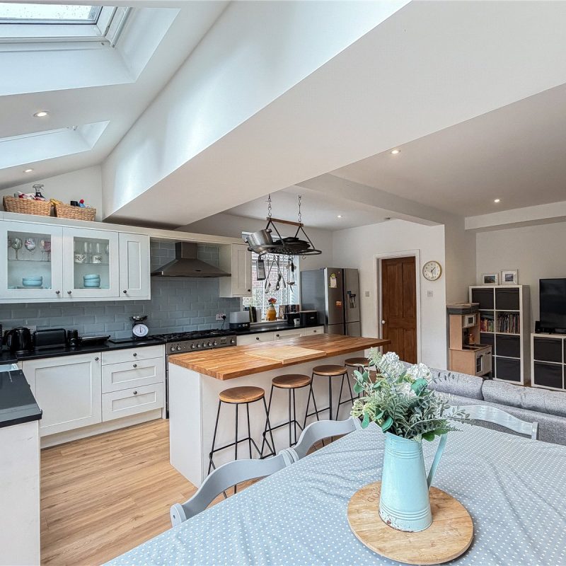 To the rear is the spectacular extended open-plan living kitchen with vaulted ceiling and fitted with a selection of stylish bespoke units with feature central island. The room also offers ample space for a large dining table and chairs and sitting area creating the ideal space for entertaining and day-to-day family living. The room is bathed in natural light from the skylights above and bi-fold doors opening out to the South facing lawned gardens.