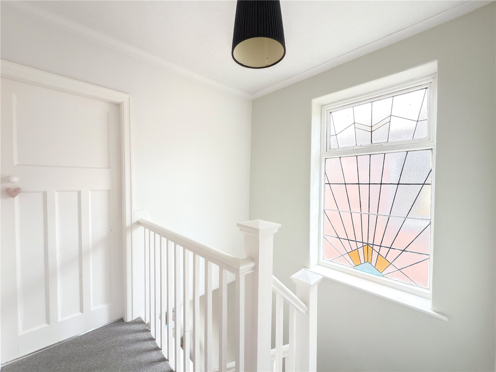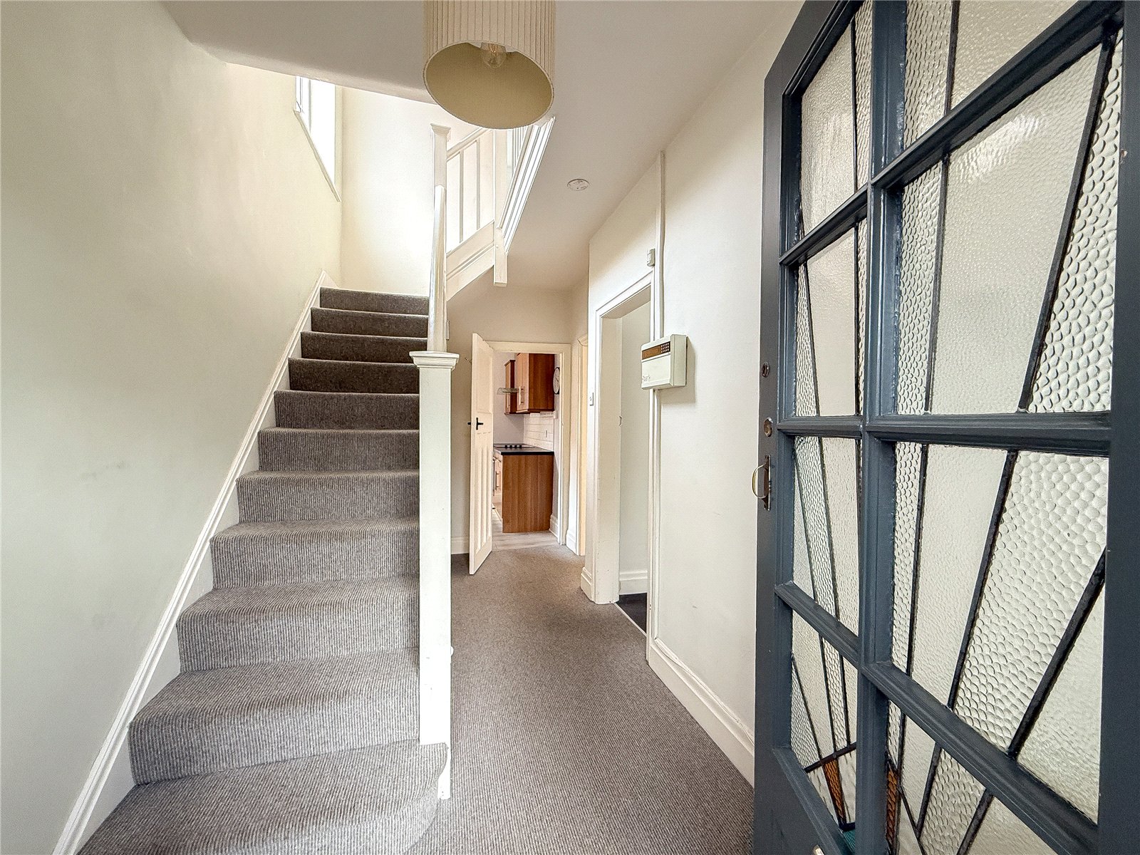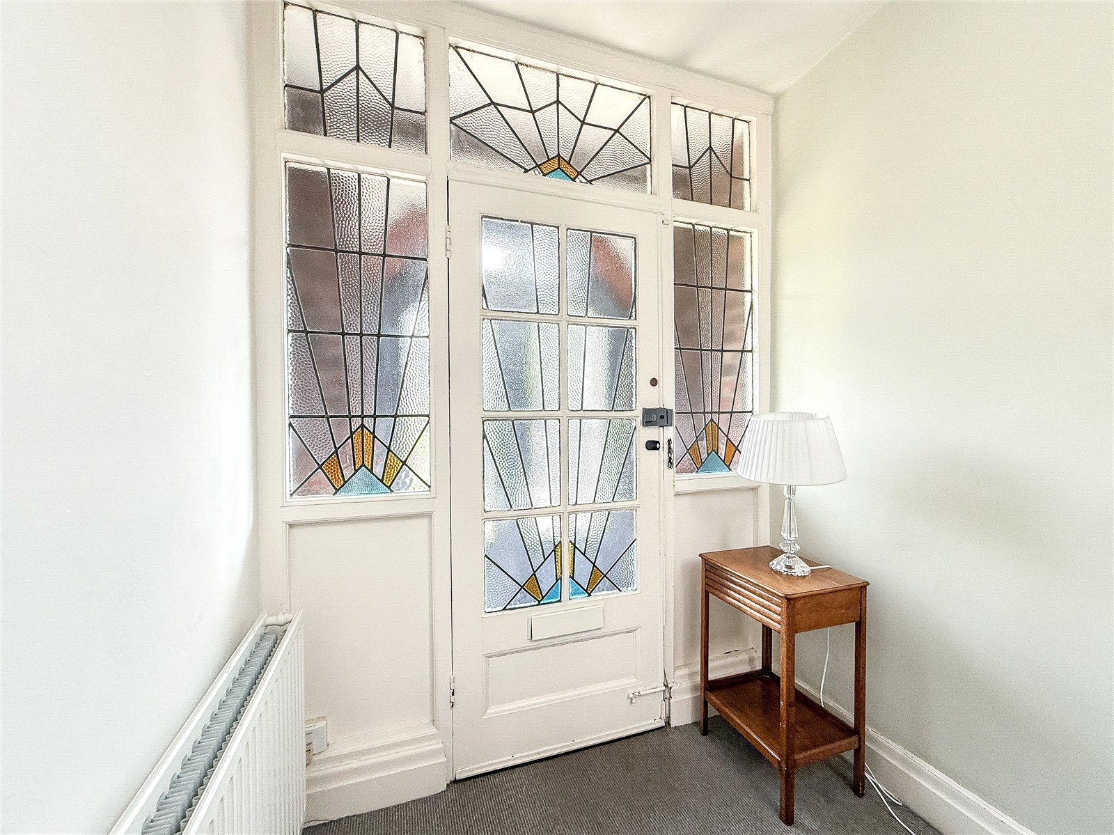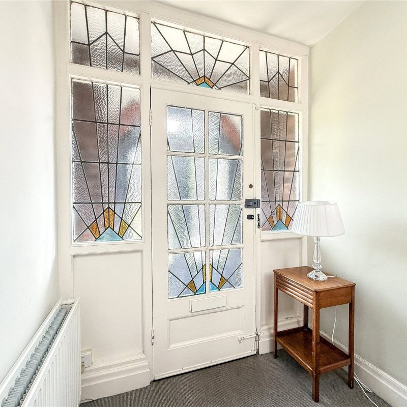 The accommodation comprises of a storm porch opening into the entrance hall with original leaded and stained glass front door and stairs rising to the first floor, with understairs cloak cupboard.