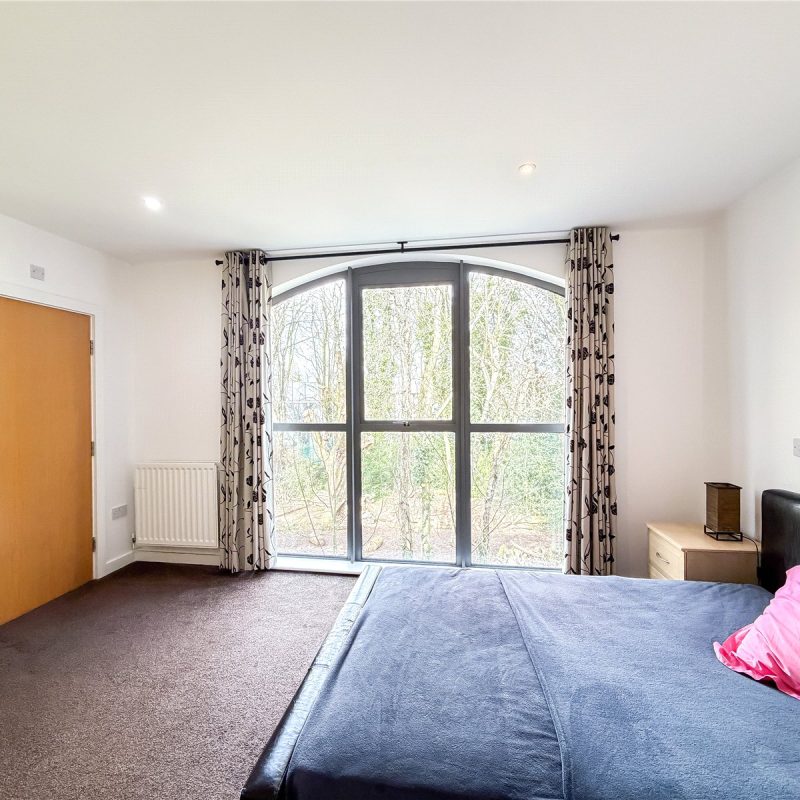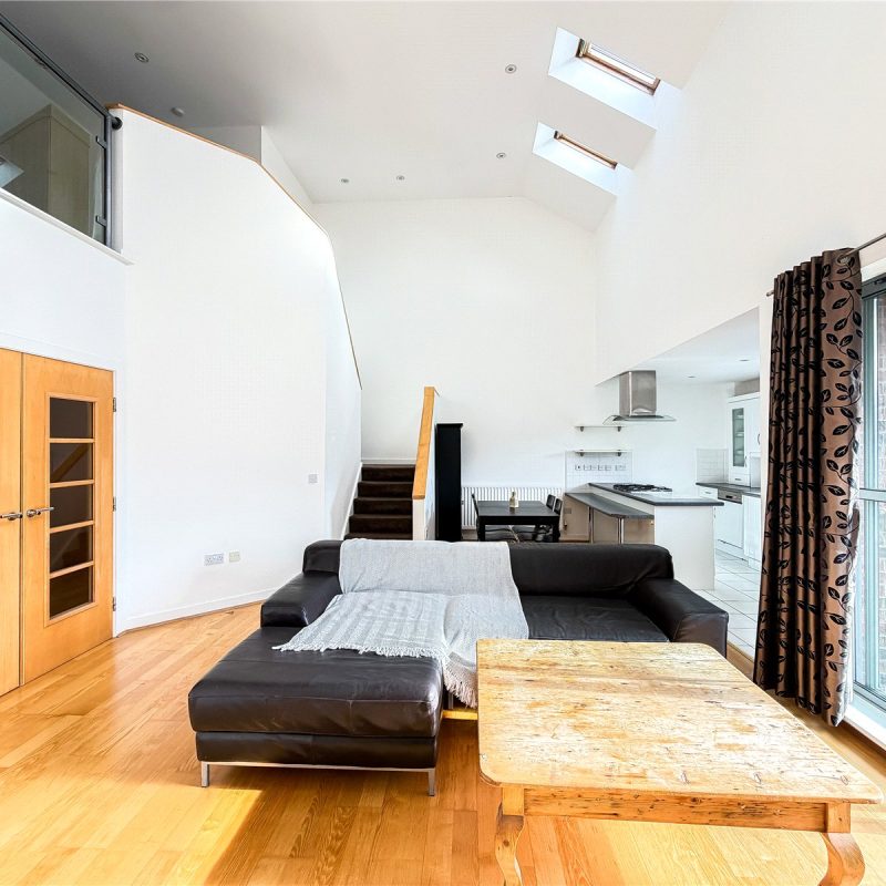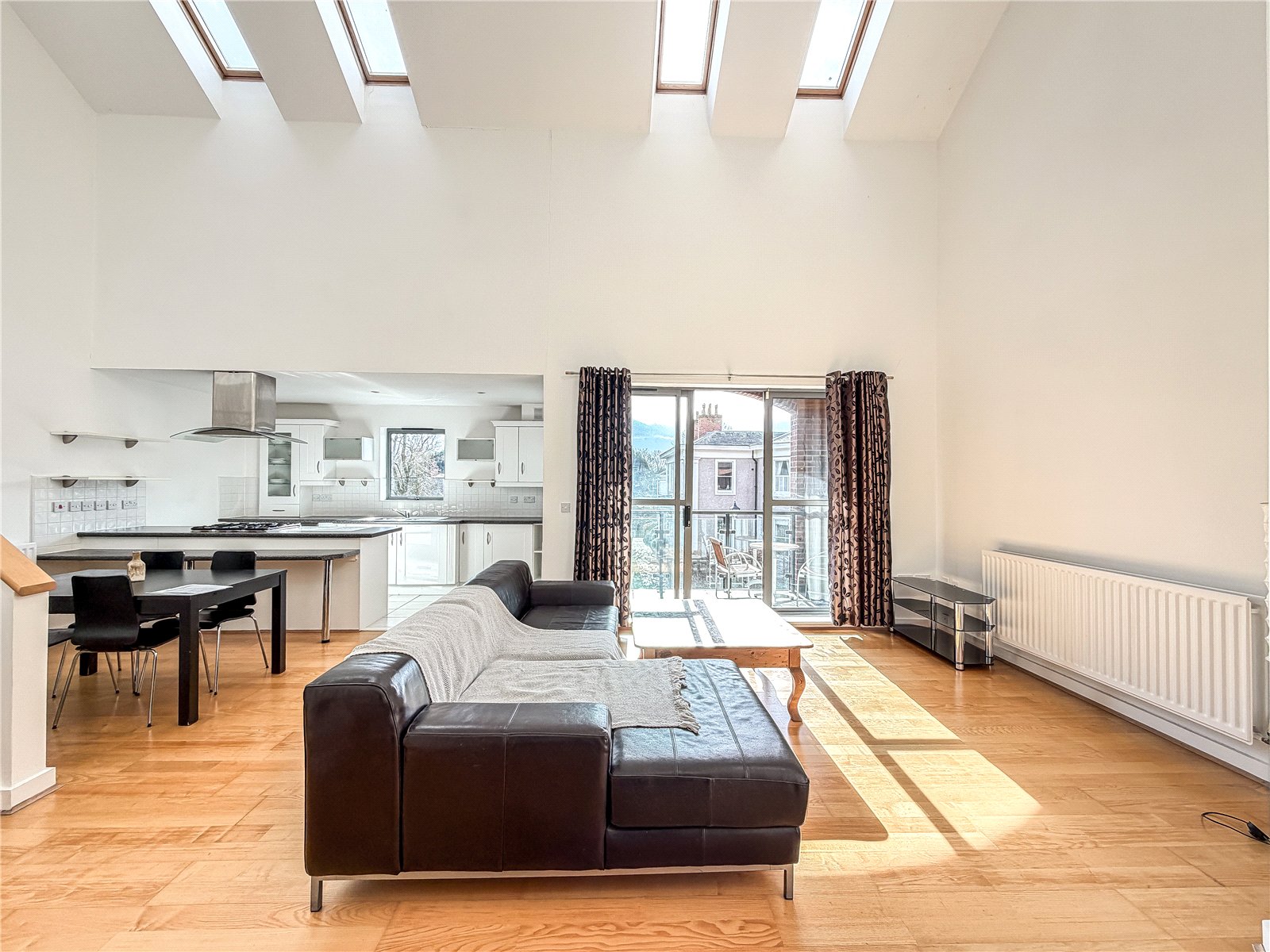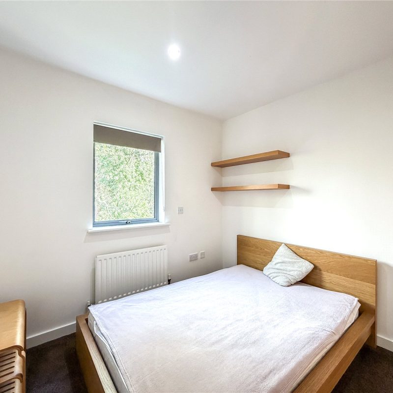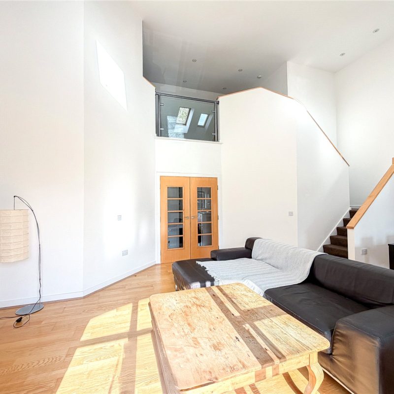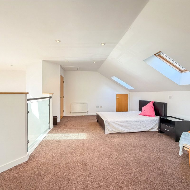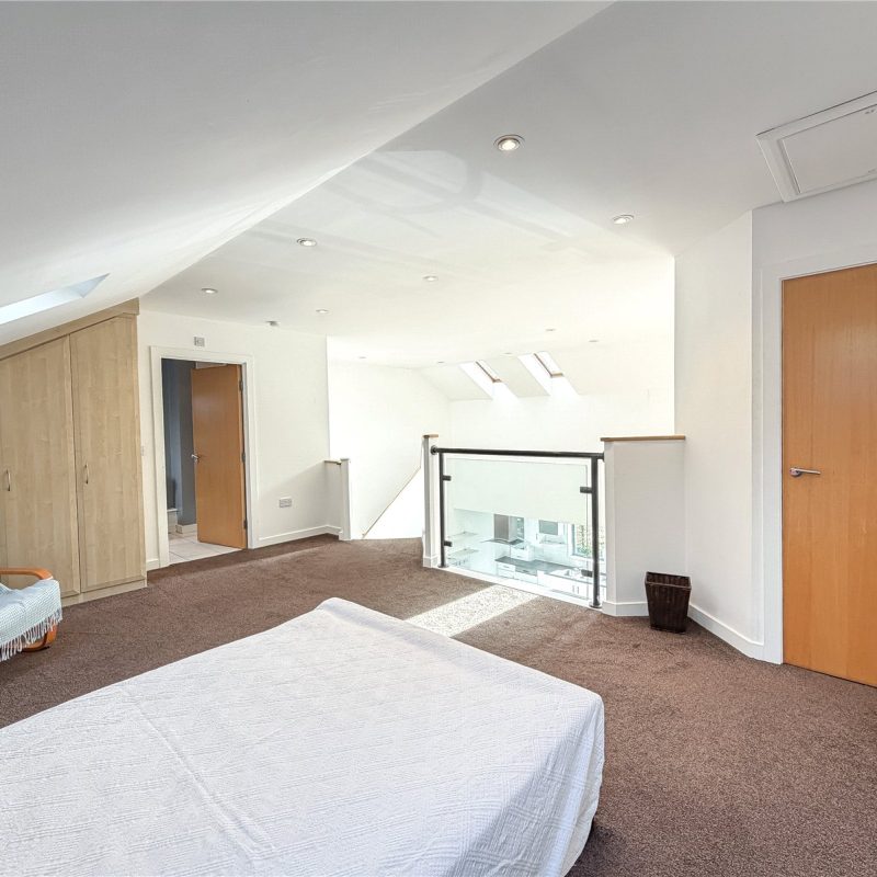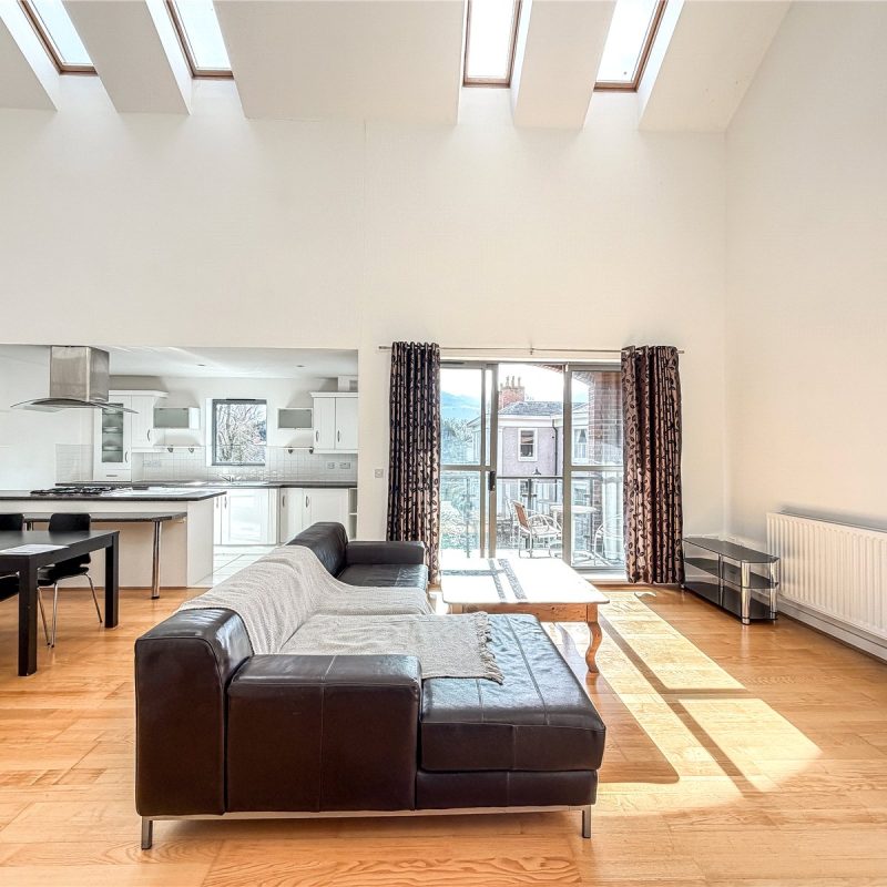The accommodation reveals an entrance hall with useful storage. Double doors open into the spectacular open- plan contemporary living space flooded in natural light from the roof lights above and sliding door out to the Southerly facing balcony. The kitchen is fitted with a selection of contemporary base and wall unites with breakfast bar, all complimented by integrated appliances. There are two well-proportioned double bedrooms both with fitted wardrobes, with one of the bedrooms also benefitting from a modern en-suite shower room and featuring a tall arched window overlooking the woodland to the rear. The floor is further served by the well-appointed bathroom.