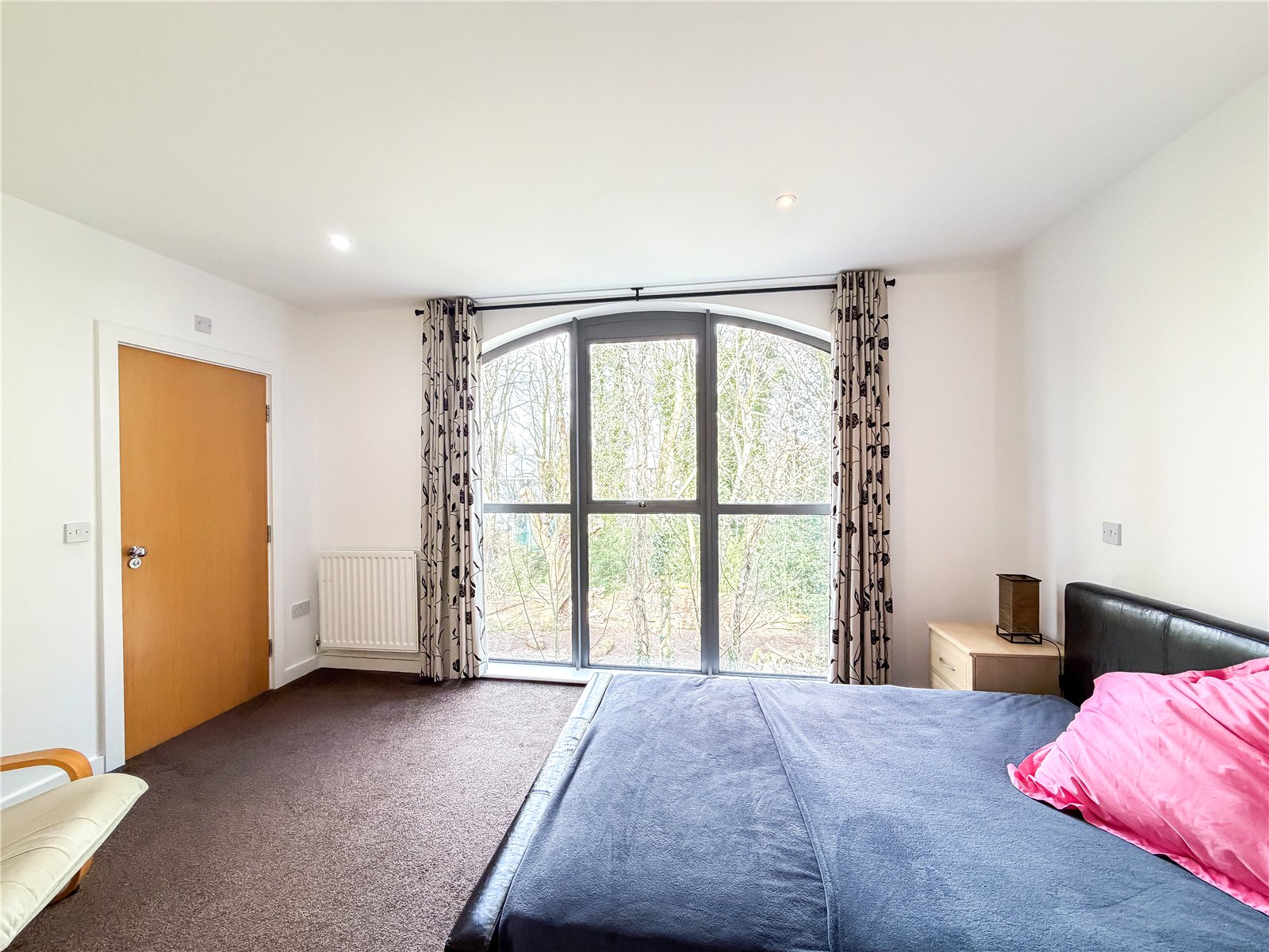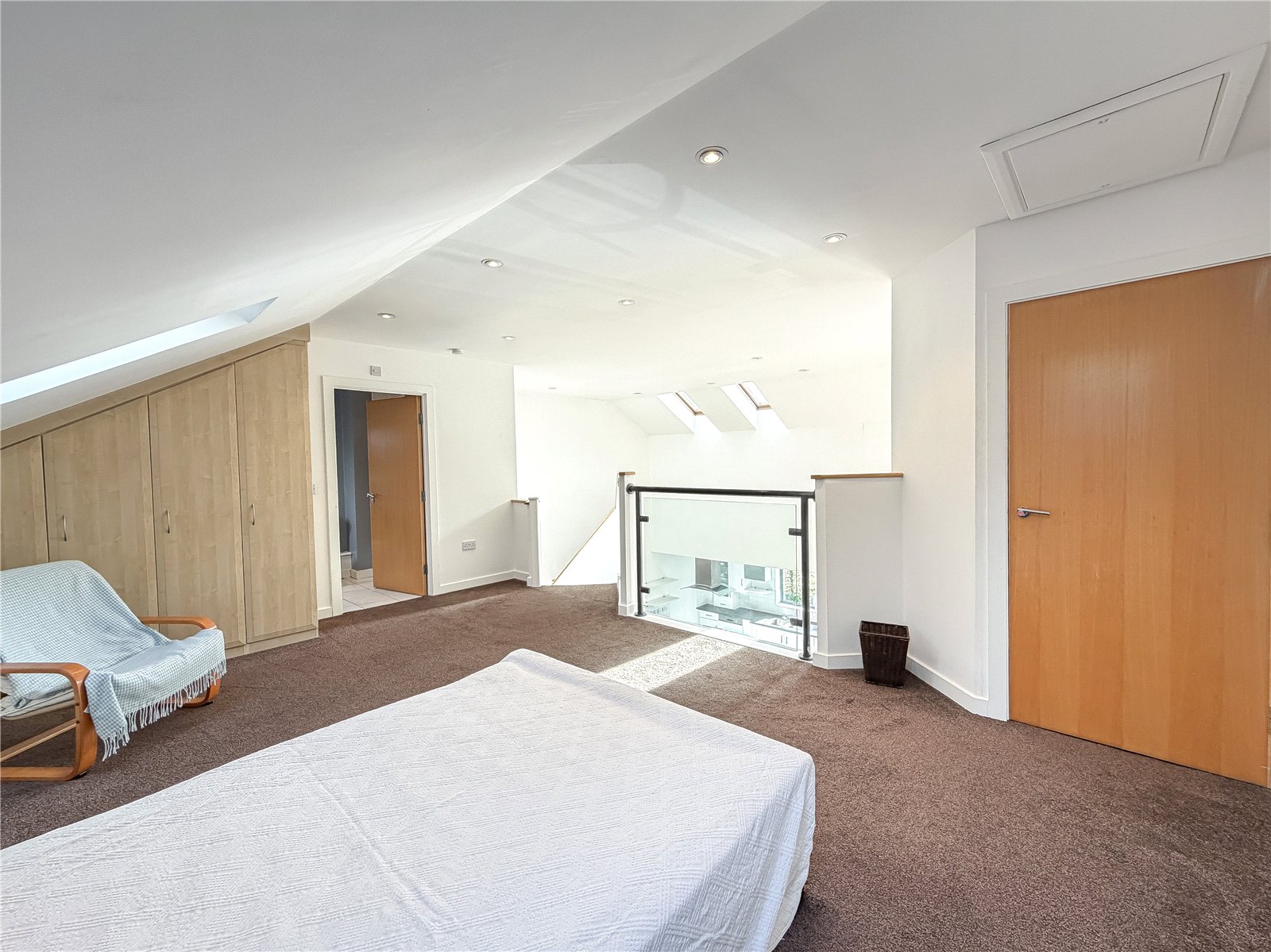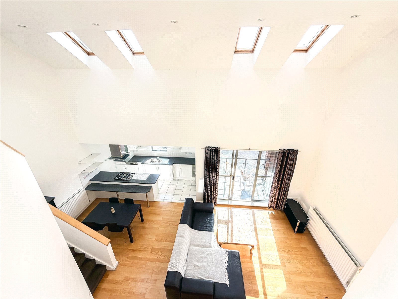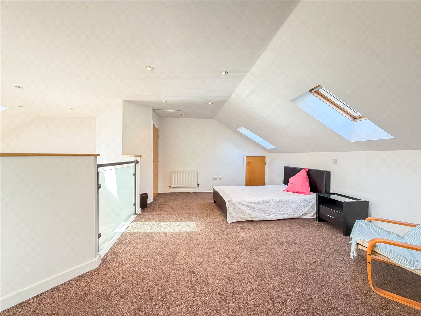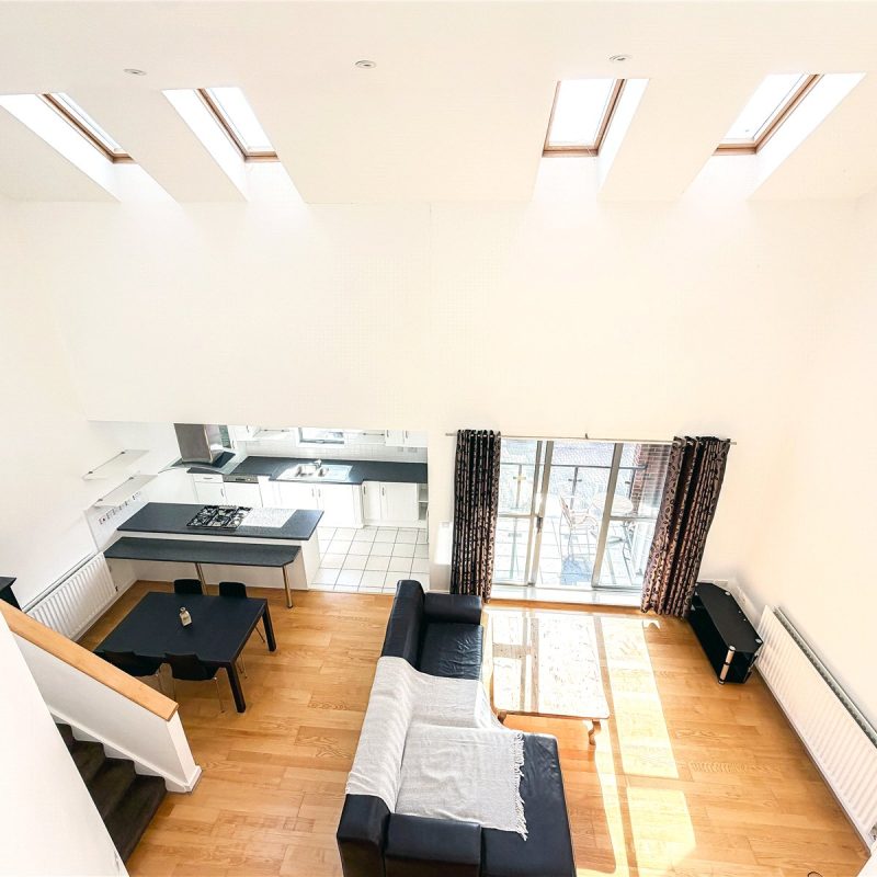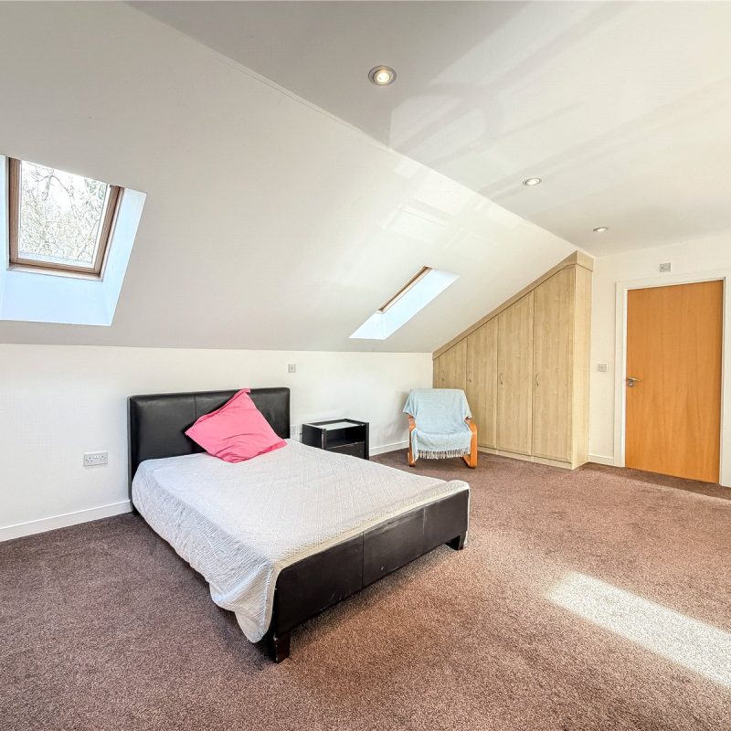 The accommodation reveals an entrance hall with useful storage. Double doors open into the spectacular open- plan contemporary living space flooded in natural light from the roof lights above and sliding door out to the Southerly facing balcony. The kitchen is fitted with a selection of contemporary base and wall unites with breakfast bar, all complimented by integrated appliances. There are two well-proportioned double bedrooms both with fitted wardrobes, with one of the bedrooms also benefitting from a modern en-suite shower room and featuring a tall arched window overlooking the woodland to the rear. The floor is further served by the well-appointed bathroom.