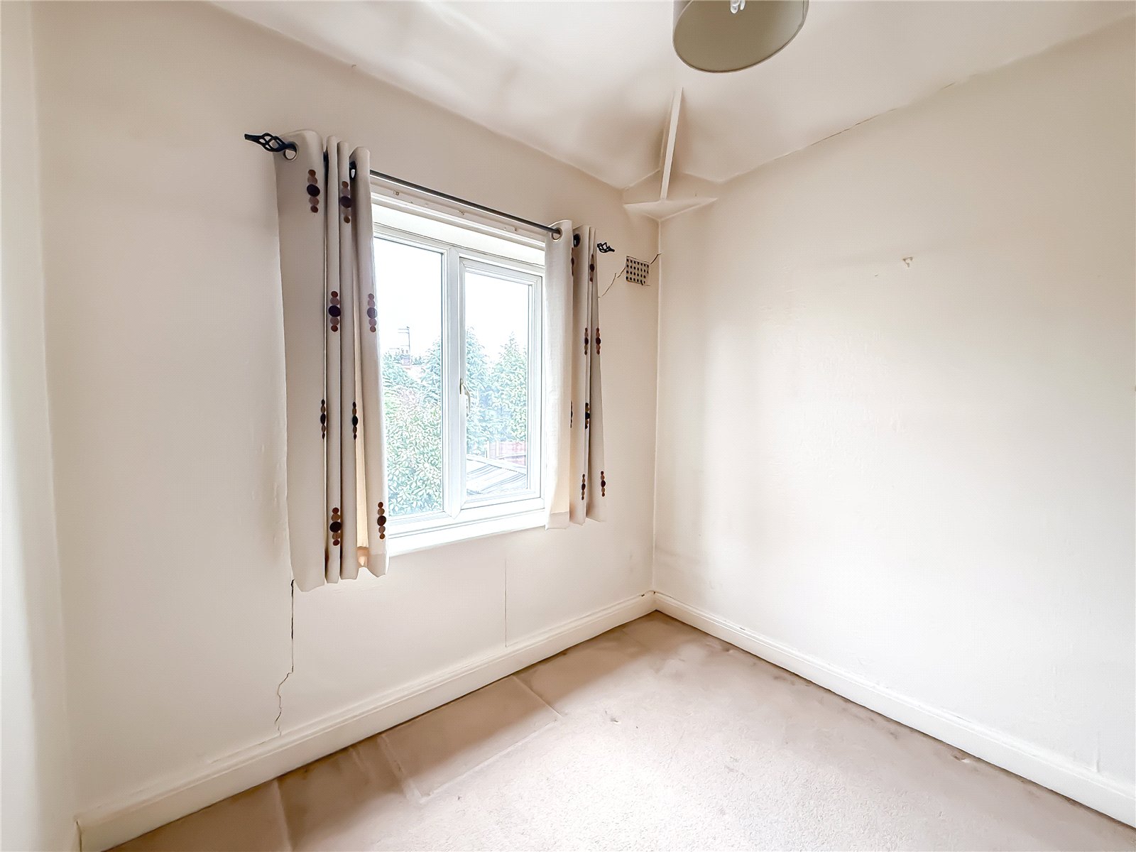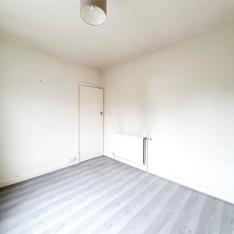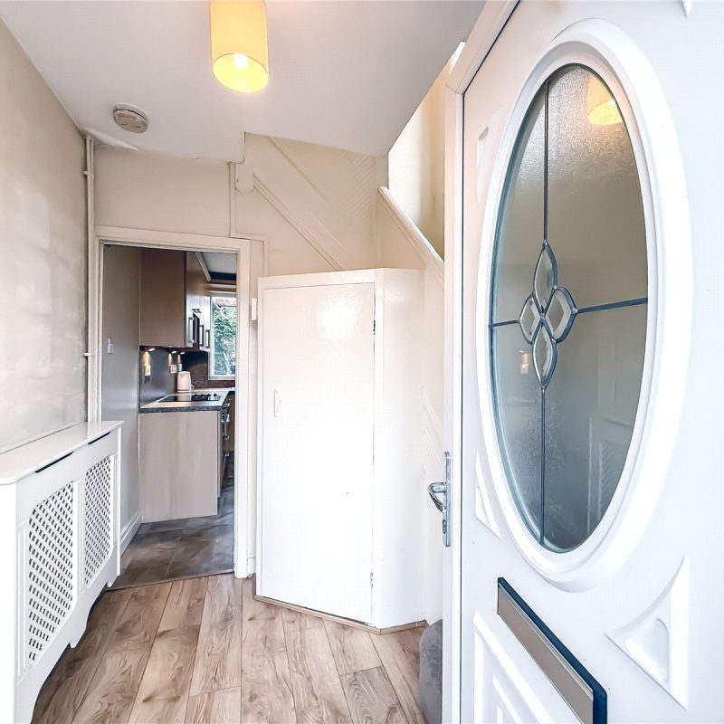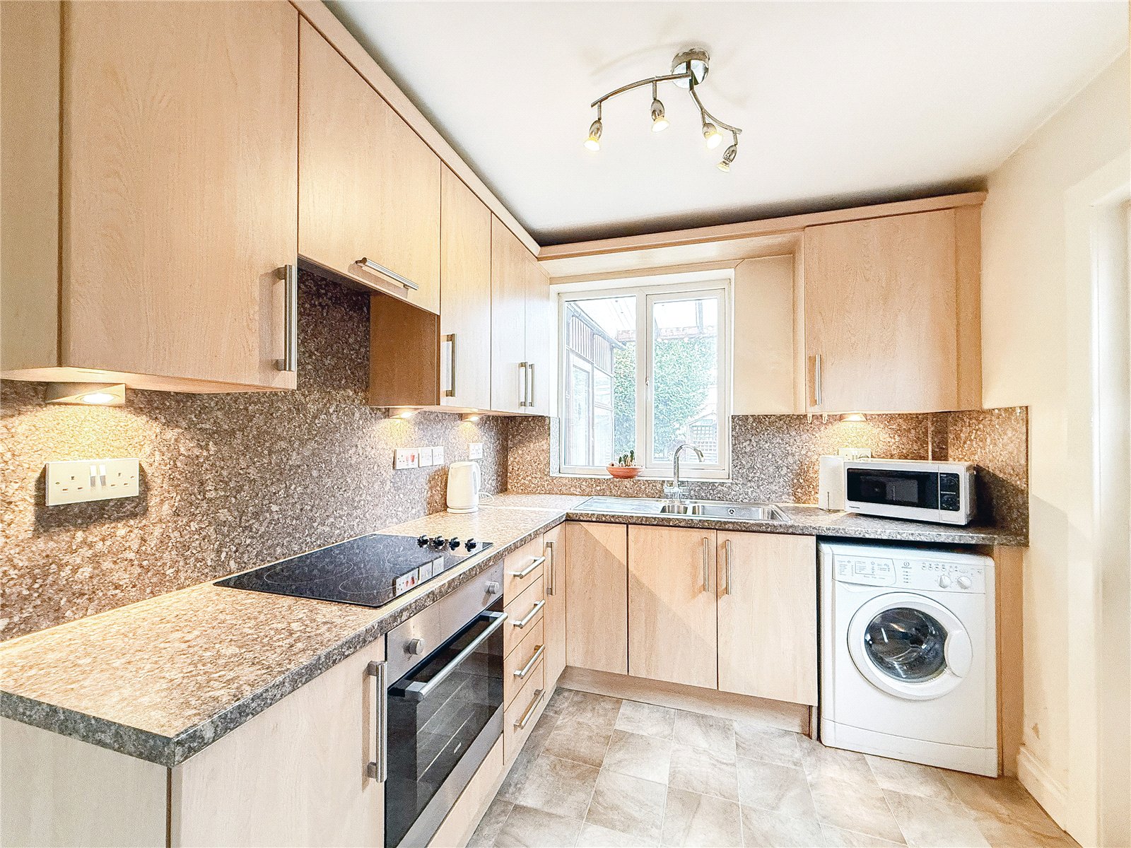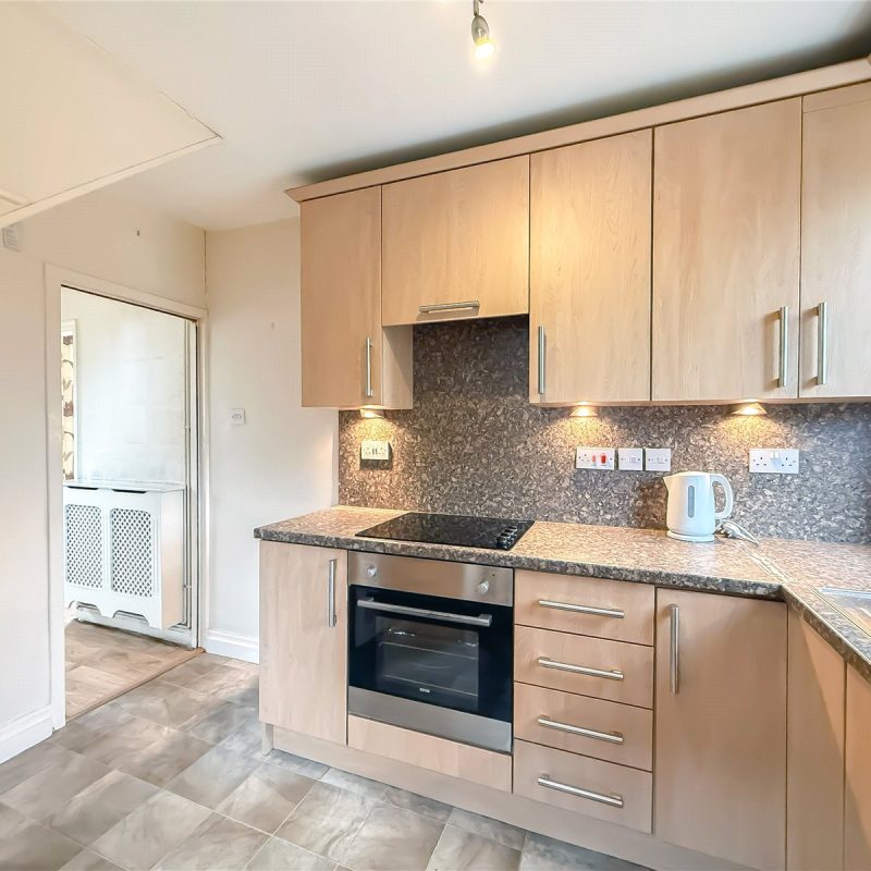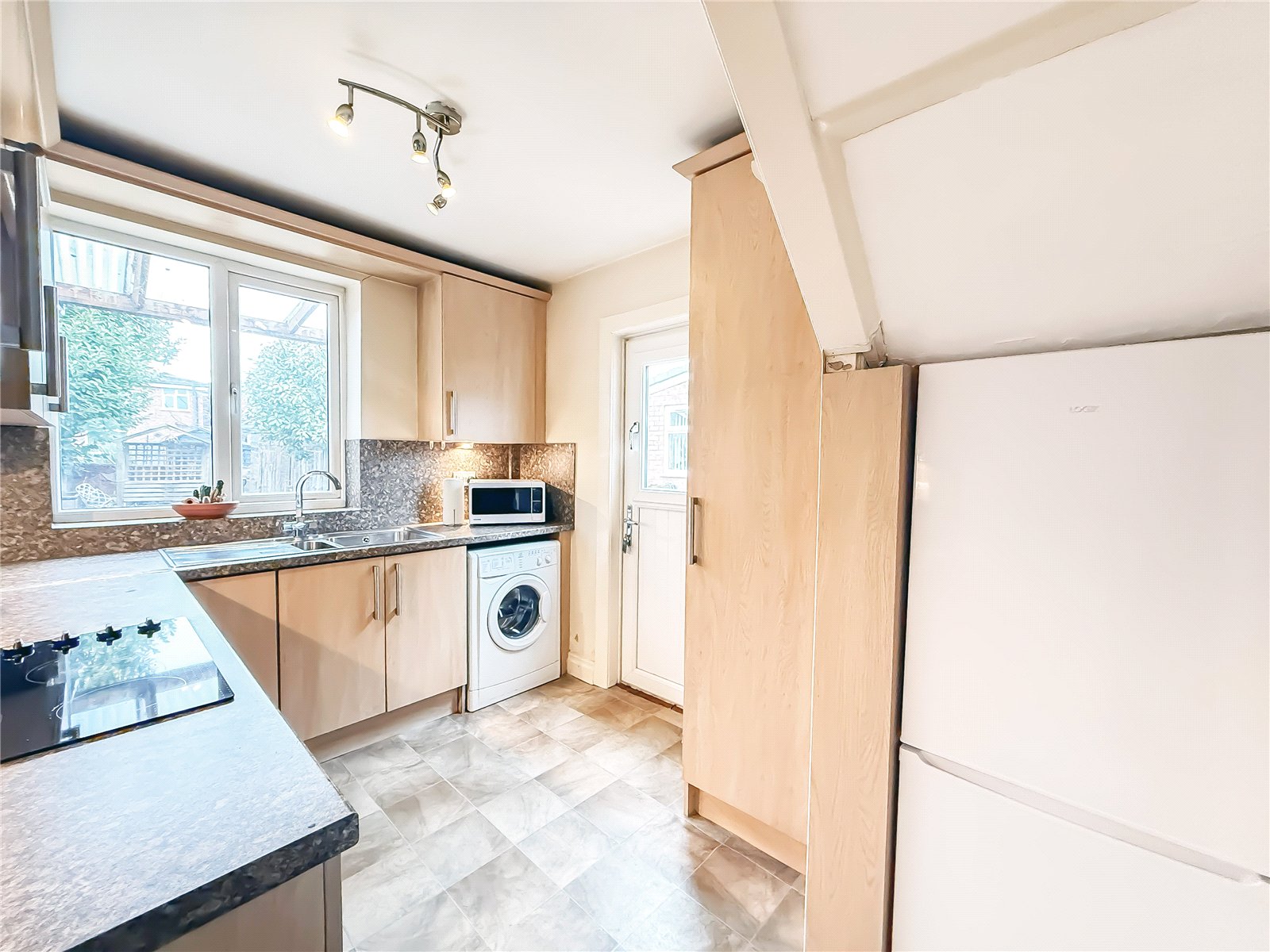 The kitchen is fitted with a selection of contemporary units, with space for appliances. A door from the kitchen leads out to the garden.