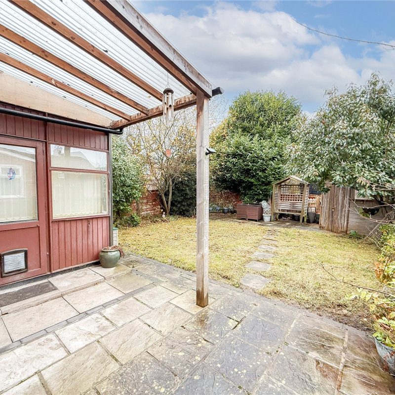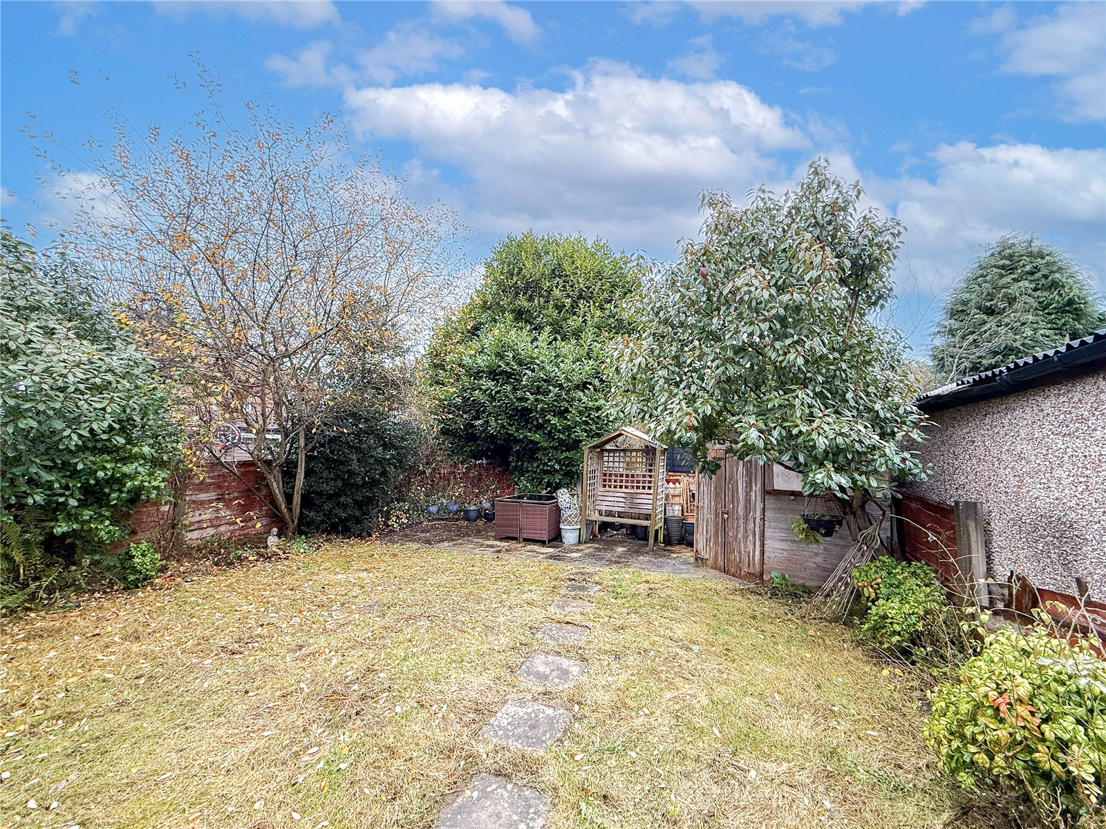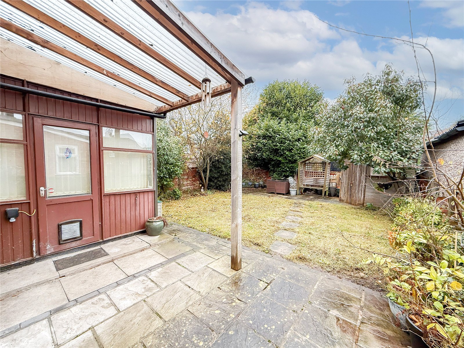 The property is approached via a flagstone driveway with an area of garden frontage alongside. A gate to the side of the property, opens into the generous garden, mainly laid to lawn, with a covered patio area ideal for entertaining in the warmer months.