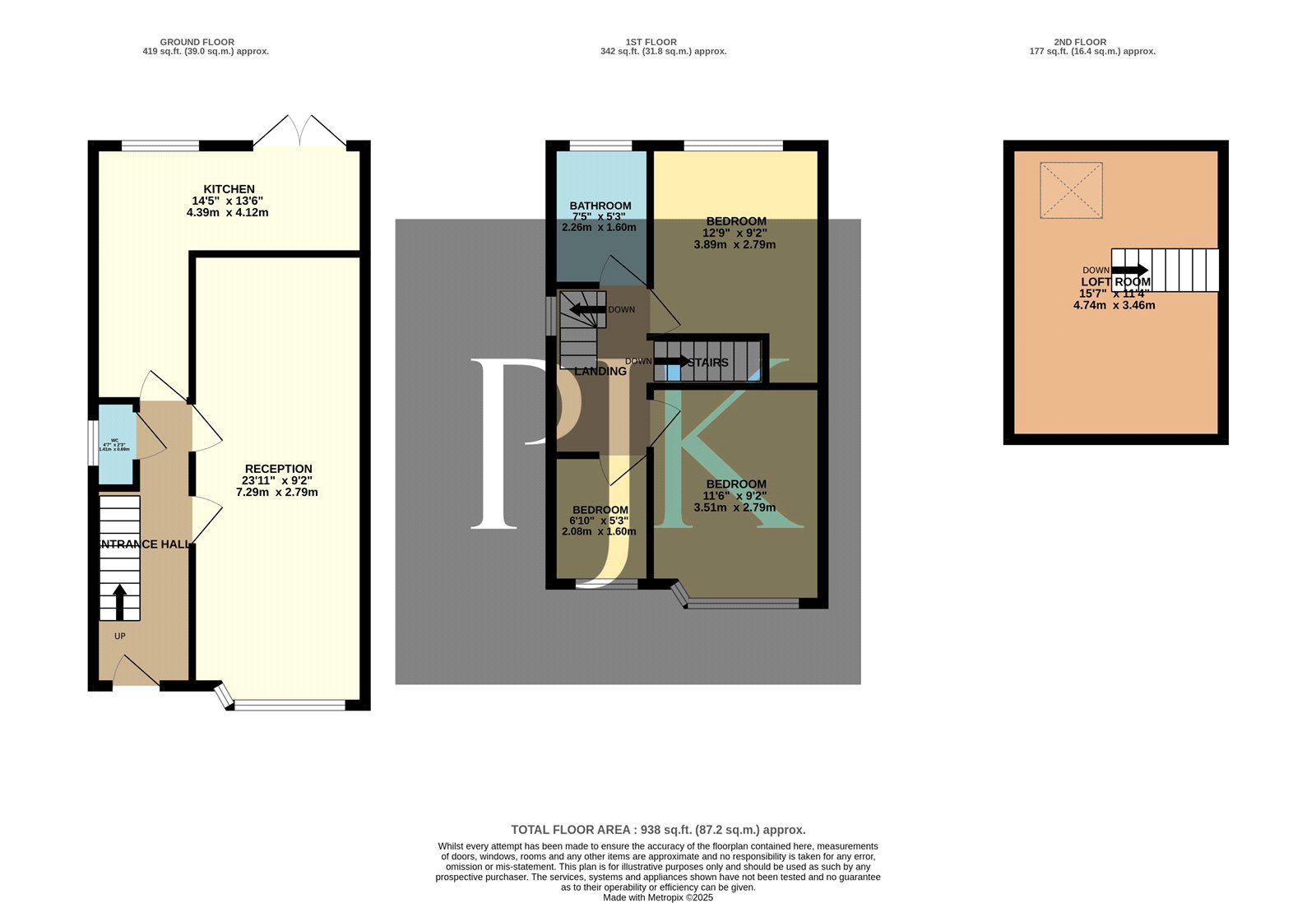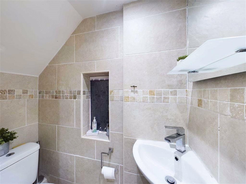 The first floor reveals three well-proportioned bedrooms—two comfortable doubles and a single room that would make an ideal nursery or home office. These rooms are serviced by a modern three-piece bathroom. Completing the internals is a practical loft room, providing excellent storage potential.