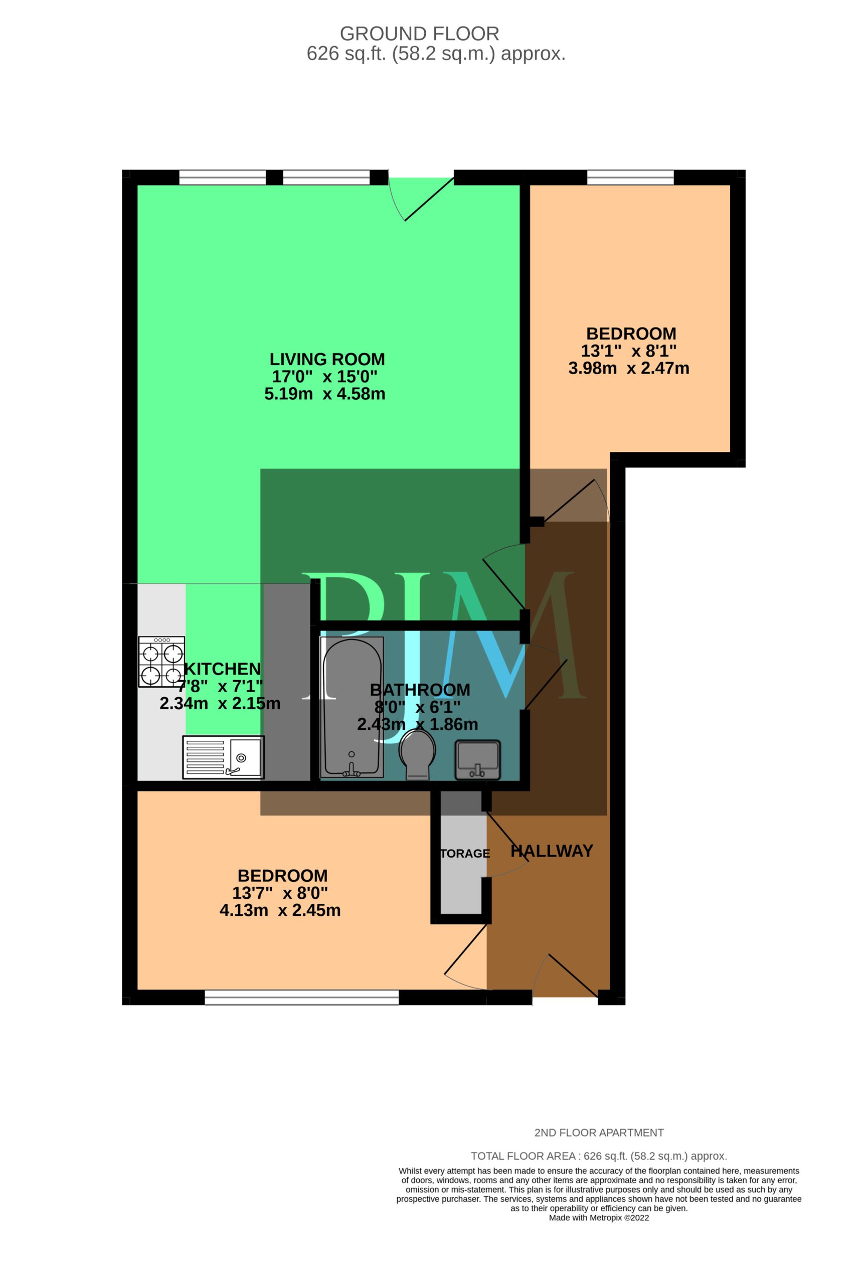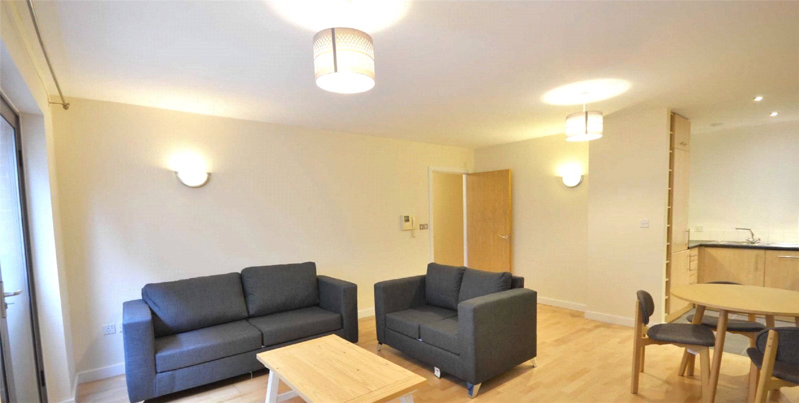 The apartment extends to 626 sq ft, and has accommodation consisting of an entrance hallway with storage / utility cupboard. There is access through to open plan living area, which has ample space for a dining table and chairs. The kitchen is fitted with a comprehensive range of modern units complemented with integrated appliances. Leading from the hallway are the two well proportioned double bedrooms, which both have ample room for freestanding furniture. The apartment is served by a white bathroom which has a bath with shower, wash basin and W.C.