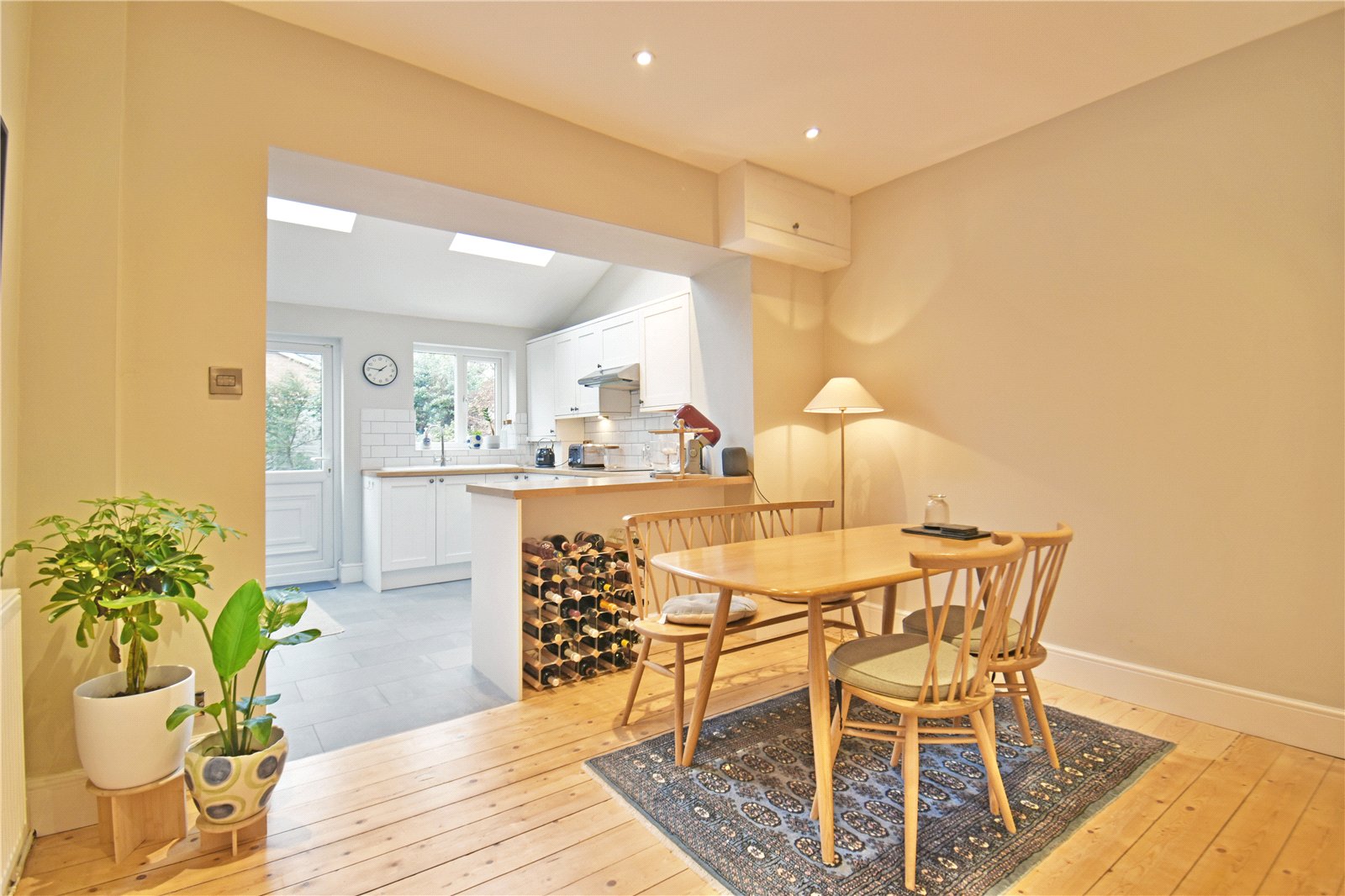 The accommodation begins with a welcoming entrance vestibule leading into a lovely living room, featuring a handsome wood-burner and attractive hardwood flooring that continues through to the dining room. The dining room now enjoys full width proportions, with the chimney breast removed to enhance layout options and create a more generous and flexible living space.