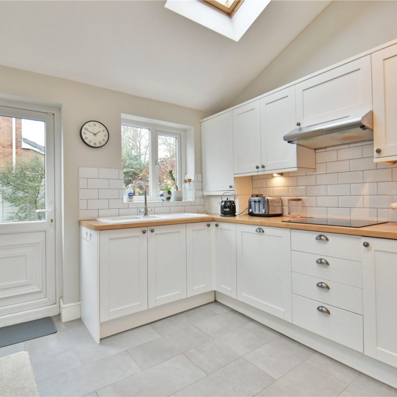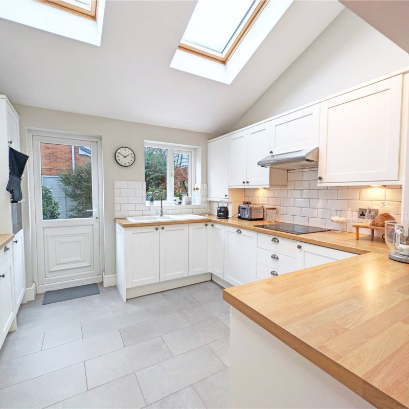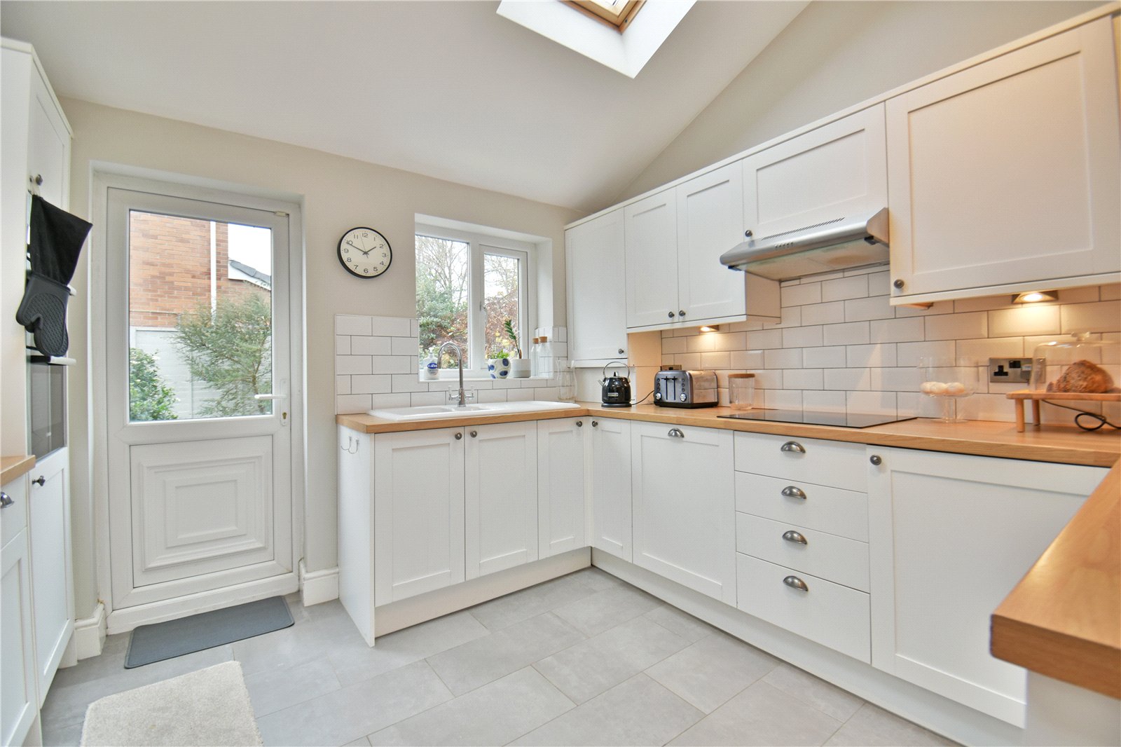 To the rear is a stunning full-width extended kitchen/dining space, offering excellent room for dining furniture and fitted with sleek modern cabinetry, integrated appliances, stylish tiling and quality work surfaces. Shutter blinds are fitted throughout the property, providing a timeless finish and enhancing both privacy and light control. French doors open directly to the rear garden.