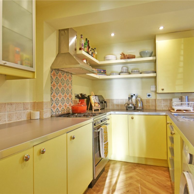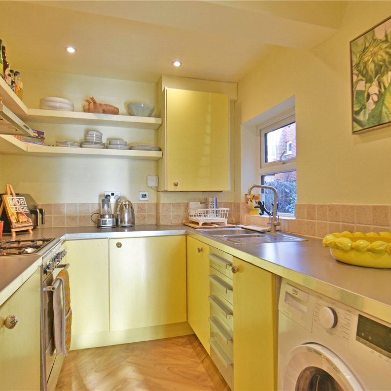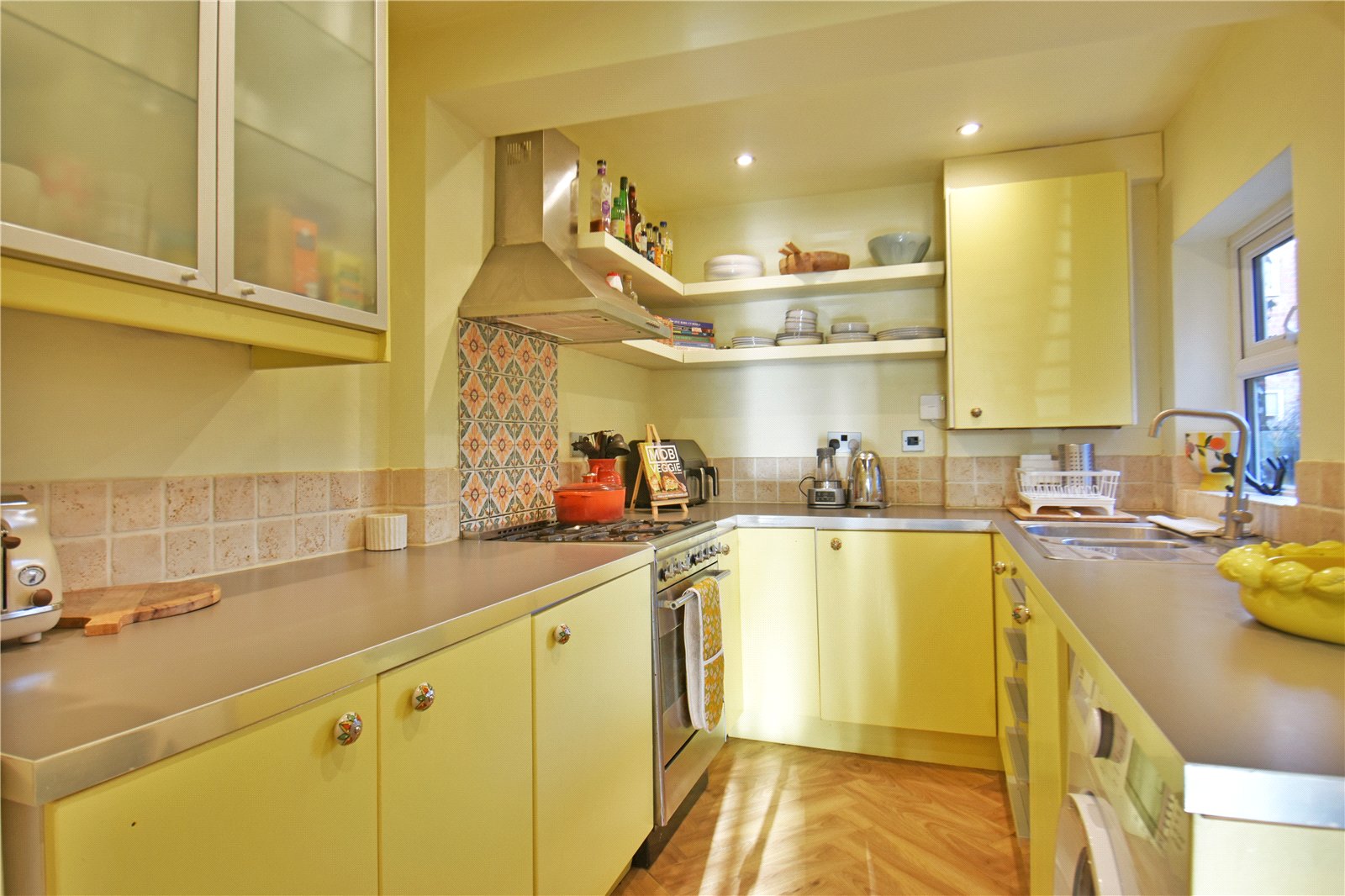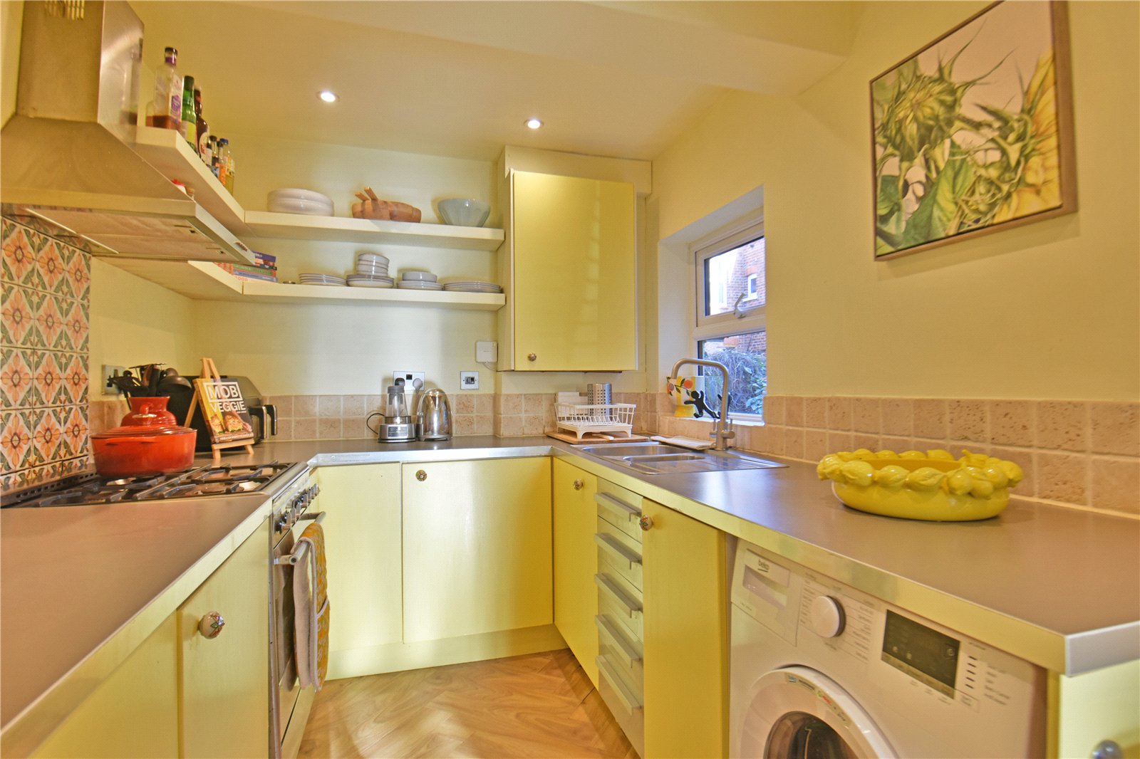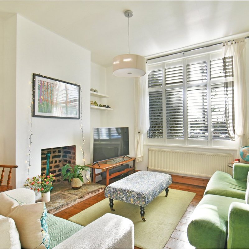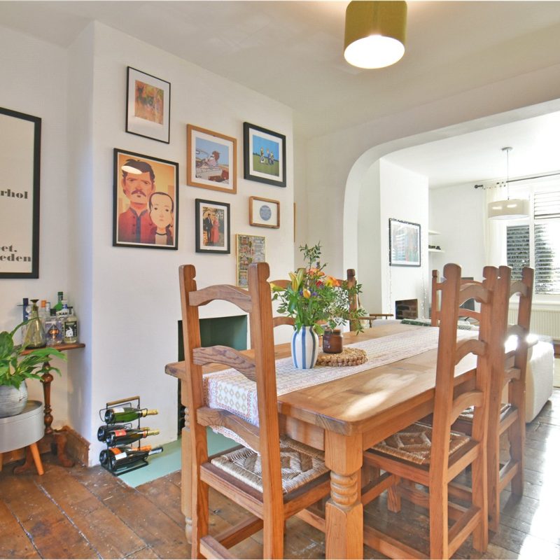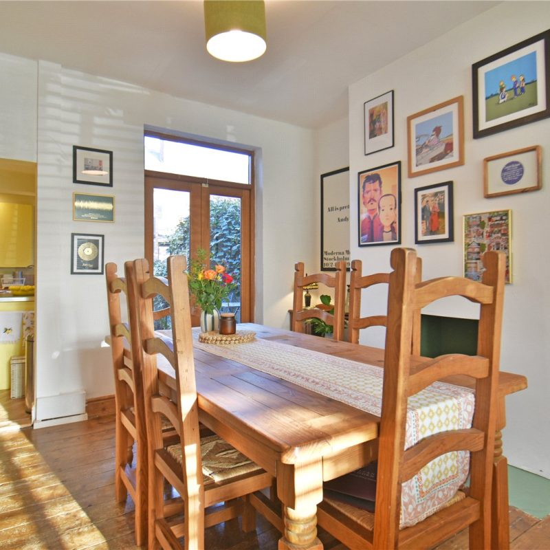 The accommodation begins with a traditional entrance hall accessed via a charming stained-glass front door. To the ground floor are two reception rooms arranged in an open plan layout, featuring stripped wooden flooring and French doors opening directly onto the rear garden — ideal for both everyday living and entertaining. The fitted kitchen is positioned to the rear and benefits from modern units, quality work surfaces and a practical layout.