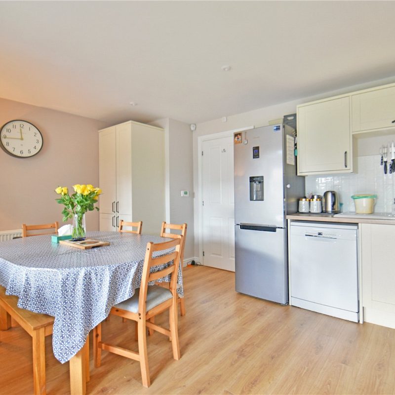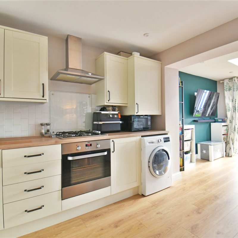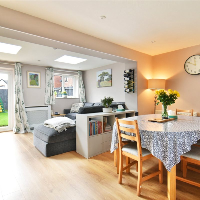 The accommodation has been immaculately maintained and thoughtfully extended, featuring a single-storey rear extension which has created a stunning open plan kitchen and living space — the true heart of the home. The bright and contemporary kitchen/diner is fitted with modern units, quality work surfaces and integrated appliances, while the open plan layout provides ample space for both dining and relaxed family living, with French doors opening directly onto the south-facing garden. To the front sits a comfortable lounge, perfect for cosy evenings, and a welcoming entrance hall with a guest WC completes the ground floor.