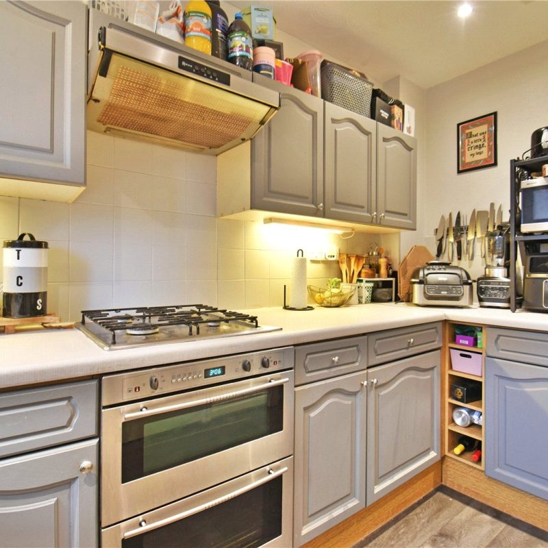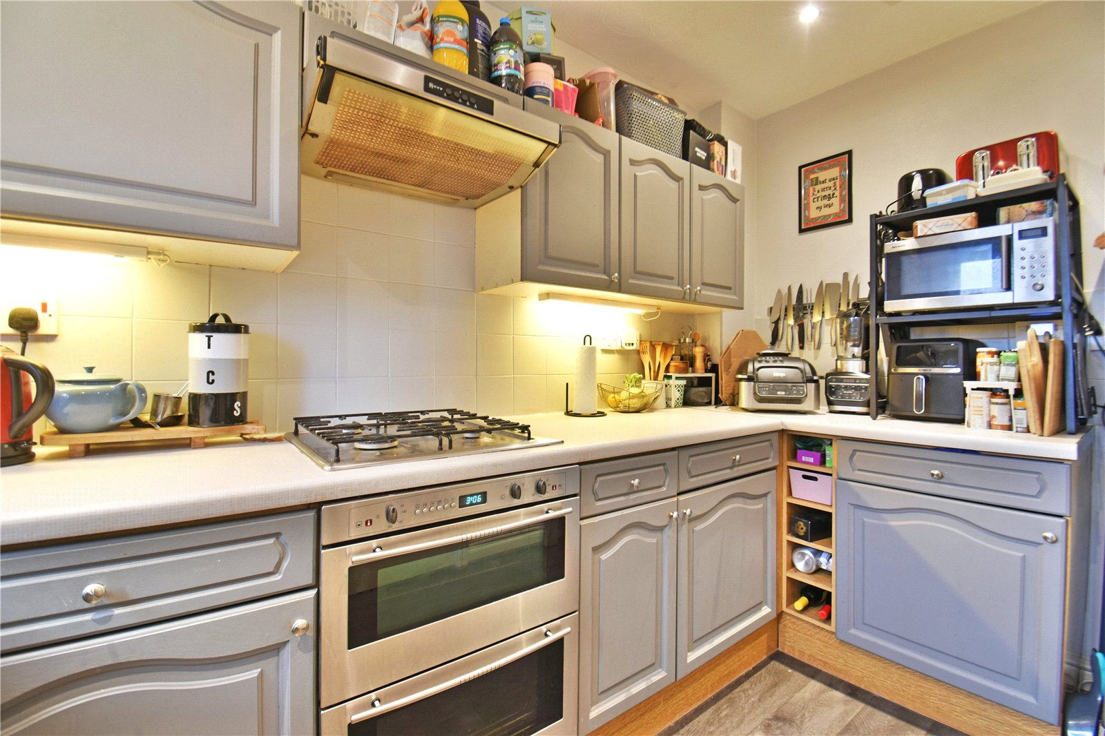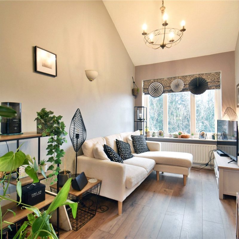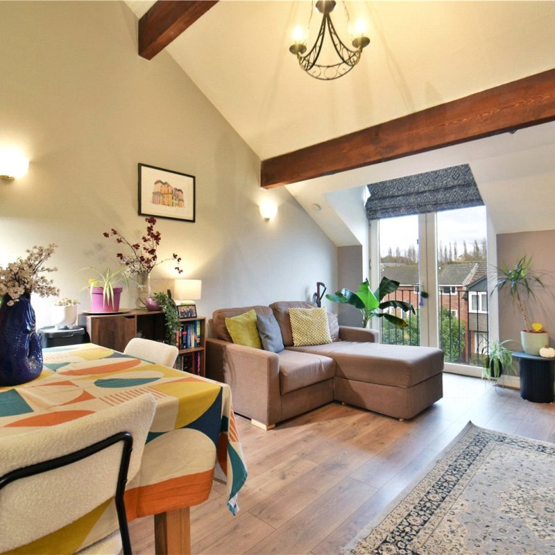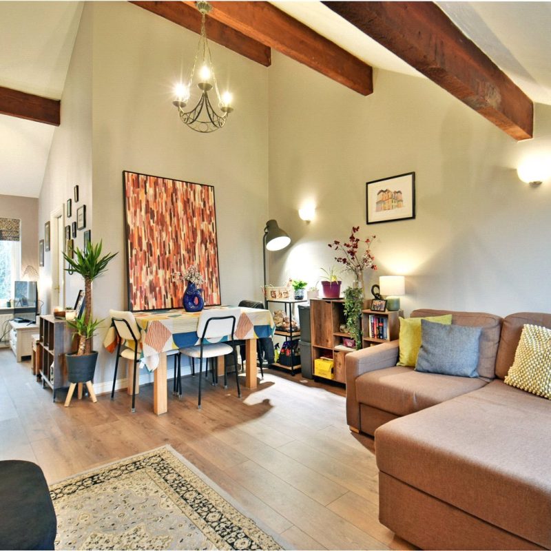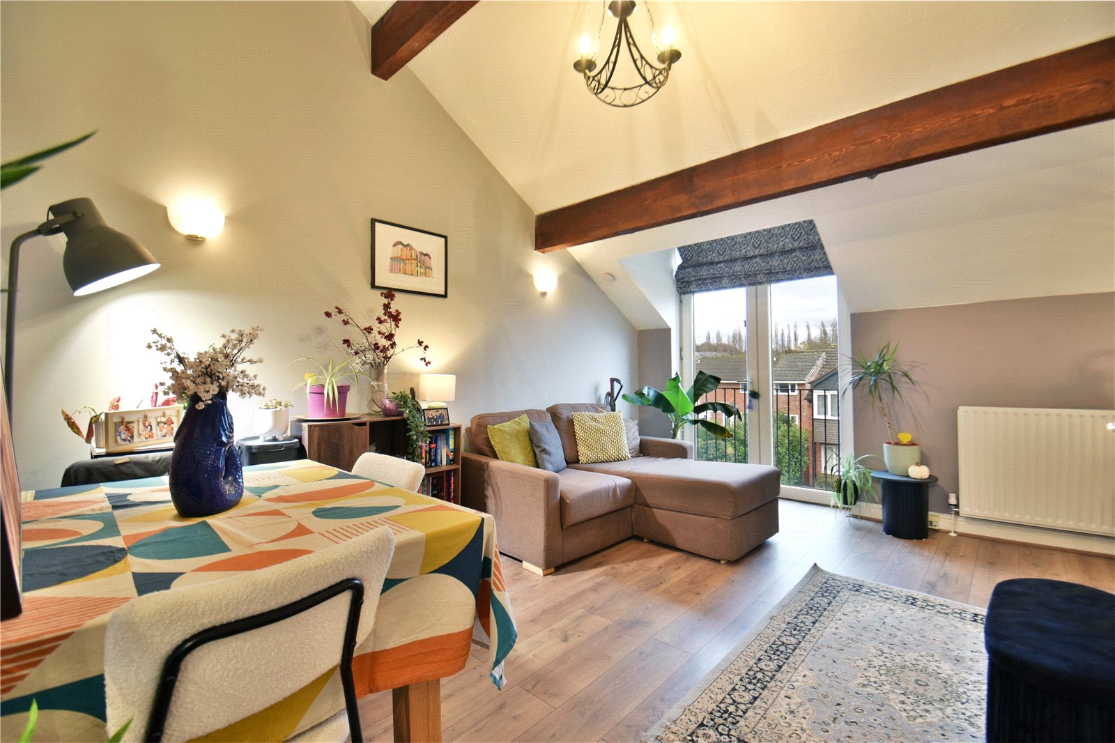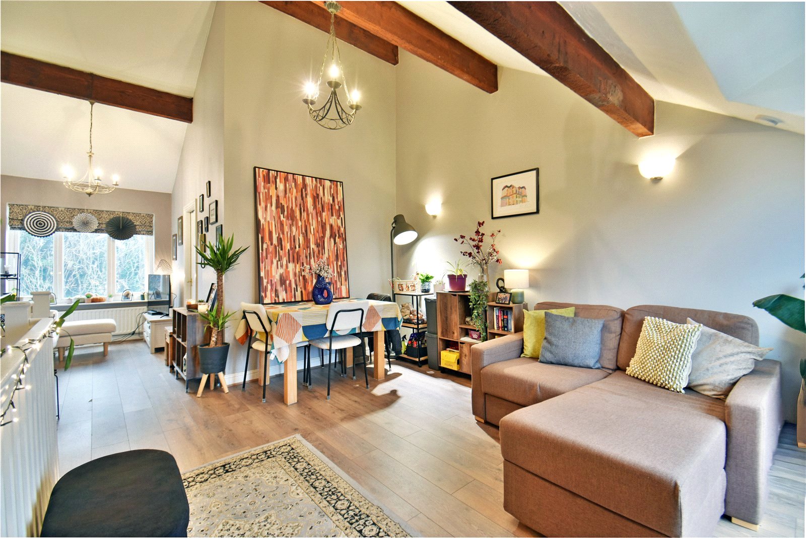 Occupying the top floor is a superb open-plan living and dining space, featuring exposed beams and a Juliet balcony which floods the room with natural light and creates an excellent space for relaxing or entertaining. A separate kitchen is positioned off the living area, providing a practical and well-arranged cooking space.