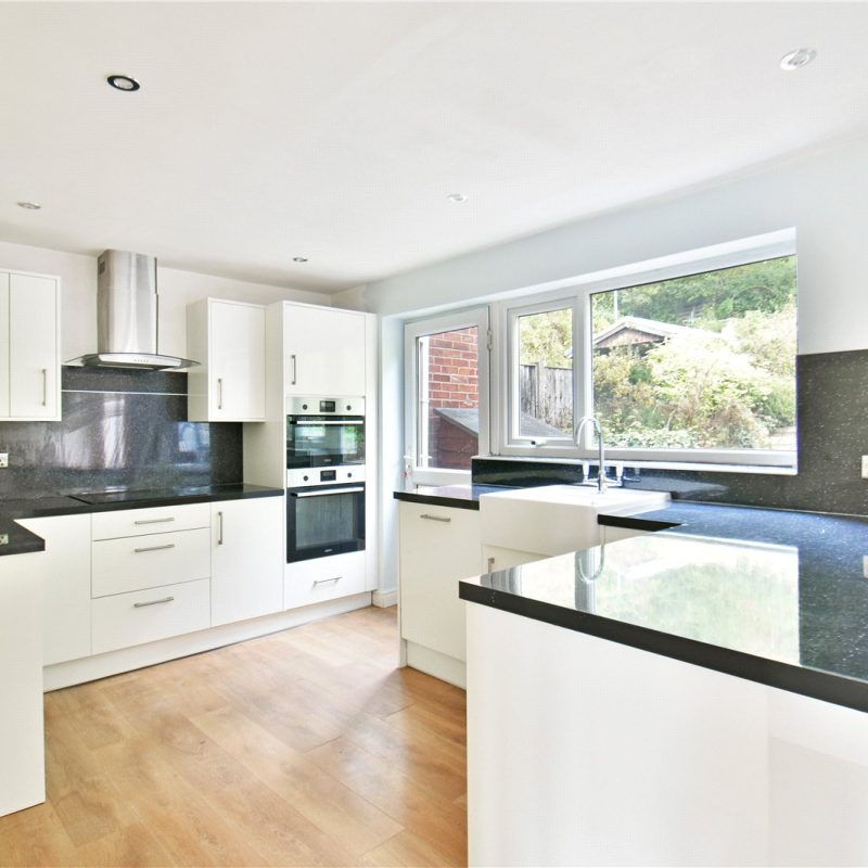 The accommodation begins with a welcoming entrance porch that opens into a bright and spacious living room, filled with natural light and providing access to the first floor. To the rear, the superb open plan kitchen and dining area forms the true heart of the home. Fitted with a stylish Wren kitchen featuring quality units, Belfast sink, Quartz-style worktops, new integrated Zanussi appliances (including induction hob, fan oven, microwave oven, fridge and freezer – all under 5-year guarantee), under-unit lighting, and underfloor heating, it provides an excellent setting for both everyday family living and entertaining. Sliding doors open directly onto the rear garden, creating a seamless indoor-outdoor flow. From the kitchen, there is access to a large integrated garage offering secure parking and additional storage.
