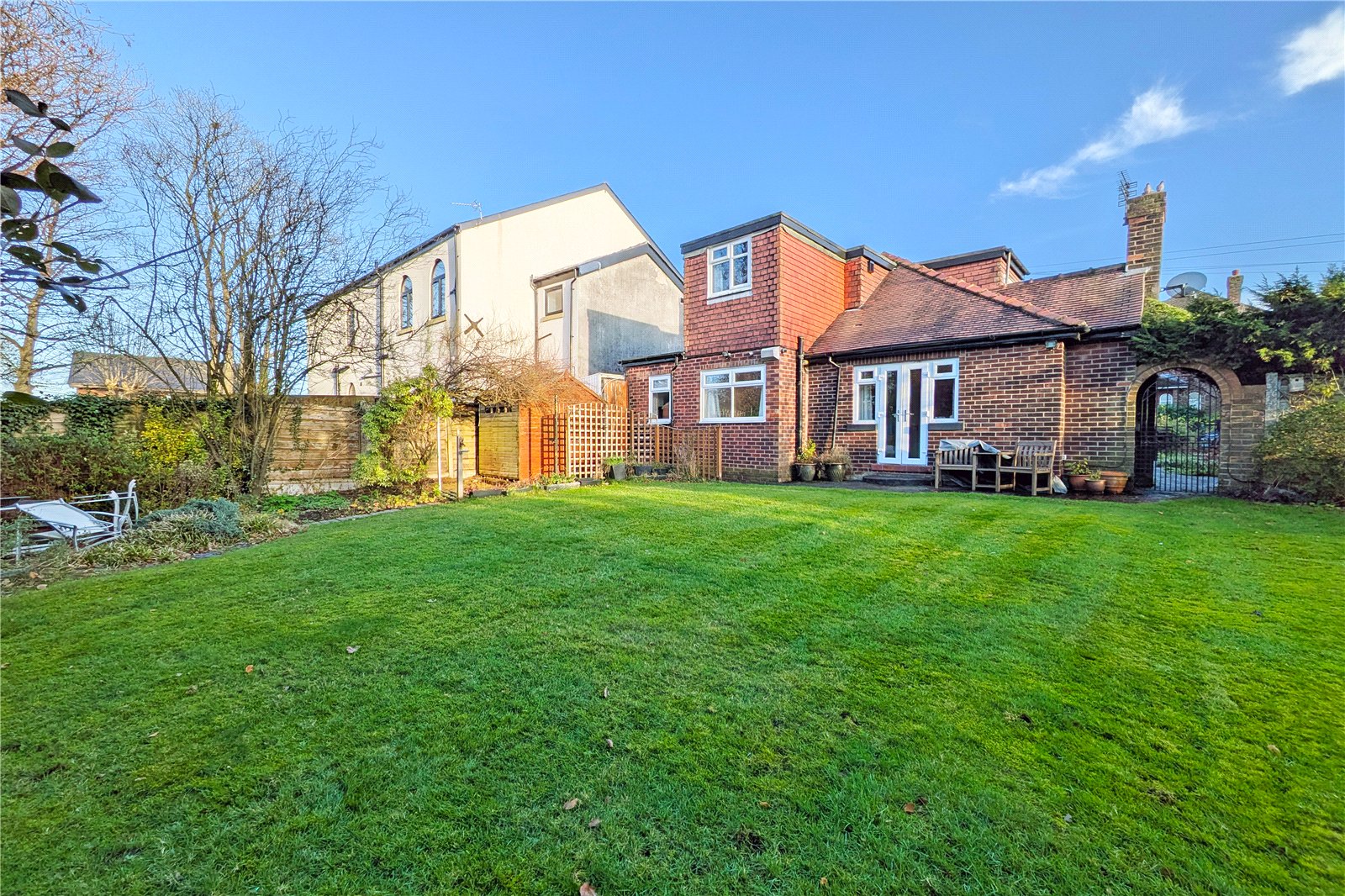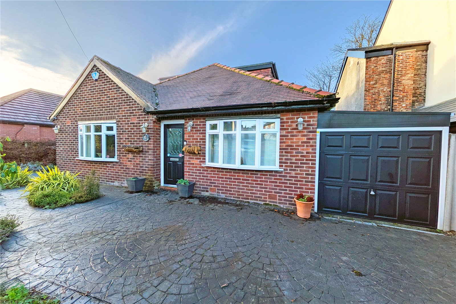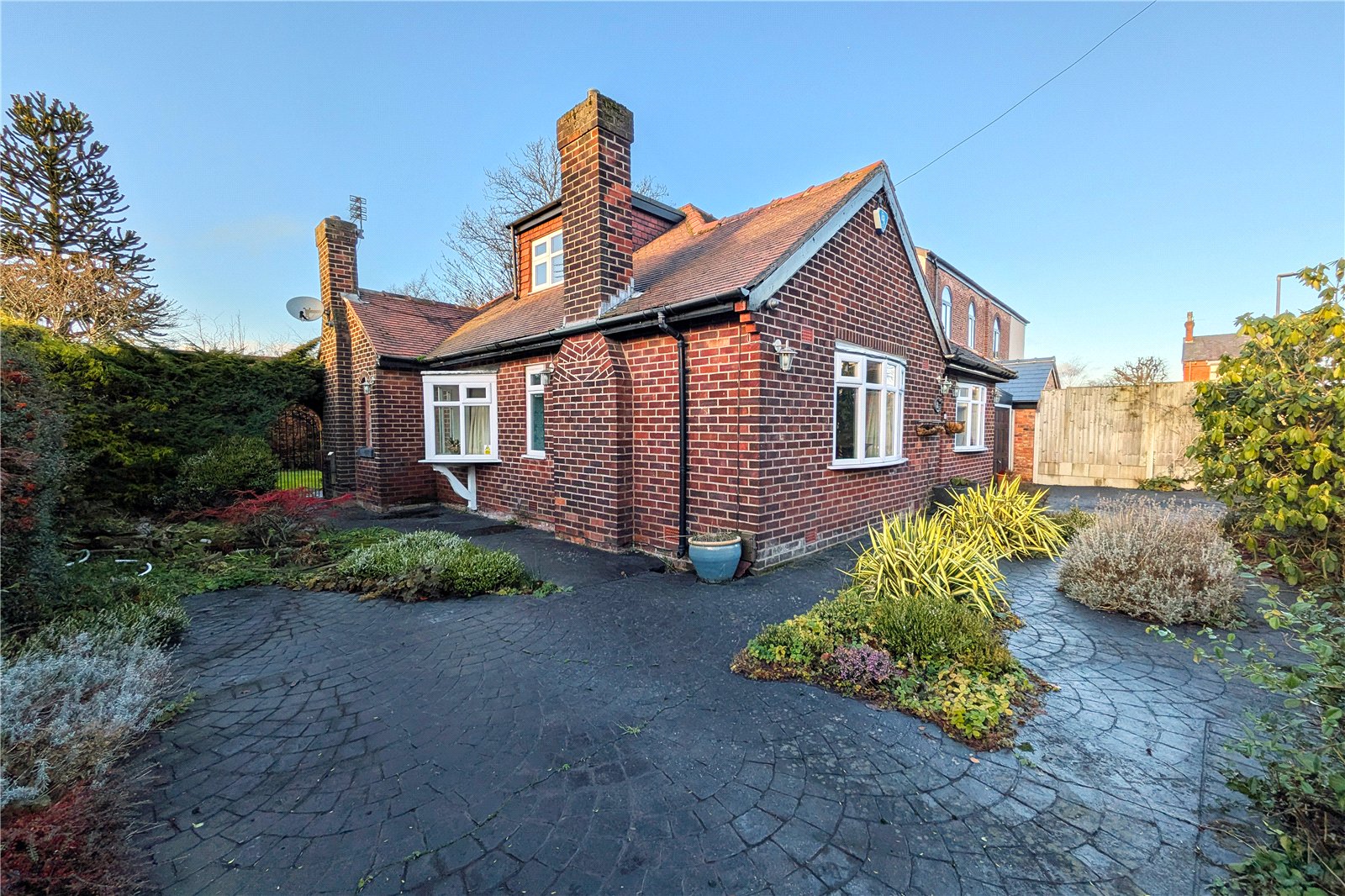 The property is introduced via a striking double-fronted façade and a generous driveway providing ample off-road parking. A well-kept garden frames the entrance and offers scope for buyers to landscape and personalise the space further.