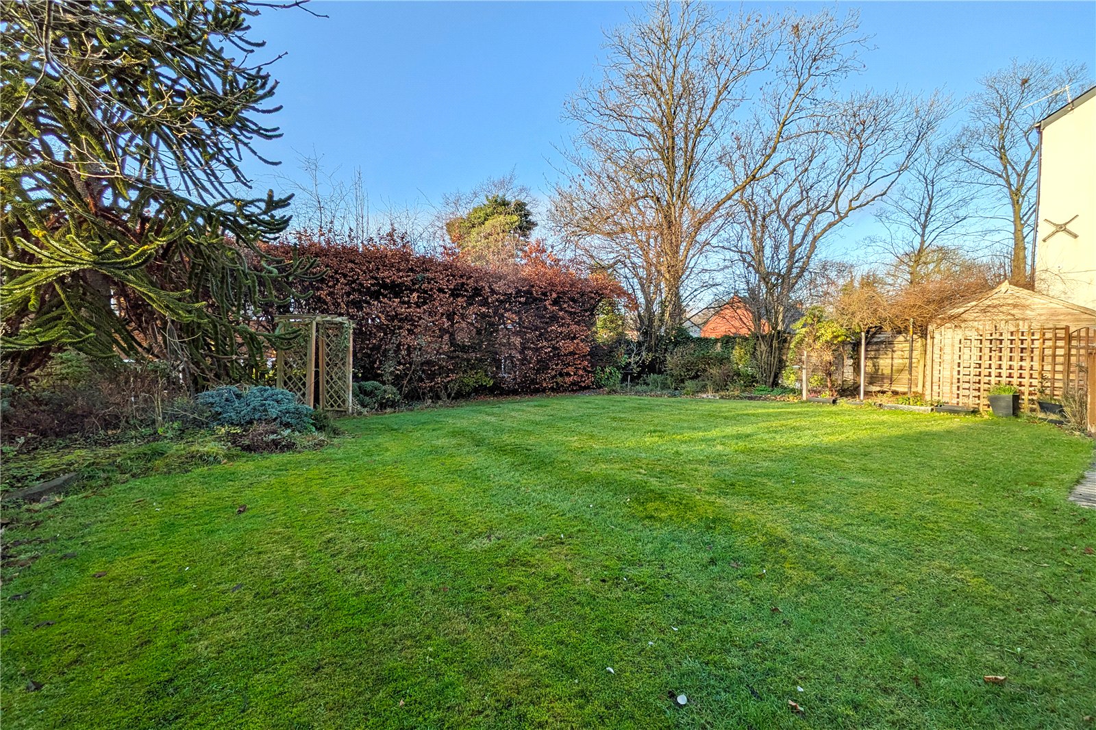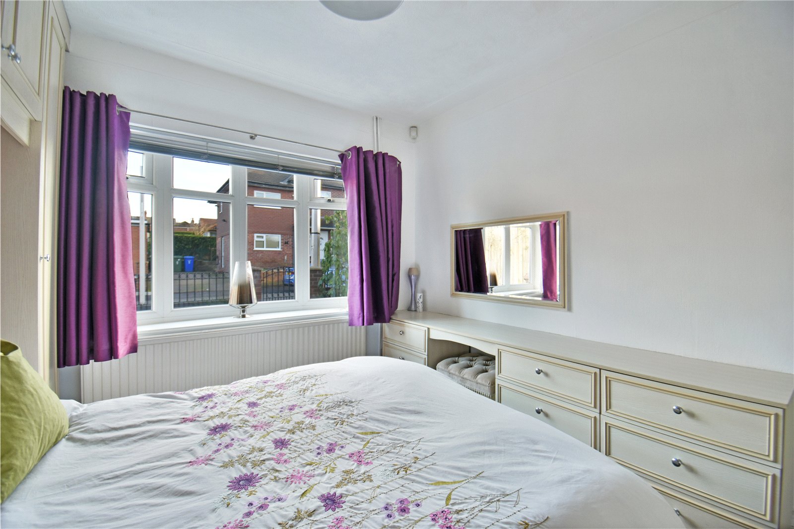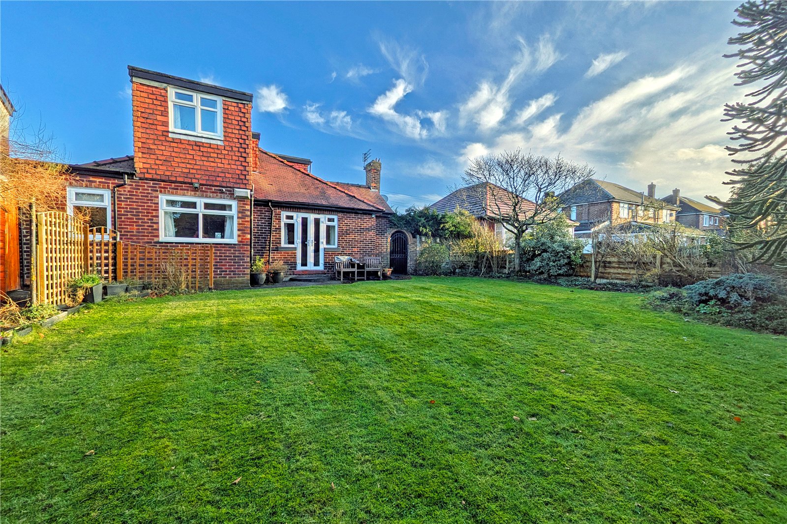 The property is introduced via a striking double-fronted façade and a generous driveway providing ample off-road parking. A well-kept garden frames the entrance and offers scope for buyers to landscape and personalise the space further.