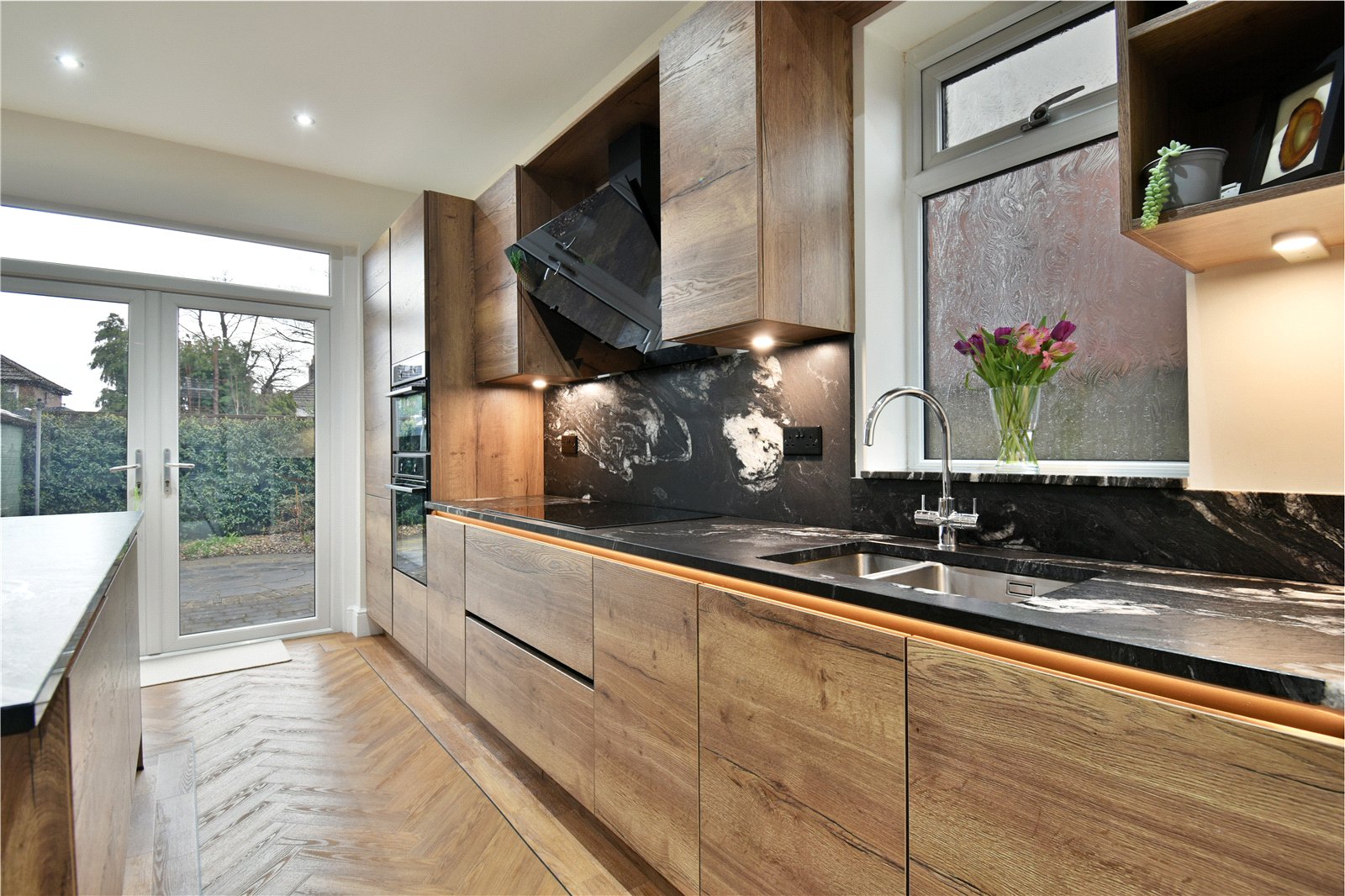 The accommodation begins with a welcoming entrance hallway providing access to the first floor. To the rear of the property is a breathtaking open-plan kitchen and living space, forming the heart of the home and seamlessly connecting the ground floor. This impressive space benefits from hardwood parquet flooring throughout, creating a stylish and cohesive finish. The kitchen itself is a real centrepiece, fitted with beautiful matching wall and base units, quality work surfaces and a stunning breakfast island, ideal for both everyday living and entertaining. Completing the ground floor is a convenient downstairs WC.
