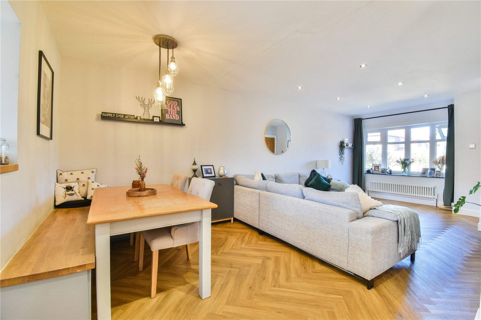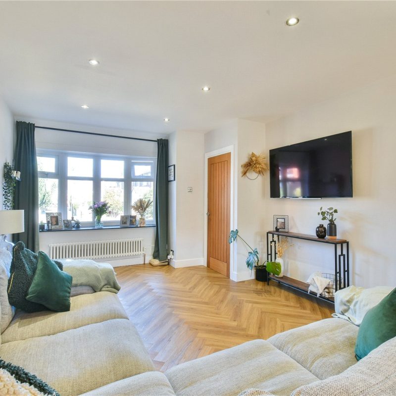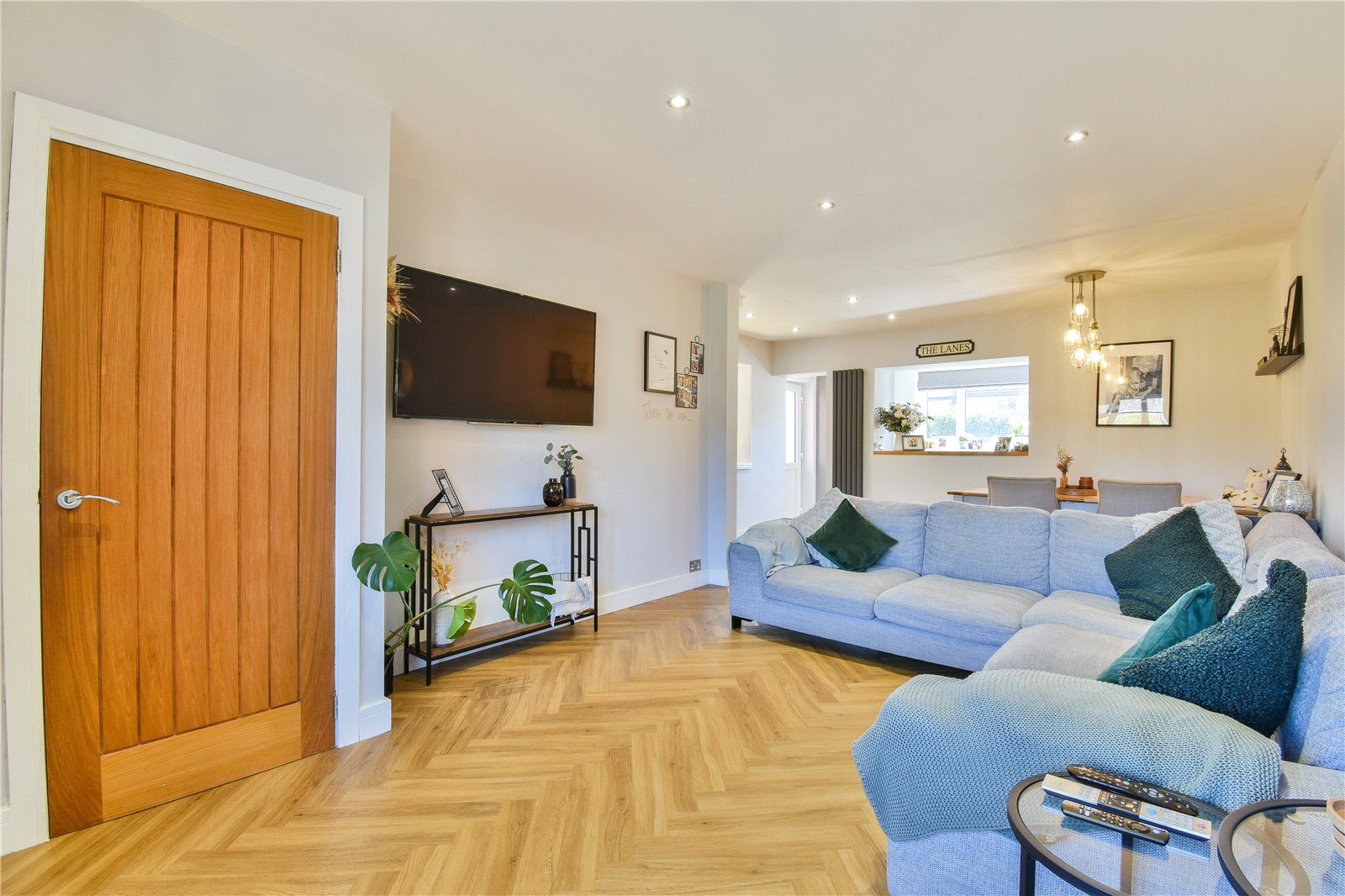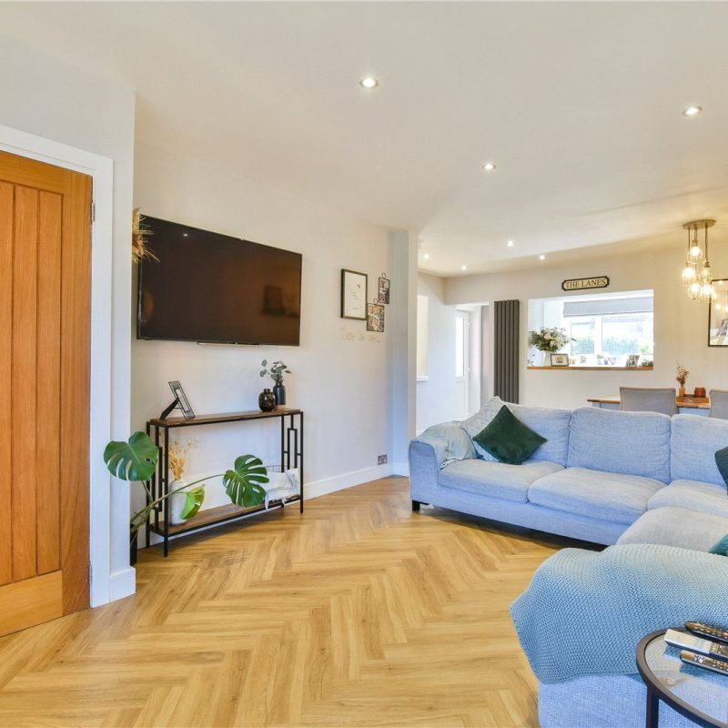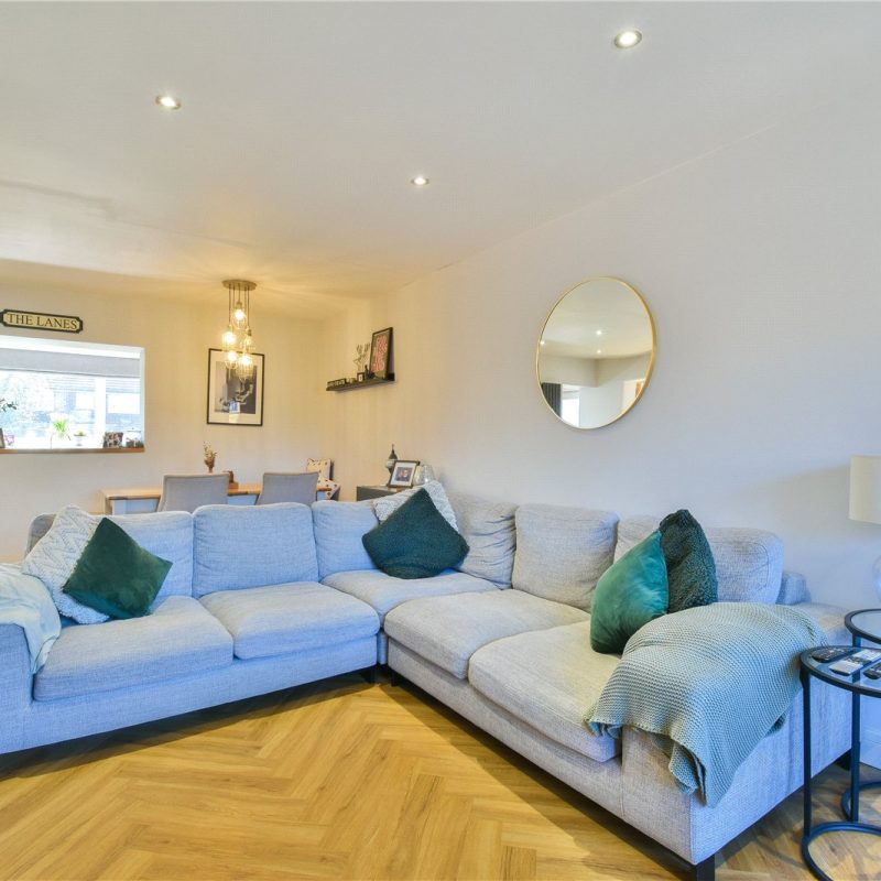 The welcoming entrance porch opens into a bright hallway, where the tone is set by immaculate décor and stunning parquet flooring that flows throughout the open-plan ground floor. The living and dining area is spacious and light-filled—perfect for entertaining or family life—and includes a versatile office or play space. To the rear, a sleek modern kitchen features quality worktops, stylish units, a chic backsplash, and integrated appliances for a seamless finish.