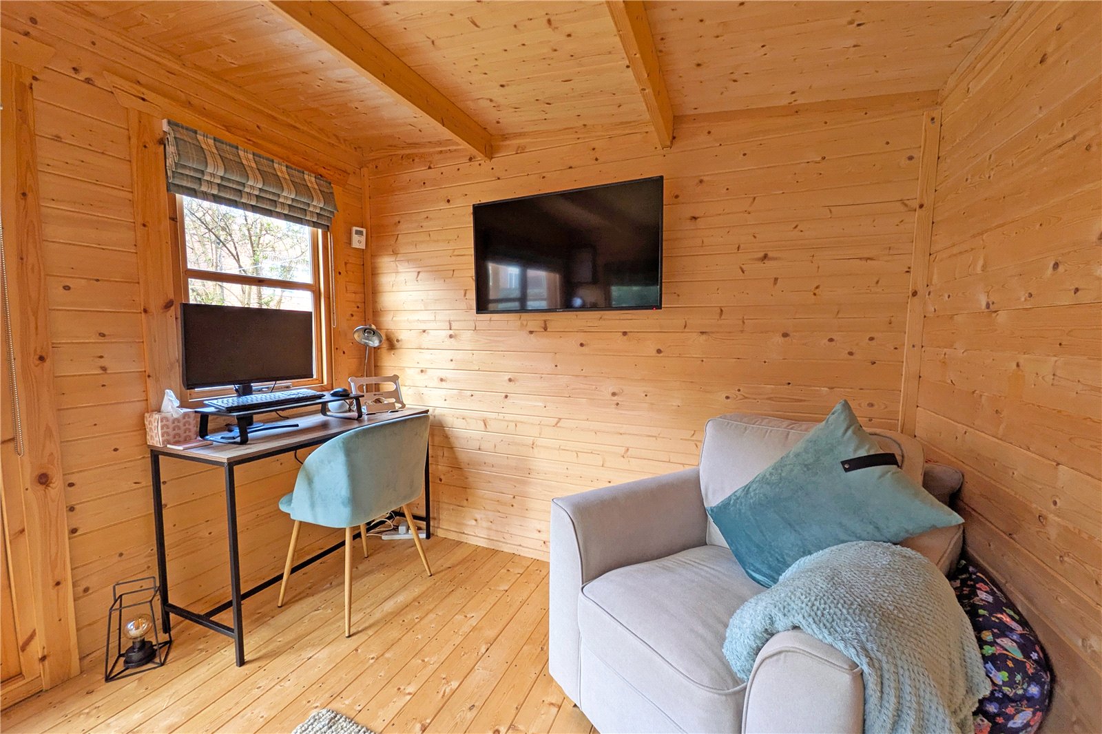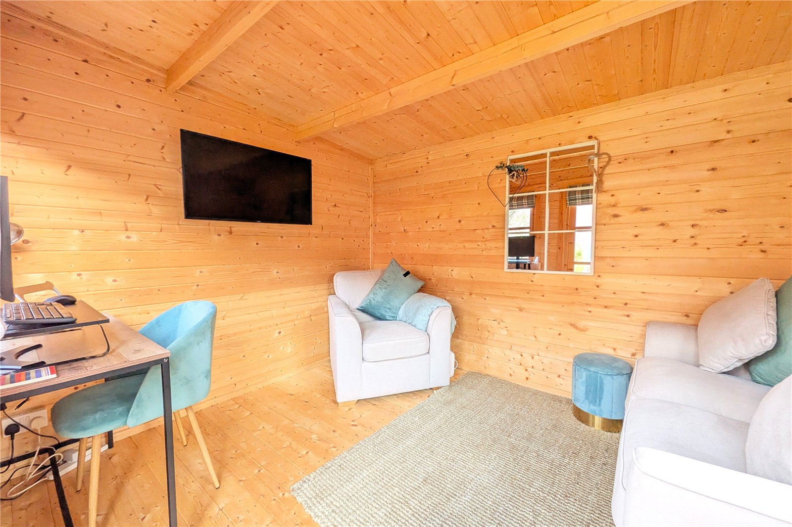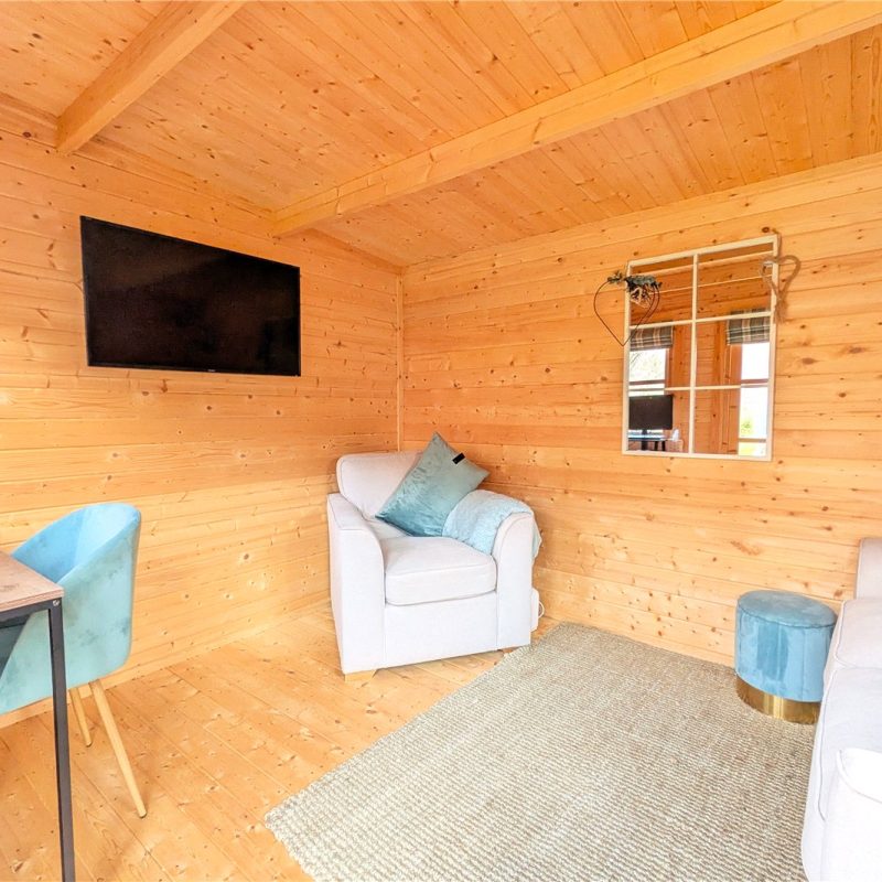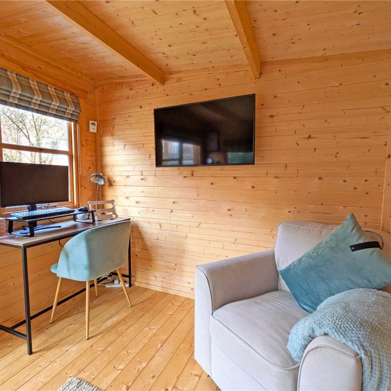 Externally, the property enjoys a large south-facing rear garden, mainly laid to lawn and ideal for enjoying the warmer months. Positioned within the garden is a log cabin / summerhouse currently utilised as a home office, offering an excellent work-from-home or hobby space. To the front is off-road parking.
