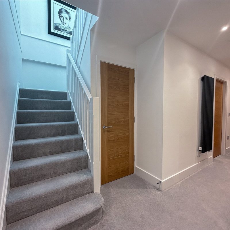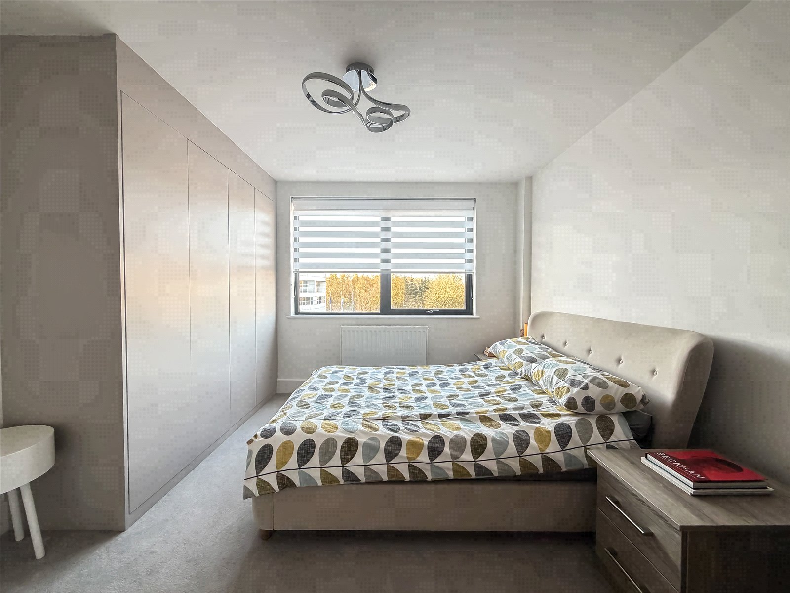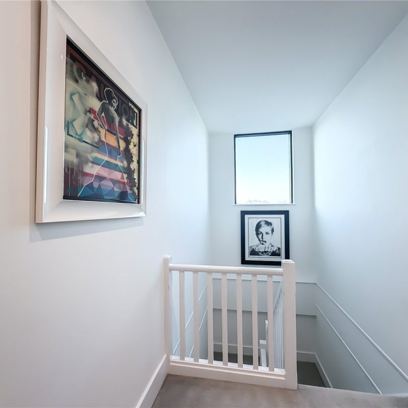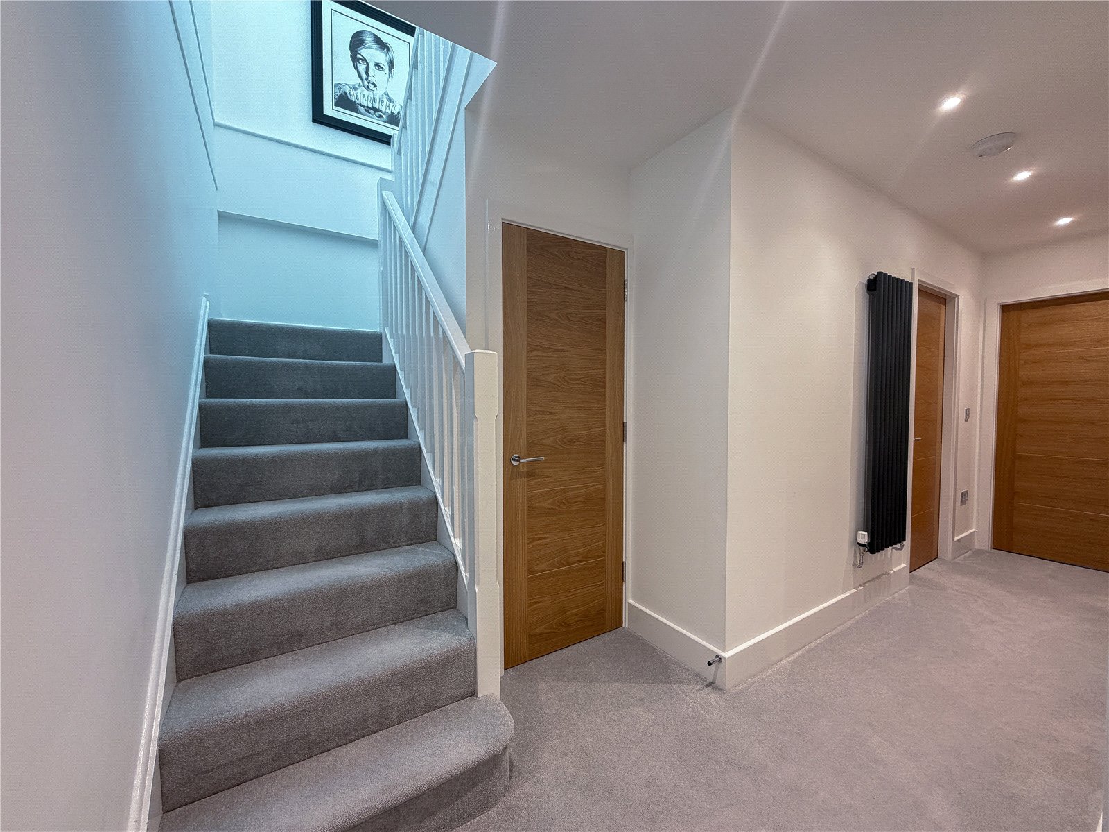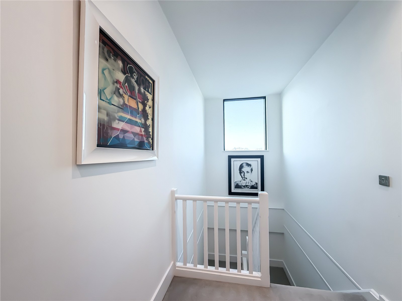 Stairs rise from the entrance hallway to the upper floor, which reveals the impressive principal suite with bespoke built in wardrobes opening to reveal the luxury en-suite shower room. The room is bathed in natural light from large picture windows and the double doors providing access out to the balcony.
