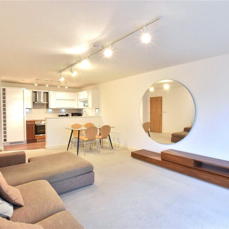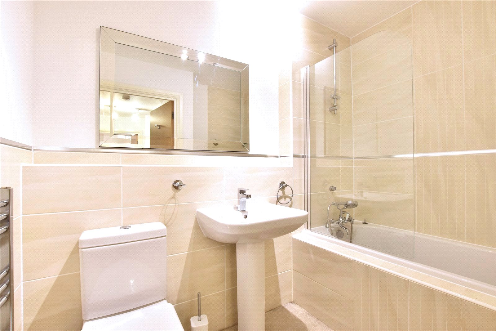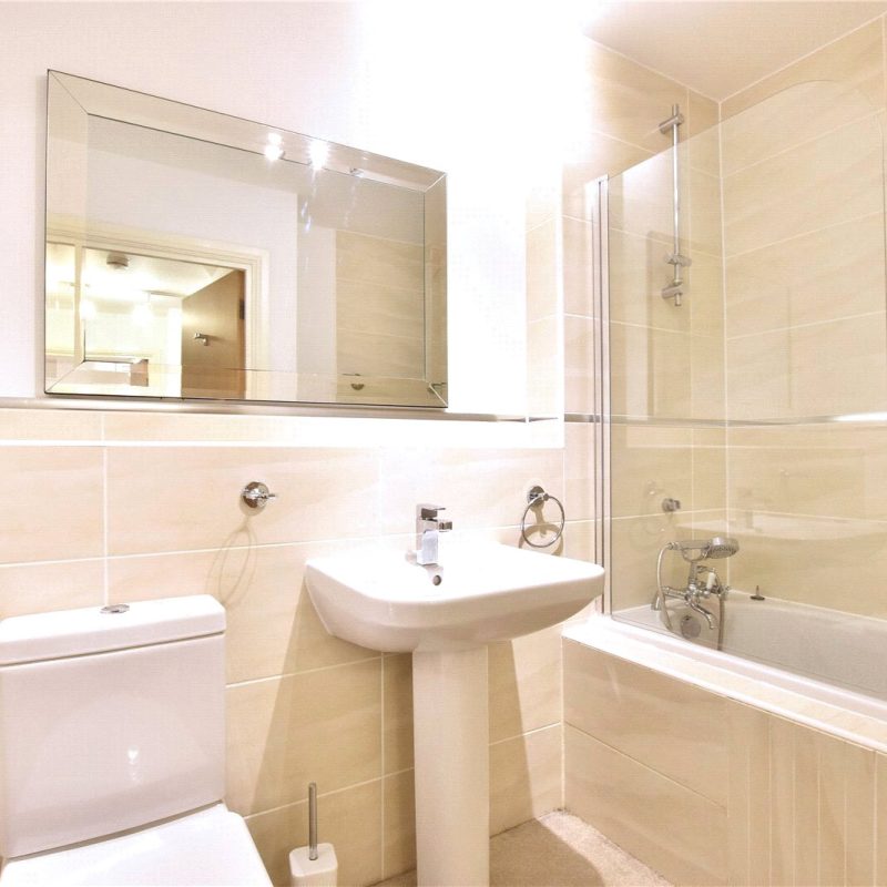 The apartment is further served by a contemporary bathroom suite providing a bath with shower, wash basin, WC and heated towel rail.