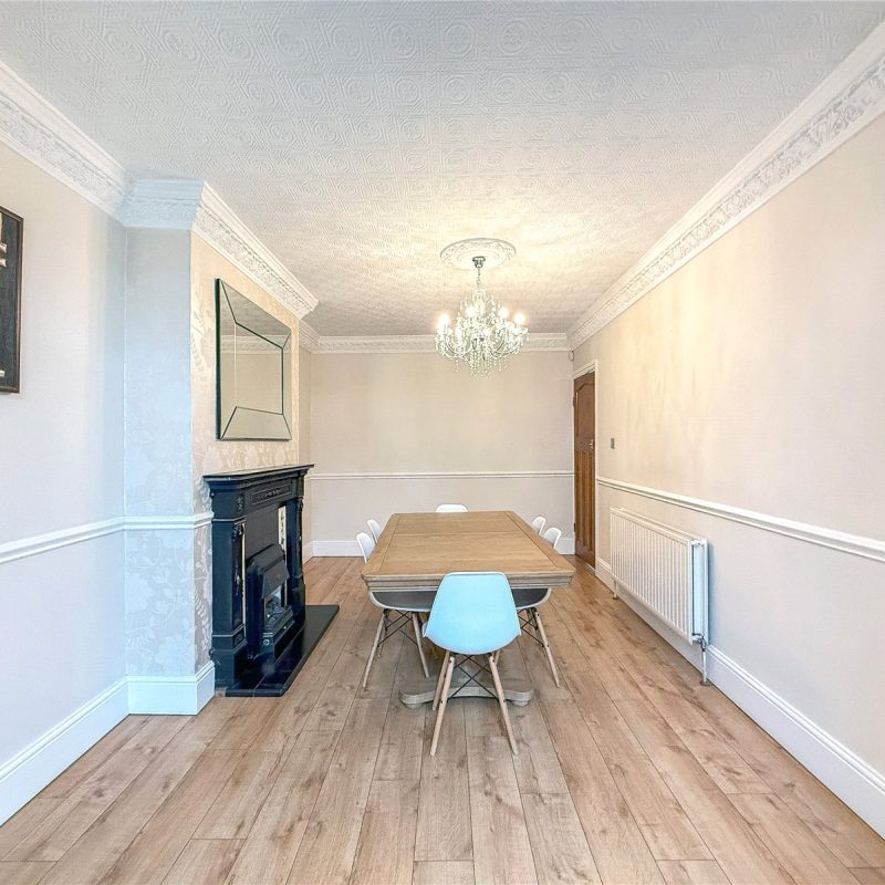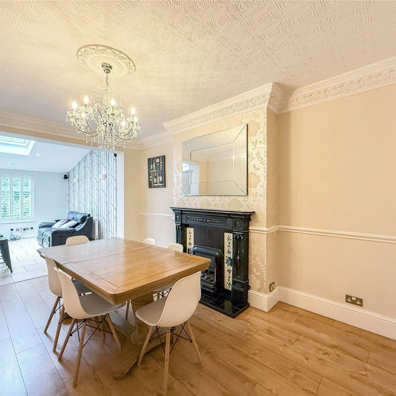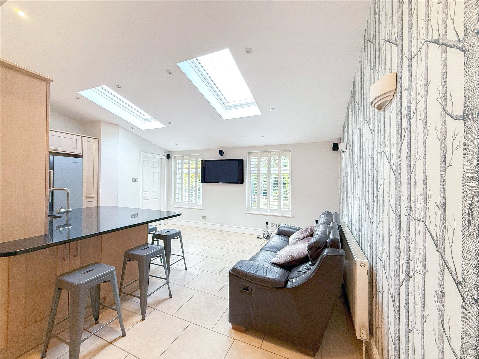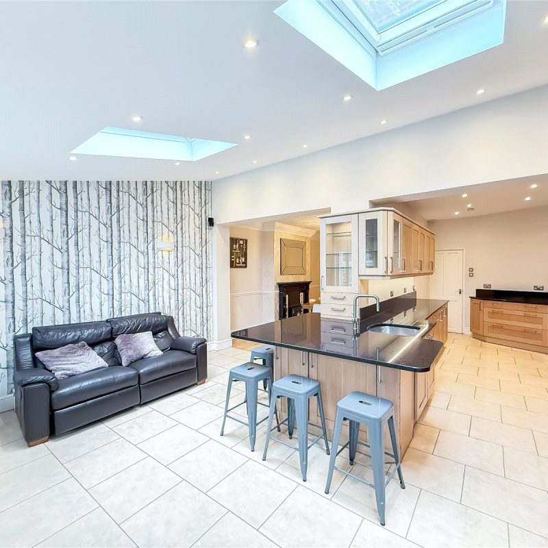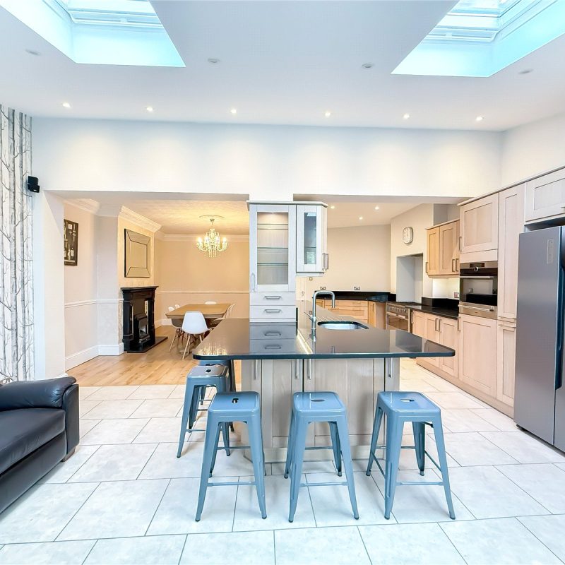 To the rear is an elegantly proportioned dining room, also featuring a decorative fireplace. The dining room opens into the open plan living kitchen. The kitchen is fitted with an ample selection of contemporary base and wall units with breakfast bar – ideal for day-to-day family living. Two tall windows and two roof lights above, flood the room in natural light. The kitchen leads through to the utility room and WC, with a door leading out to the garden.