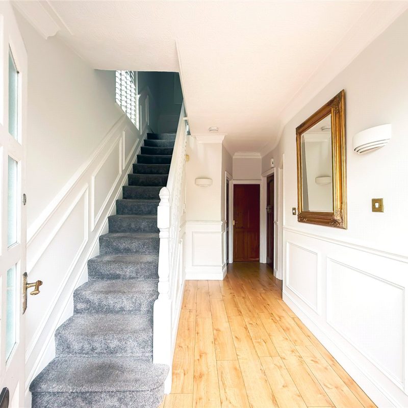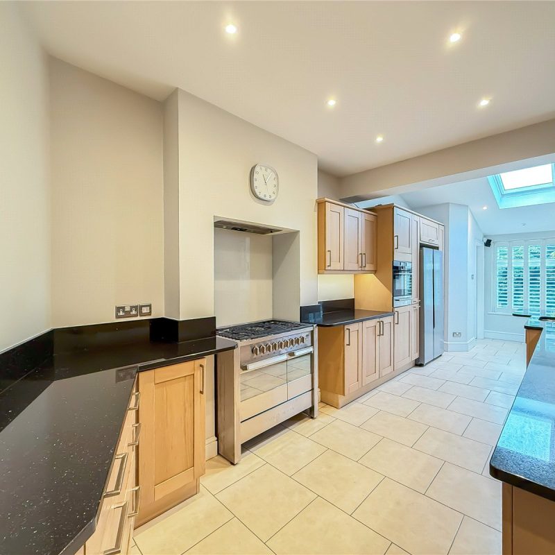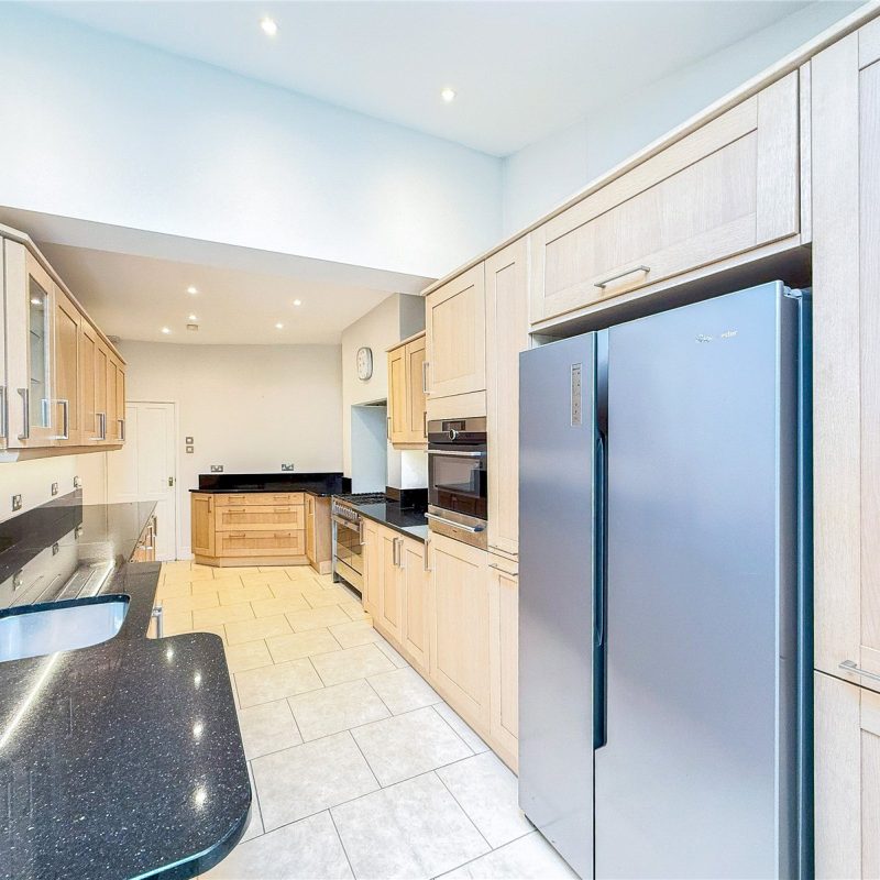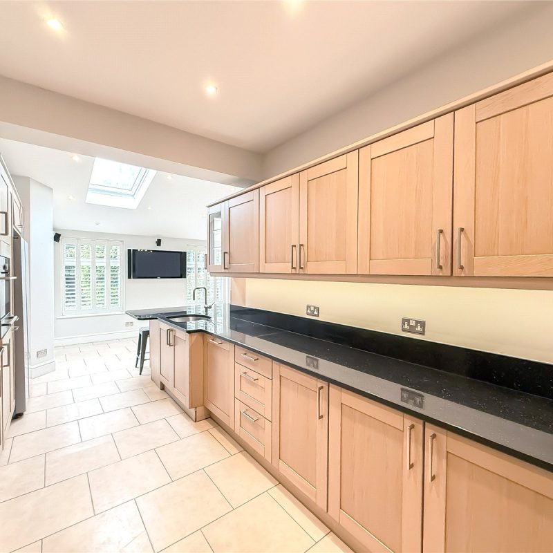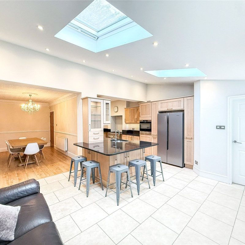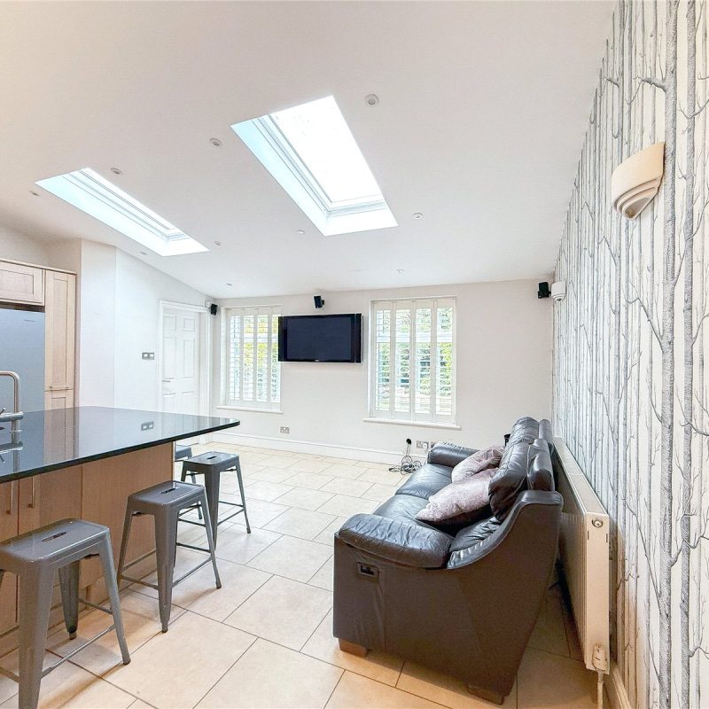 To the rear is an elegantly proportioned dining room, also featuring a decorative fireplace. The dining room opens into the open plan living kitchen. The kitchen is fitted with an ample selection of contemporary base and wall units with breakfast bar – ideal for day-to-day family living. Two tall windows and two roof lights above, flood the room in natural light. The kitchen leads through to the utility room and WC, with a door leading out to the garden.