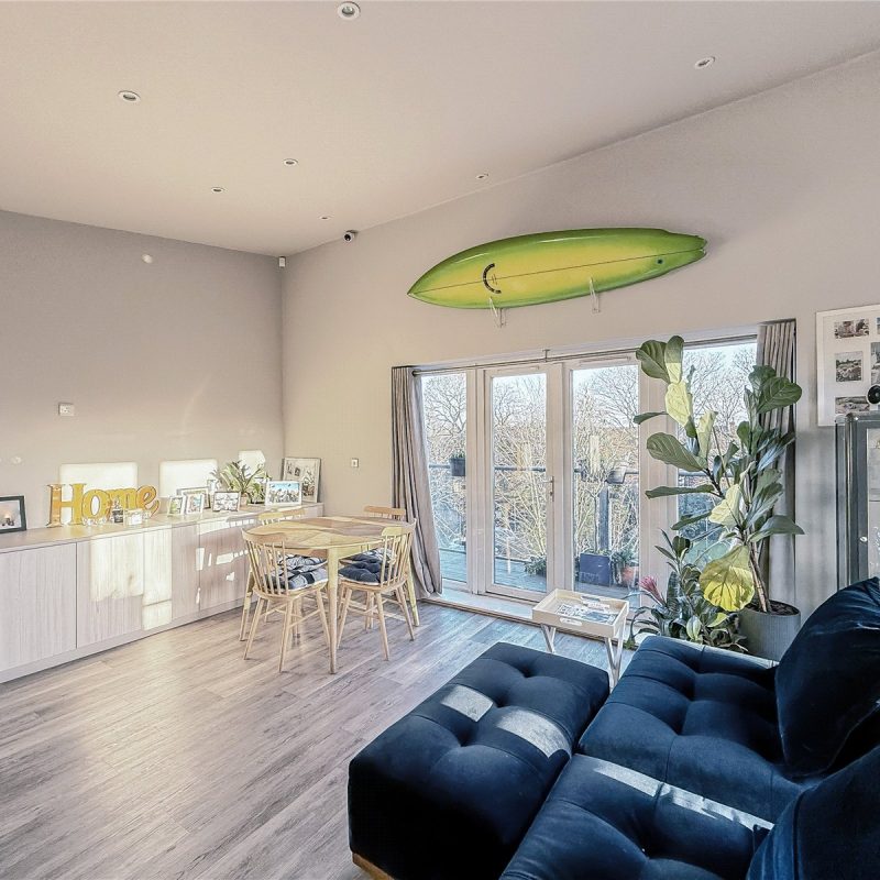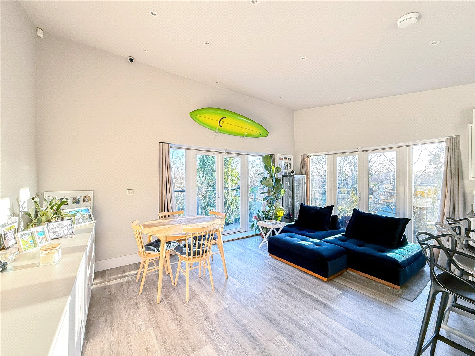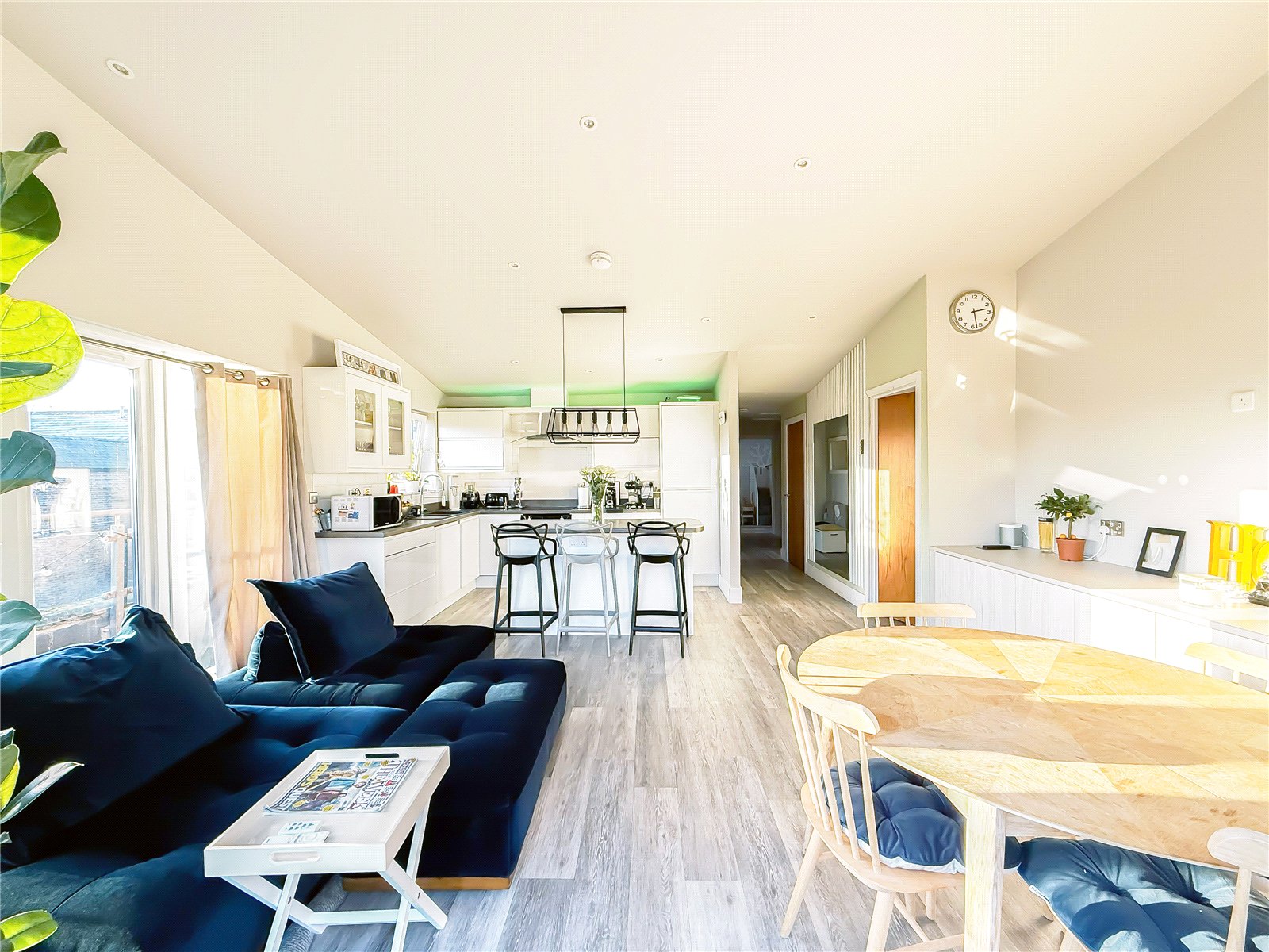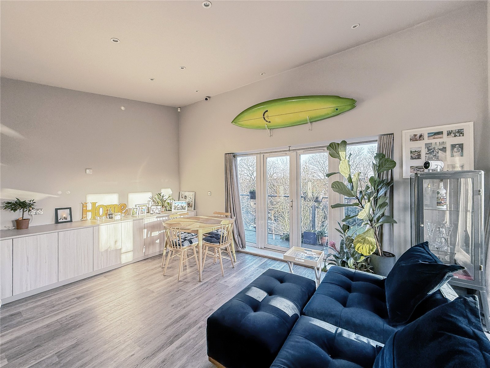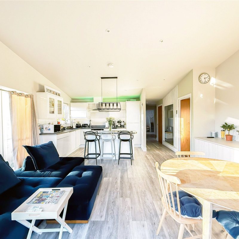 The impressive accommodation reveals; an entrance hall with utility cupboard and cloakroom area. The hallway opens into the bright and spacious open plan contemporary living space, with ample room for both living and dining furniture. The incorporated kitchen, is fitted with a selection of modern kitchen units with feature central island all complemented by integrated appliances. The room is bathed in natural light from dual aspect floor to ceiling windows and double doors out to the balconies.