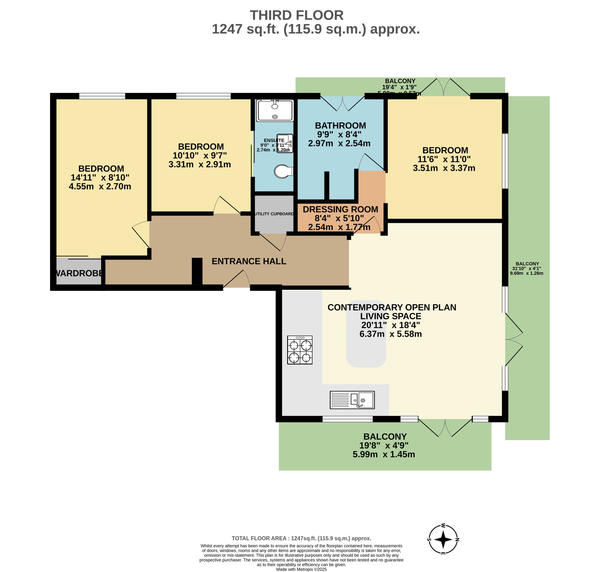 A door from the living room opens into the principal suite with walkthrough dressing room and luxury four piece bathroom. Double doors open out from the bedroom onto a further balcony.