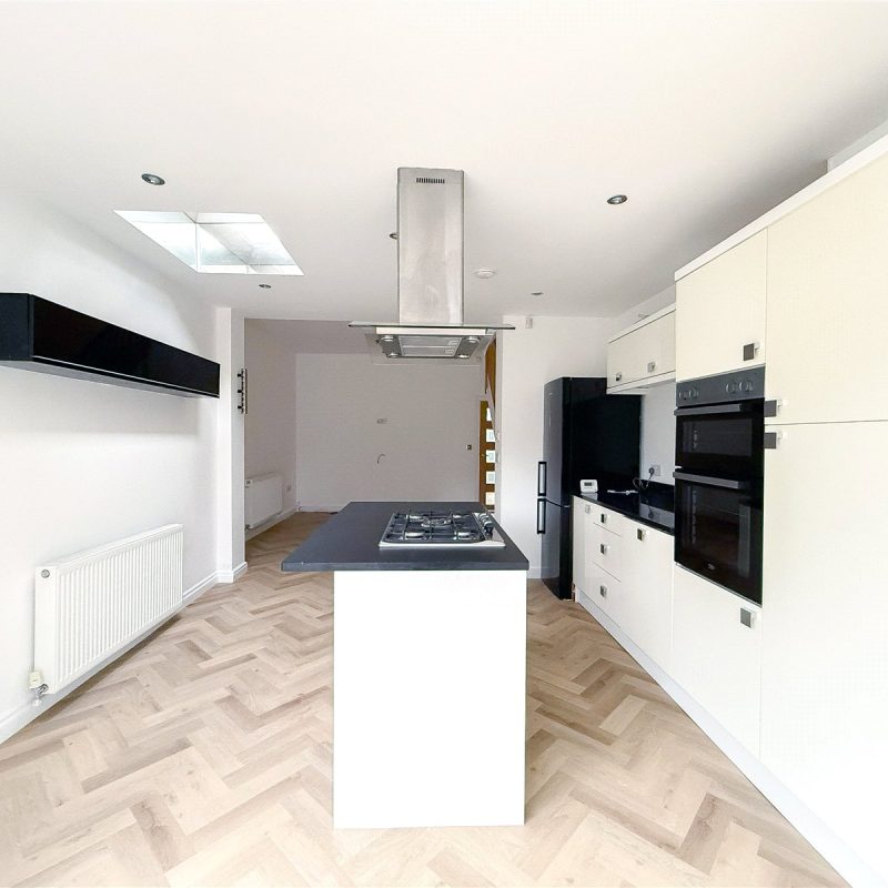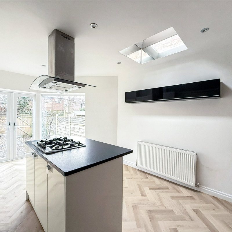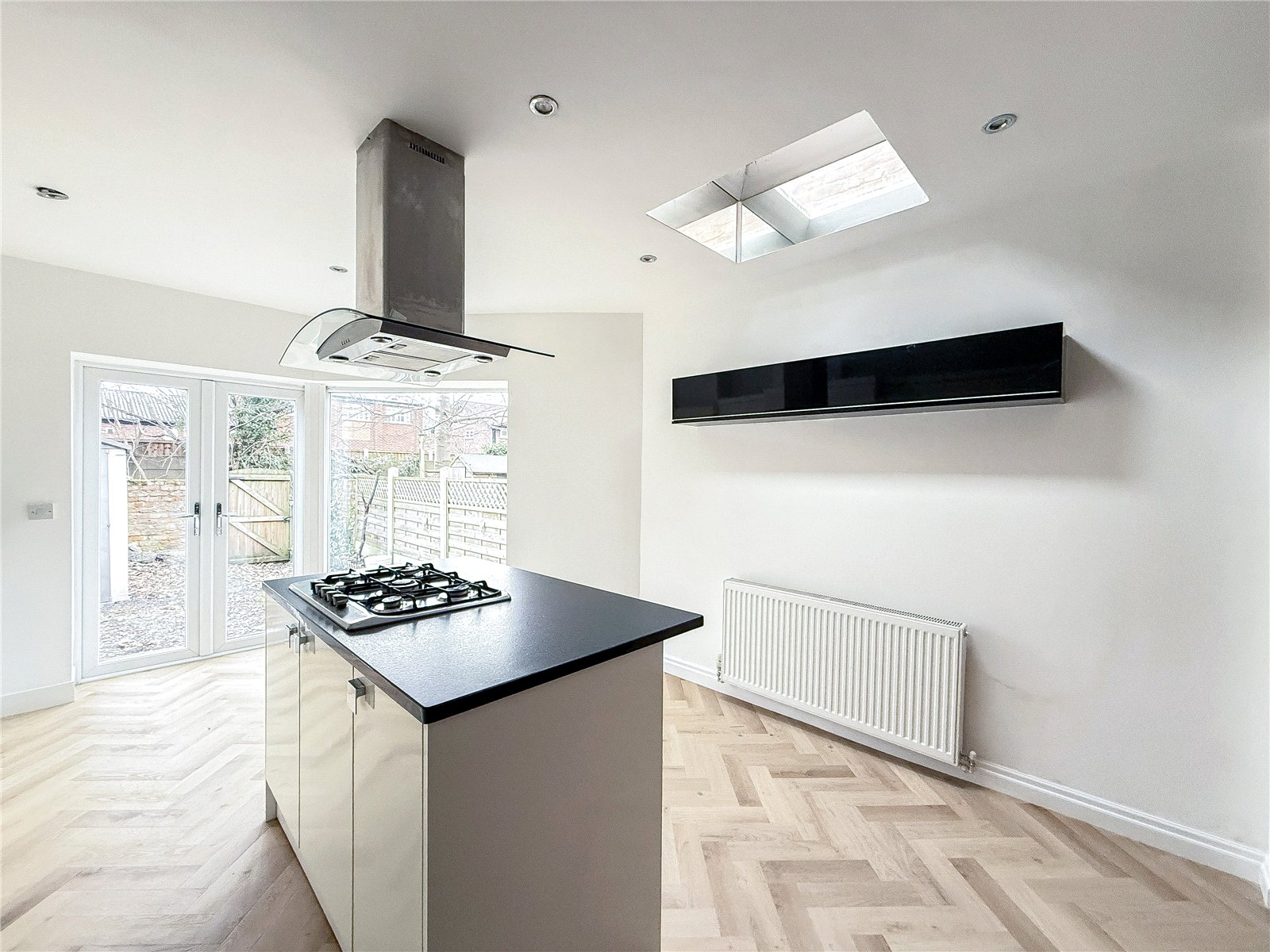 The accommodation consists of an entrance hall opening into the front room. To the rear is the spacious dining room with stairs rising to the first floor. The dining room flows seamlessly through to the open plan kitchen fitted with contemporary units and feature central island. The room is flooded in natural light from the skylight above, large picture window and double doors with views over the garden.