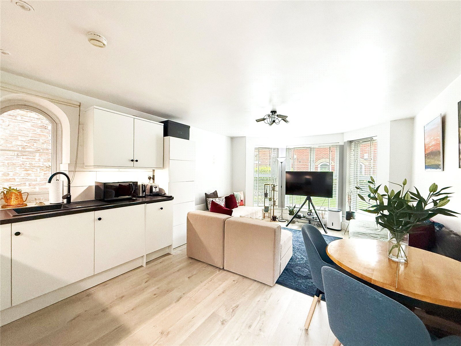 There is a bright and spacious open plan contemporary living space with a large bay window flooding the room with natural light. Incorporated is the modern kitchen fitted with a selection of base and wall units and space for a dining table and chairs.