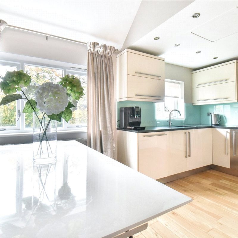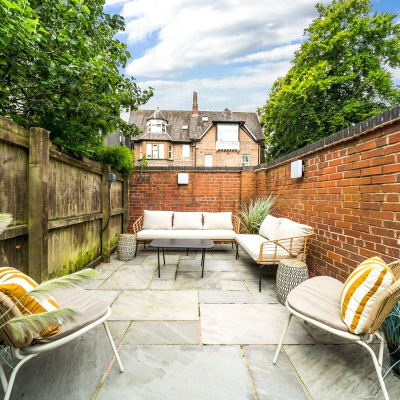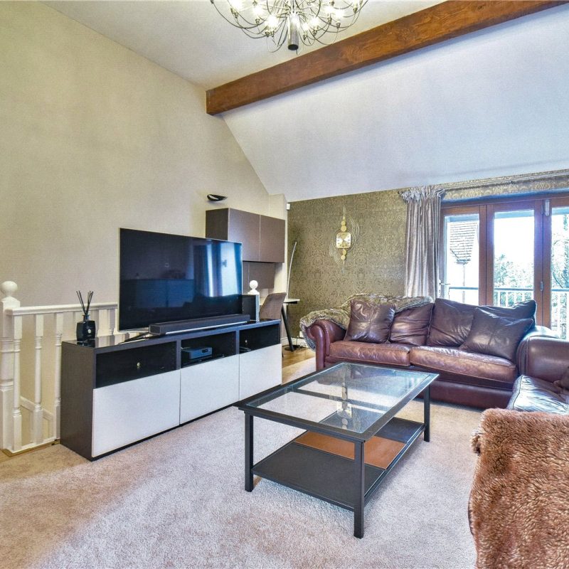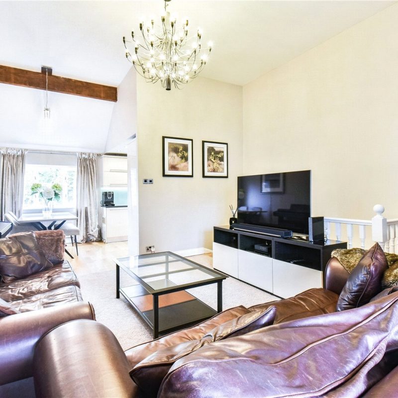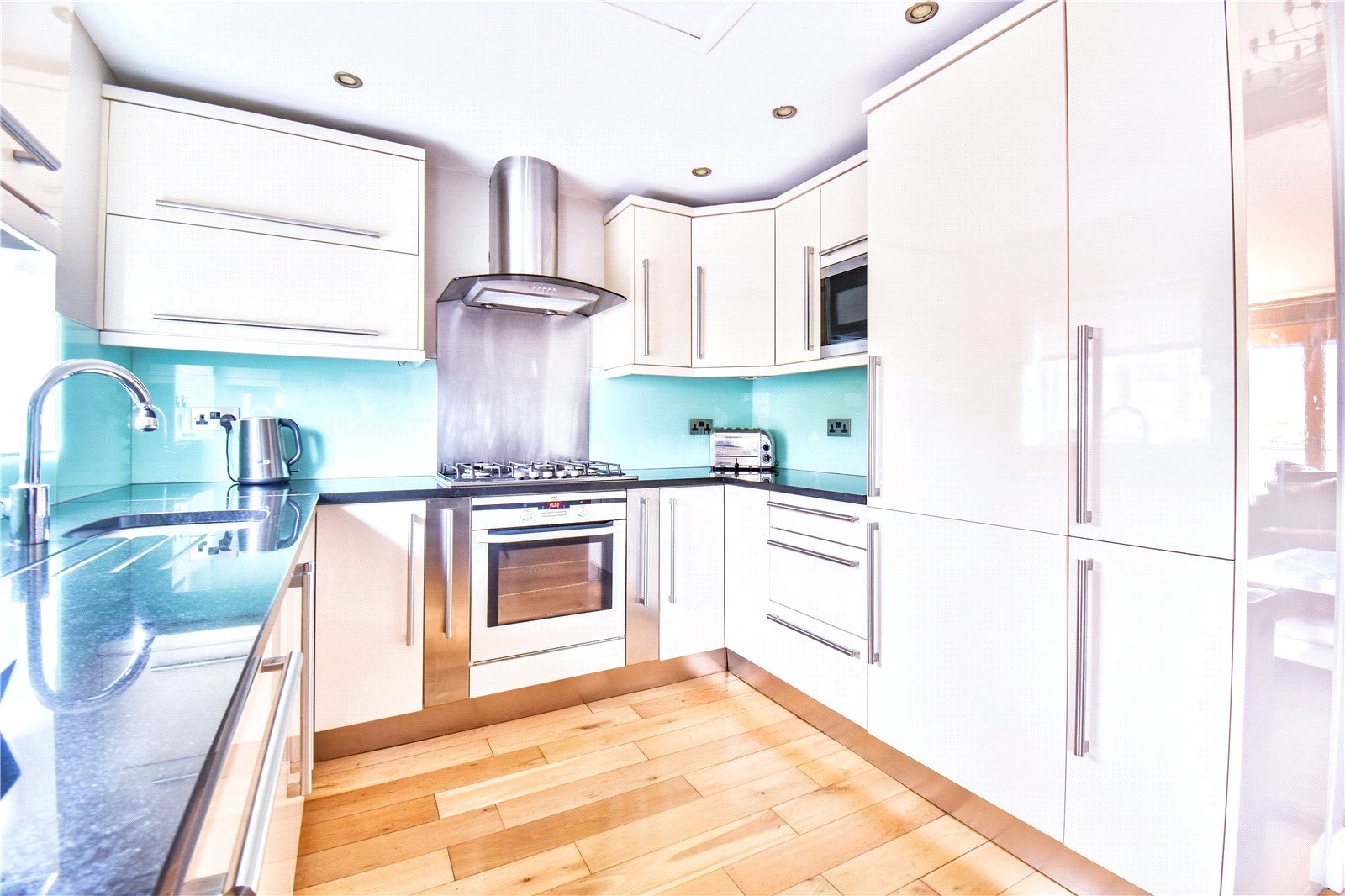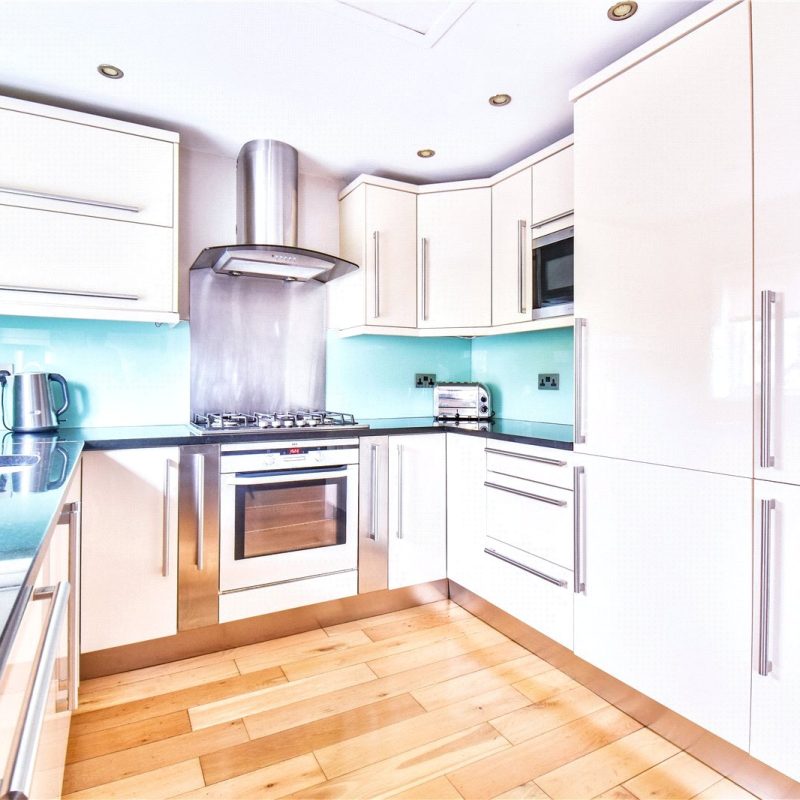 The second floor is taken up by the generously sized, impressive living room with balcony. The balcony has been recently upgraded with decking and bi-fold doors to open up the space further. The living room opens into the open plan kitchen/dining area, which is fitted with a range of sleek contemporary units complimented by granite tops and integrated AEG appliances. There is ample room for dining furniture, providing the perfect space for informal dining.