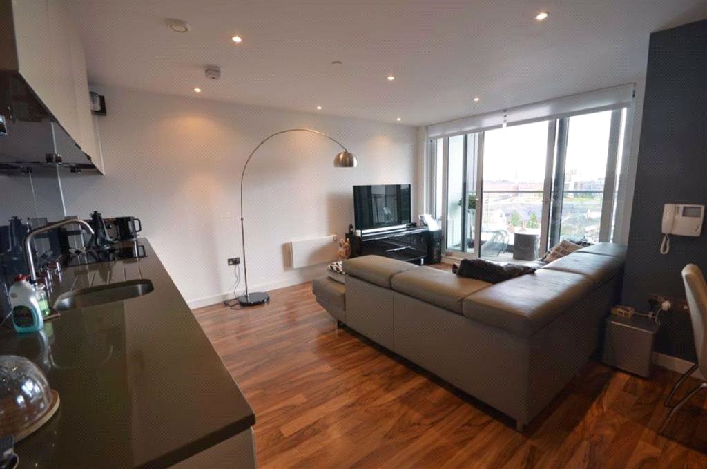 A fantastic open plan living space with floor to ceiling sliding doors opening to the balcony over looking the canal, bringing in lots of light to create a bright living space. With high quality wood laminate flooring, the living area has TV point, wall mounted electric heater space for living and dining furniture and access to the utility cupboard with hot water cylinder and washer dryer. The kitchen is fitted with a modern range of high spec gloss base and wall units with glazed splash backs and granite work tops with sink unit inset and mixer tap over, integrated four ring halogen hob with electric oven below and extractor hood above, integrated dishwasher and fridge.