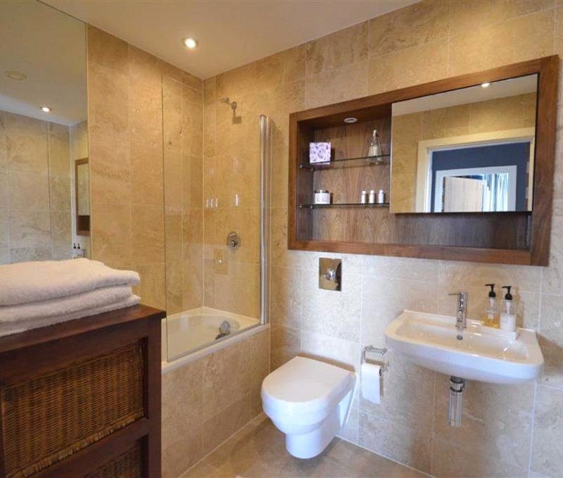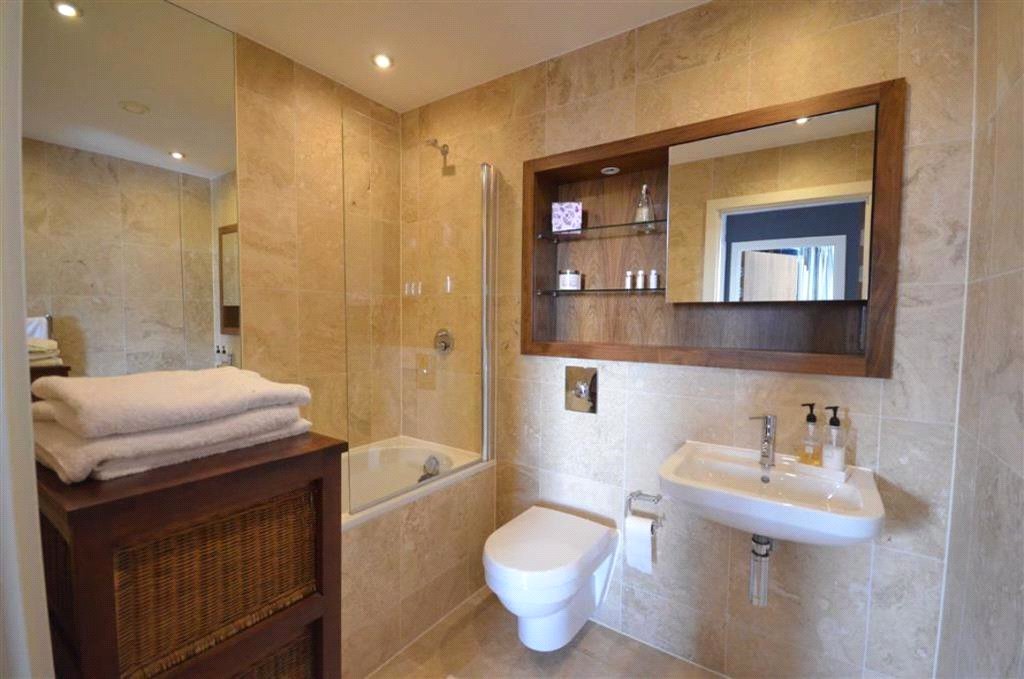 Fitted with a white Villeroy and Boch white suite with designer fittings, comprises; bath with shower attachments over with glazed shower screen, wash hand basin, low level WC, tiled walls and flooring, recessed vanity unit with mirror, heated towel rail and extractor fan.