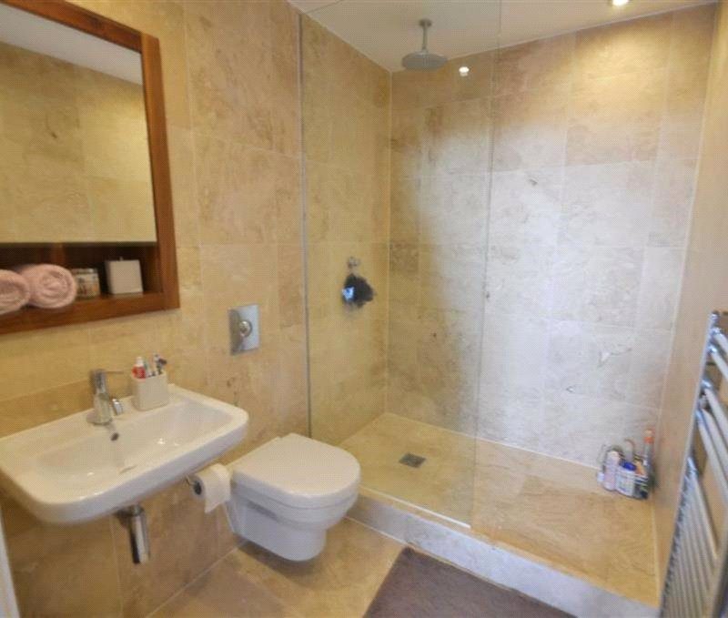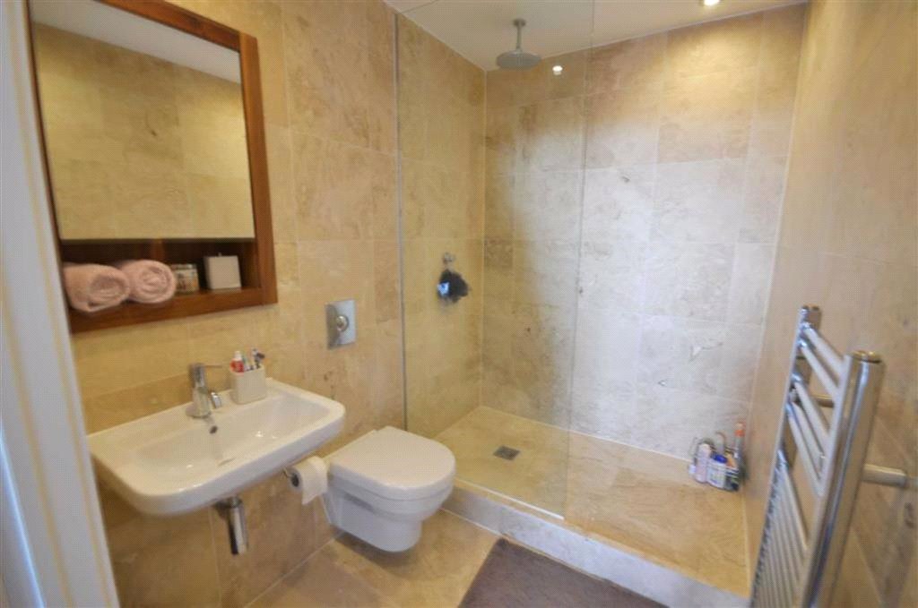 Fitted with a contemporary white Villeroy and Boch suite with designer fittings, comprises; fully tiled shower cubicle with glass screen and rain shower head, wash hand basin, WC, fully tiled walls and flooring, recessed vanity cupboard with mirror, extractor fan and wall mounted heated towel rail.